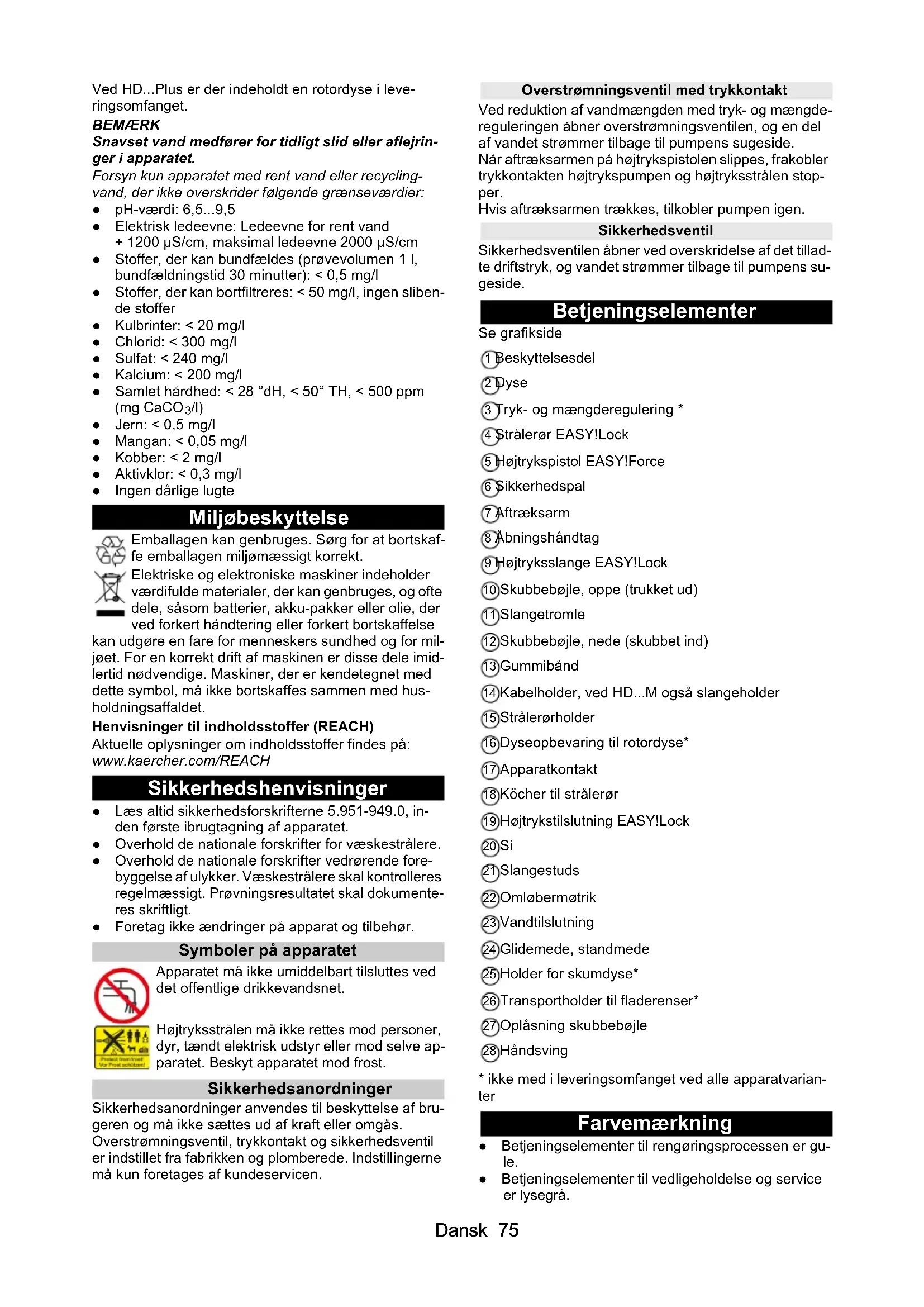 /l) ● Jern: < 0,5 mg/l ● Mangan: < 0,05 mg/l ● Kobber: < 2 mg/l ● Aktivklor: < 0,3 mg/l ● Ingen dårlige lugte Miljøbeskyttelse Emballagen kan genbruges. Sørg for at bortskaf- fe emballagen miljømæssigt korrekt. Elektriske og elektroniske maskiner indeholder værdifulde materialer, der kan genbruges, og ofte dele, såsom batterier, akku-pakker eller olie, der ved forkert håndtering eller forkert bortskaffelse kan udgøre en fare for menneskers sundhed og for mil- jøet. For en korrekt drift af maskinen er disse dele imid- lertid nødvendige. Maskiner, der er kendetegnet med dette symbol, må ikke bortskaffes sammen med hus- holdningsaffaldet. Henvisninger til indholdsstoffer (REACH) Aktuelle oplysninger om indholdsstoffer findes på: www.kaercher.com/REACH Sikkerhedshenvisninger ● Læs altid sikkerhedsforskrifterne 5.951-949.0, in- den første ibrugtagning af apparatet. ● Overhold de nationale forskrifter for væskestrålere. ● Overhold de nationale forskrifter vedrørende fore- byggelse af ulykker. Væskestrålere skal kontrolleres regelmæssigt. Prøvningsresultatet skal dokumente- res skriftligt. ● Foretag ikke ændringer på apparat og tilbehør. Symboler på apparatet Apparatet må ikke umiddelbart tilsluttes ved det offentlige drikkevandsnet. Højtryksstrålen må ikke rettes mod personer, dyr, tændt elektrisk udstyr eller mod selve ap- paratet. Beskyt apparatet mod frost. Sikkerhedsanordninger Sikkerhedsanordninger anvendes til beskyttelse af bru- geren og må ikke sættes ud af kraft eller omgås. Overstrømningsventil, trykkontakt og sikkerhedsventil er indstillet fra fabrikken og plomberede. Indstillingerne må kun foretages af kundeservicen. Overstrømningsventil med trykkontakt Ved reduktion af vandmængden med tryk- og mængde- reguleringen åbner overstrømningsventilen, og en del af vandet strømmer tilbage til pumpens sugeside. Når aftræksarmen på højtrykspistolen slippes, frakobler trykkontakten højtrykspumpen og højtryksstrålen stop- per. Hvis aftræksarmen trækkes, tilkobler pumpen igen. Sikkerhedsventil Sikkerhedsventilen åbner ved overskridelse af det tillad- te driftstryk, og vandet strømmer tilbage til pumpens su- geside. Betjeningselementer Se grafikside 1 Beskyttelsesdel 2 Dyse 3 Tryk- og mængderegulering * 4 Strålerør EASY!Lock 5 Højtrykspistol EASY!Force 6 Sikkerhedspal 7 Aftræksarm 8 Åbningshåndtag 9 Højtryksslange EASY!Lock 10 Skubbebøjle, oppe (trukket ud) 11 Slangetromle 12 Skubbebøjle, nede (skubbet ind) 13 Gummibånd 14 Kabelholder, ved HD...M også slangeholder 15 Strålerørholder 16 Dyseopbevaring til rotordyse* 17 Apparatkontakt 18 Köcher til strålerør 19 Højtrykstilslutning EASY!Lock 20 Si 21 Slangestuds 22 Omløbermøtrik 23 Vandtilslutning 24 Glidemede, standmede 25 Holder for skumdyse* 26 Transportholder til fladerenser* 27 Oplåsning skubbebøjle 28 Håndsving