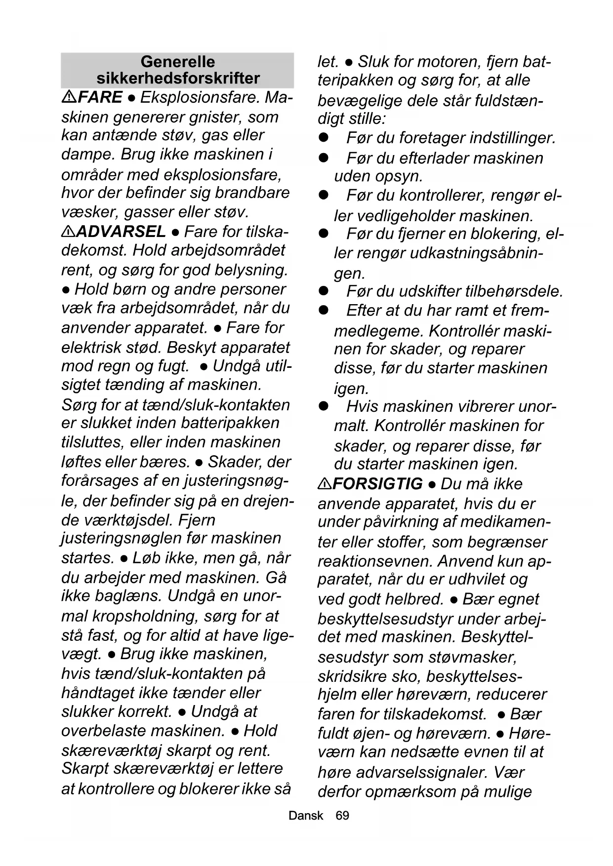 - EU-overensstemmelseserklæring Chairman of the Board of ManagementDirector Regulatory Affairs & Certification H. Jenner S. ReiserDansk 69 Generelle sikkerhedsforskrifter FARE ● Eksplosionsfare. Ma- skinen genererer gnister, som kan antænde støv, gas eller dampe. Brug ikke maskinen i områder med eksplosionsfare, hvor der befinder sig brandbare væsker, gasser eller støv. 몇 ADVARSEL ● Fare for tilska- dekomst. Hold arbejdsområdet rent, og sørg for god belysning. ● Hold børn og andre personer væk fra arbejdsområdet, når du anvender apparatet. ● Fare for elektrisk stød. Beskyt apparatet mod regn og fugt. ● Undgå util- sigtet tænding af maskinen. Sørg for at tænd/sluk-kontakten er slukket inden batteripakken tilsluttes, eller inden maskinen løftes eller bæres. ● Skader, der forårsages af en justeringsnøg- le, der befinder sig på en drejen- de værktøjsdel. Fjern justeringsnøglen før maskinen startes. ● Løb ikke, men gå, når du arbejder med maskinen. Gå ikke baglæns. Undgå en unor- mal kropsholdning, sørg for at stå fast, og for altid at have lige- vægt. ● Brug ikke maskinen, hvis tænd/sluk-kontakten på håndtaget ikke tænder eller slukker korrekt. ● Undgå at overbelaste maskinen. ● Hold skæreværktøj skarpt og rent. Skarpt skæreværktøj er lettere at kontrollere og blokerer ikke så let. ● Sluk for motoren, fjern bat- teripakken og sørg for, at alle bevægelige dele står fuldstæn- digt stille: Før du foretager indstillinger. Før du efterlader maskinen uden opsyn. Før du kontrollerer, rengør el- ler vedligeholder maskinen. Før du fjerner en blokering, el- ler rengør udkastningsåbnin- gen. Før du udskifter tilbehørsdele. Efter at du har ramt et frem- medlegeme. Kontrollér maski- nen for skader, og reparer disse, før du starter maskinen igen. Hvis maskinen vibrerer unor- malt. Kontrollér maskinen for skader, og reparer disse, før du starter maskinen igen. 몇 FORSIGTIG ● Du må ikke anvende apparatet, hvis du er under påvirkning af medikamen- ter eller stoffer, som begrænser reaktionsevnen. Anvend kun ap- paratet, når du er udhvilet og ved godt helbred. ● Bær egnet beskyttelsesudstyr under arbej- det med maskinen. Beskyttel- sesudstyr som støvmasker, skridsikre sko, beskyttelses- hjelm eller høreværn, reducerer faren for tilskadekomst. ● Bær fuldt øjen- og høreværn. ● Høre- værn kan nedsætte evnen til at høre advarselssignaler. Vær derfor opmærksom på mulige70 Dansk farer i nærheden og i arbejds- området. ● Bær hovedbeskyttel- se under arbejder i områder, hvor der er fare for nedfaldende genstande.ADVARSEL ● Bær lange, kraftige bukser, langær- met tøj og skridsikre støvler ved arbejde med maskinen. Arbejd ikke uden fodtøj. Bær ikke san- daler eller shorts. Undgå løstsid- dende tøj eller tøj med snører og bånd.FORSIGTIG ● Der er fare for tilskadekomst, hvis løst sid- dende tøj, hår eller smykker bli- ver grebet af maskinens bevægelige dele. Hold tøj og smykker væk fra maskinens be- vægelige dele. Sæt langt hår op i en hestehale. ● Anvend kun maskinen og dens tilbehør i hen- hold til disse anvisninger, og tag arbejdsbetingelserne og ar- bejdsopgaven i betragtning for at undgå farlige situationer. Sikker drift FARE ● Alvorlig tilskade- komst, hvis genstande slynges væk af skærekniven, eller tråd eller snor vikles ind i skære- værktøjet. Undersøg omhygge- ligt arbejdsområdet for genstande såsom sten, kæppe, metal, tråd, knogler eller legetøj, og fjern det, før du bruger maski- nen. 몇 ADVARSEL ● Denne maski- ne er ikke beregnet til at skulle anvendes af børn eller personer med begrænsede fysiske, sensoriske eller mentale evner, eller personer, der ikke er fortro- lige med anvisningerne. ● An- vend kun maskinen ved dagslys eller ved god, kunstig belysning. ● Anvend ikke maskinen i vådt græs eller i regnvejr. ● Hold en minimumsafstand på 15 m til personer og dyr. Stands maski- nen, hvis nogen kommer inden for dette område. ● Hold skære- delen under hoftehøjde. ● An- vend aldrig maskinen med beskadigede sikkerhedsanord- ninger, eller uden monterede sikkerhedsanordninger. ● An- vend aldrig skæretråde af metal. ● Anvend kun maskinen uden- dørs. ● Sørg for at holde hæn- der og fødder væk fra skærearbejdsområdet, især når motoren startes. ● Fare for til- skadekomst, skæreværktøjet fortsætter med at dreje rundt, ef- ter du har slukket motoren. ● Fa- re for tilskadekomst. Kniven på sikkerhedsafdækningen, til af- kortning af skæretråden, er me- get skarp. Undgå enhver kontakt hermed, især i forbindelse med rengøring. ● Sørg for, at ventila- tionsåbningerne er fri for aflejrin- ger. ● Kontrollér maskinen for skader før hver anvendelse og efter hvert slag. Beskadigede dele, f.eks. en kontakt, skal re- pareres eller udskiftes af den autoriserede kundeservice.Dansk 71 ● Sørg for, at drevets hoveddel er korrekt monteret og fastgjort. ● Sørg for, at alle beskyttelses- anordninger, afbøjere og greb er fastgjort korrekt og sikkert. ● Sørg før hver anvendelse for, at trådskæreren er placeret kor- rekt og sikret. ● Anvend kun pro- ducentens skæretråd til udskiftning. Anvend ingen an- den skæredel. ● Fare for kvæ- stelser. Foretag ingen ændringer på maskinen. Obs ● I nogle regioner kan for- skrifter indskrænke anvendel- sen af denne maskine. Spørg de lokale myndigheder til råds. Sikker vedligeholdelse og pleje 몇 ADVARSEL ● Når du har skubbet en ny tråd ud, skal du først bringe maskinen i normal driftsposition, før du tænder for den. ● Kontrollér, at maskinen er i sikker tilstand ved regelmæs- sigt at kontrollere, at bolte, møt- rikker og skruer er spændt. ● Kontrollér, om de bevægelige dele fungerer korrekt og ikke er blokeret, og om dele er brækket eller beskadiget. Få en beskadi- get maskine repareret før du an- vender den. ● Sluk for motoren, fjern ba