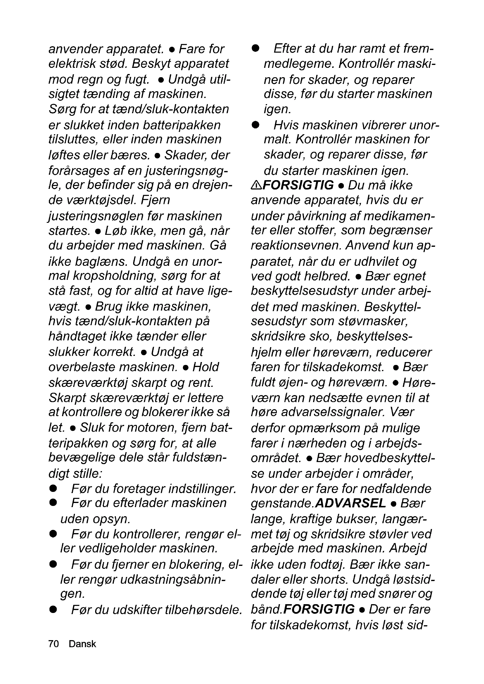 - EU-overensstemmelseserklæring Chairman of the Board of ManagementDirector Regulatory Affairs & Certification H. Jenner S. Reiser70 Dansk anvender apparatet. ● Fare for elektrisk stød. Beskyt apparatet mod regn og fugt. ● Undgå util- sigtet tænding af maskinen. Sørg for at tænd/sluk-kontakten er slukket inden batteripakken tilsluttes, eller inden maskinen løftes eller bæres. ● Skader, der forårsages af en justeringsnøg- le, der befinder sig på en drejen- de værktøjsdel. Fjern justeringsnøglen før maskinen startes. ● Løb ikke, men gå, når du arbejder med maskinen. Gå ikke baglæns. Undgå en unor- mal kropsholdning, sørg for at stå fast, og for altid at have lige- vægt. ● Brug ikke maskinen, hvis tænd/sluk-kontakten på håndtaget ikke tænder eller slukker korrekt. ● Undgå at overbelaste maskinen. ● Hold skæreværktøj skarpt og rent. Skarpt skæreværktøj er lettere at kontrollere og blokerer ikke så let. ● Sluk for motoren, fjern bat- teripakken og sørg for, at alle bevægelige dele står fuldstæn- digt stille: Før du foretager indstillinger. Før du efterlader maskinen uden opsyn. Før du kontrollerer, rengør el- ler vedligeholder maskinen. Før du fjerner en blokering, el- ler rengør udkastningsåbnin- gen. Før du udskifter tilbehørsdele. Efter at du har ramt et frem- medlegeme. Kontrollér maski- nen for skader, og reparer disse, før du starter maskinen igen. Hvis maskinen vibrerer unor- malt. Kontrollér maskinen for skader, og reparer disse, før du starter maskinen igen. 몇 FORSIGTIG ● Du må ikke anvende apparatet, hvis du er under påvirkning af medikamen- ter eller stoffer, som begrænser reaktionsevnen. Anvend kun ap- paratet, når du er udhvilet og ved godt helbred. ● Bær egnet beskyttelsesudstyr under arbej- det med maskinen. Beskyttel- sesudstyr som støvmasker, skridsikre sko, beskyttelses- hjelm eller høreværn, reducerer faren for tilskadekomst. ● Bær fuldt øjen- og høreværn. ● Høre- værn kan nedsætte evnen til at høre advarselssignaler. Vær derfor opmærksom på mulige farer i nærheden og i arbejds- området. ● Bær hovedbeskyttel- se under arbejder i områder, hvor der er fare for nedfaldende genstande.ADVARSEL ● Bær lange, kraftige bukser, langær- met tøj og skridsikre støvler ved arbejde med maskinen. Arbejd ikke uden fodtøj. Bær ikke san- daler eller shorts. Undgå løstsid- dende tøj eller tøj med snører og bånd.FORSIGTIG ● Der er fare for tilskadekomst, hvis løst sid-Dansk 71 dende tøj, hår eller smykker bli- ver grebet af maskinens bevægelige dele. Hold tøj og smykker væk fra maskinens be- vægelige dele. Sæt langt hår op i en hestehale. ● Anvend kun maskinen og dens tilbehør i hen- hold til disse anvisninger, og tag arbejdsbetingelserne og ar- bejdsopgaven i betragtning for at undgå farlige situationer. Sikker drift FARE ● Alvorlig tilskade- komst, hvis genstande slynges væk af skærekniven, eller tråd eller snor vikles ind i skære- værktøjet. Undersøg omhygge- ligt arbejdsområdet for genstande såsom sten, kæppe, metal, tråd, knogler eller legetøj, og fjern det, før du bruger maski- nen. 몇 ADVARSEL ● Denne maski- ne er ikke beregnet til at skulle anvendes af børn eller personer med begrænsede fysiske, sensoriske eller mentale evner, eller personer, der ikke er fortro- lige med anvisningerne. ● An- vend kun maskinen ved dagslys eller ved god, kunstig belysning. ● Anvend ikke maskinen i vådt græs eller i regnvejr. ● Hold en minimumsafstand på 15 m til personer og dyr. Stands maski- nen, hvis nogen kommer inden for dette område. ● Hold skære- delen under hoftehøjde. ● An- vend aldrig maskinen med beskadigede sikkerhedsanord- ninger, eller uden monterede sikkerhedsanordninger. ● An- vend aldrig skæretråde af metal. ● Anvend kun maskinen uden- dørs. ● Sørg for at holde hæn- der og fødder væk fra skærearbejdsområdet, især når motoren startes. ● Fare for til- skadekomst, skæreværktøjet fortsætter med at dreje rundt, ef- ter du har slukket motoren. ● Fa- re for tilskadekomst. Kniven på sikkerhedsafdækningen, til af- kortning af skæretråden, er me- get skarp. Undgå enhver kontakt hermed, især i forbindelse med rengøring. ● Sørg for, at ventila- tionsåbningerne er fri for aflejrin- ger. ● Kontrollér maskinen for skader før hver anvendelse og efter hvert slag. Beskadigede dele, f.eks. en kontakt, skal re- pareres eller udskiftes af den autoriserede kundeservice. ● Sørg for, at drevets hoveddel er korrekt monteret og fastgjort. ● Sørg for, at alle beskyttelses- anordninger, afbøjere og greb er fastgjort korrekt og sikkert. ● Sørg før hver anvendelse for, at trådskæreren er placeret kor- rekt og sikret. ● Anvend kun pro- ducentens skæretråd til udskiftning. Anvend ingen an- den skæredel. ● Fare for kvæ- stelser. Foretag ingen ændringer på maskinen.72 Dansk Obs ● I nogle regioner kan for- skrifter indskrænke anvendel- sen af denne maskine. Spørg de lokale myndigheder til råds. Sikker vedligeholdelse og pleje 몇 ADVARSEL ● Når du har skubbet en ny tråd ud, skal du først bringe maskinen i normal driftsposition, før du tænder for den. ● Kontrollér, at maskinen er i sikker tilstand ved regelmæs- sigt at kontrollere, at bolte, møt- rikker og skruer er spændt. ● Kontrollér, om de bevægelige dele fungerer korrekt og ikke er blokeret, og om dele er brækket eller beskadiget. Få en beskadi- get maskine repareret før du an- vender den. ● Sluk for motoren, fjern batteripakken og sørg for, at alle bevægelige dele er stop- pet fuldstændig: Før du rengør eller efterser maskinen. Før du skifter tilbehørsdele. 몇 FORSIGTIG ● Anvend kun til- behør og reservedele, der er godkendt af producenten. Origi- nalt tilbehør og originale reser- vedele er en garanti for en sikker og fejlfri drift af apparatet. BEMÆRK ● Rengør produktet efter hver anvendelse med en