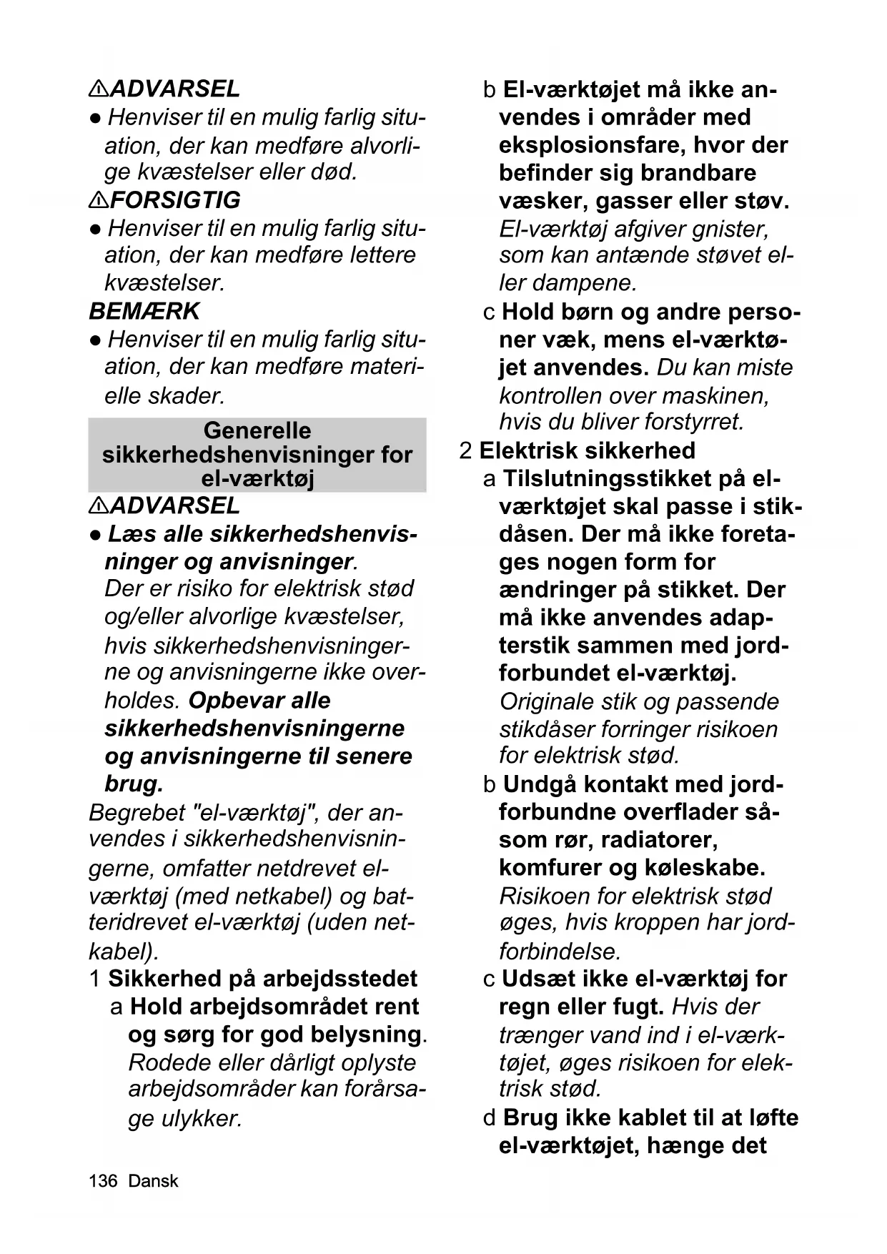 • EU-overensstemmelseserklæring Chairman of the Board of ManagementDirector Regulatory Affairs & Certification H. Jenner S. Reiser136 Dansk 몇 ADVARSEL ● Henviser til en mulig farlig situ- ation, der kan medføre alvorli- ge kvæstelser eller død. 몇 FORSIGTIG ● Henviser til en mulig farlig situ- ation, der kan medføre lettere kvæstelser. BEMÆRK ● Henviser til en mulig farlig situ- ation, der kan medføre materi- elle skader. Generelle sikkerhedshenvisninger for el-værktøj 몇 ADVARSEL ● Læs alle sikkerhedshenvis- ninger og anvisninger. Der er risiko for elektrisk stød og/eller alvorlige kvæstelser, hvis sikkerhedshenvisninger- ne og anvisningerne ikke over- holdes. Opbevar alle sikkerhedshenvisningerne og anvisningerne til senere brug. Begrebet "el-værktøj", der an- vendes i sikkerhedshenvisnin- gerne, omfatter netdrevet el- værktøj (med netkabel) og bat- teridrevet el-værktøj (uden net- kabel). 1 Sikkerhed på arbejdsstedet a Hold arbejdsområdet rent og sørg for god belysning. Rodede eller dårligt oplyste arbejdsområder kan forårsa- ge ulykker. b El-værktøjet må ikke an- vendes i områder med eksplosionsfare, hvor der befinder sig brandbare væsker, gasser eller støv. El-værktøj afgiver gnister, som kan antænde støvet el- ler dampene. c Hold børn og andre perso- ner væk, mens el-værktø- jet anvendes. Du kan miste kontrollen over maskinen, hvis du bliver forstyrret. 2 Elektrisk sikkerhed a Tilslutningsstikket på el- værktøjet skal passe i stik- dåsen. Der må ikke foreta- ges nogen form for ændringer på stikket. Der må ikke anvendes adap- terstik sammen med jord- forbundet el-værktøj. Originale stik og passende stikdåser forringer risikoen for elektrisk stød. b Undgå kontakt med jord- forbundne overflader så- som rør, radiatorer, komfurer og køleskabe. Risikoen for elektrisk stød øges, hvis kroppen har jord- forbindelse. c Udsæt ikke el-værktøj for regn eller fugt. Hvis der trænger vand ind i el-værk- tøjet, øges risikoen for elek- trisk stød. d Brug ikke kablet til at løfte el-værktøjet, hænge detDansk 137 op eller trække stikket ud af stikdåsen. Hold kablet væk fra varme, olie, skar- pe kanter eller bevægelige dele på maskinen. Beska- digede eller snoede tilslut- ningskabler øger risikoen for elektrisk stød. e Anvend kun forlænger- kabler, der er beregnet til udendørs brug, hvis du ar- bejder med el-værktøjet i det fri. Risikoen for elektrisk stød forringes, hvis der an- vendes et forlængerkabel, der er beregnet til udendørs brug. f Anvend et HFI-relæ/FI-re- læ, hvis el-værktøjet an- vendes i fugtige omgivelser. Anvendelse af et HFI-relæ/FI-relæ forringer risikoen for elektrisk stød. 3 Personlig sikkerhed a Vær opmærksom, overvej, hvad du gør, og brug din fornuft, når du arbejder med el-værktøj. Brug ikke el-værktøj, hvis du er træt eller er påvirket af narkoti- ka, alkohol eller medicin. Et øjebliks uopmærksom- hed under arbejdet med el- værktøj kan medføre alvorli- ge kvæstelser. b Bær personligt beskyttel- sesudstyr og altid beskyt- telsesbriller. Hvis der bæres personligt beskyttel- sesudstyr, såsom støvma- ske, skridsikre sikkerhedssko, beskyttel- seshjelm eller høreværn, forringes risikoen for kvæ- stelser, afhængigt af el- værktøjets anvendelse. c Undgå, at maskinen star- ter utilsigtet. Kontrollér, om el-værktøjet er slået fra, inden du tilslutter strømforsyningen og/eller batteriet, løfter det op eller bærer det. Hvis du holder fingeren på kontakten, mens du bærer el-værktøjet, eller maskinen er tændt, når strømforsyningen tilsluttes, kan det medføre ulykker. d Fjern indstillingsværktøj eller skruenøgle, inden du tænder for el-værktøjet. Et værktøj eller en nøgle, der befinder sig i roterende ma- skindele, kan medføre kvæ- stelser. e Undgå unormale kropsstil- linger. Sørg for at stå fast, og sørg altid for at have li- gevægt. Således har du bedre kontrol over el-værk- tøjet i en uventet situation. f Bær egnet tøj. Bær ikke løstsiddende tøj eller smykker. Hold hår, tøj og handsker væk fra bevæge- lige dele. Løstsiddende tøj, handsker, smykker eller langt hår kan blive grebet og138 Dansk trukket med af bevægelige dele. g Hvis der kan monteres støvudsugnings- og -op- samlingsanordninger, skal du sikre dig, at disse er korrekt tilsluttet og an- vendes korrekt. Fare på grund af støv kan forringes ved anvendelse af en støv- udsugning. 4 Anvendelse og håndtering af el-værktøj a Undgå at overbelaste ma- skinen. Anvend et el-værk- tøj, der passer til det pågældende arbejde. Med det passende el-værktøj ar- bejder du bedre og mere sik- kert inden for det angivne effektområde. b Brug ikke el-værktøj med defekt kontakt. Et el-værk- tøj, som ikke kan tændes el- ler slukkes, er farligt og skal repareres. c Tag stikket ud af stikdåsen og/eller fjern batteriet, in- den du foretager indstillin- ger på maskinen, skifter tilbehørsdele eller lægger maskinen til side. Disse sikkerhedsforanstaltninger forhindrer en utilsigtet start af el-værktøjet. d Opbevar el-værktøj, der ik- ke anvendes, uden for børns rækkevidde. Lad ik- ke personer anvende ma- skinen, der ikke er fortrolige med det eller ik- ke har læst disse anvisnin- ger. El-værktøj er farligt, hvis det anvendes af uerfar- ne personer. e Sørg for omhyggelig vedli- geholdelse af el-værktøj. Kontrollér, om de bevæge- lige dele fungerer korrekt og ikke er blokeret, om de- le er brækket eller beska- diget på en sådan måde, at el-værktøjet ikke fungerer korrekt. Lad beskadigede dele reparere, inden du ta- ger maskinen i brug. Man- ge uheld skyldes el-værktøj, der er dårligt vedligeholdt. f Hold skæreværktøj skarpt og rent. Ordentligt vedlige- holdt skæreværktøj med skarpe skærekanter sætter sig ikke så let fast og er let- tere at styre. g Anvend el-værktøj, tilbe- hør, hjælpeværktøj etc. i overensstemmelse med a