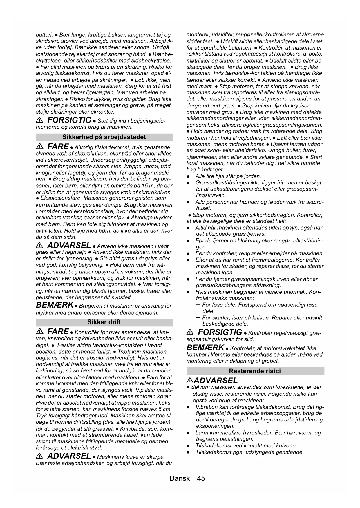 - EU-overensstemmelseserklæring Dansk 45 batteri. ● Bær lange, kraftige bukser, langærmet tøj og skridsikre støvler ved arbejde med maskinen. Arbejd ik- ke uden fodtøj. Bær ikke sandaler eller shorts. Undgå løstsiddende tøj eller tøj med snører og bånd. ● Bær be- skyttelses- eller sikkerhedsbriller med sidebeskyttelse. ● Før altid maskinen på tværs af en skråning. Risiko for alvorlig tilskadekomst, hvis du fører maskinen opad el- ler nedad ved arbejde på skråninger. ● Løb ikke, men gå, når du arbejder med maskinen. Sørg for at stå fast og sikkert, og bevar ligevægten, især ved arbejde på skråninger. ● Risiko for ulykke, hvis du glider. Brug ikke maskinen på kanten af skråninger og grave, på meget stejle skråninger eller skrænter. 몇 FORSIGTIG ● Sæt dig ind i betjeningsele- menterne og korrekt brug af maskinen. Sikkerhed på arbejdsstedet FARE ● Alvorlig tilskadekomst, hvis genstande slynges væk af skærekniven, eller tråd eller snor vikles ind i skæreværktøjet. Undersøg omhyggeligt arbejds- området for genstande såsom sten, kæppe, metal, tråd, knogler eller legetøj, og fjern det, før du bruger maski- nen. ● Brug aldrig maskinen, hvis der befinder sig per- soner, især børn, eller dyr i en omkreds på 15 m, da der er risiko for, at genstande slynges væk af skærekniven. ● Eksplosionsfare. Maskinen genererer gnister, som kan antænde støv, gas eller dampe. Brug ikke maskinen i områder med eksplosionsfare, hvor der befinder sig brandbare væsker, gasser eller støv. ● Alvorlige ulykker med børn. Børn kan føle sig tiltrukket af maskinen og aktiviteten. Hold øje med børn, de ikke altid er der, hvor du så dem sidst. 몇 ADVARSEL ● Anvend ikke maskinen i vådt græs eller i regnvejr. ● Anvend ikke maskinen, hvis der er risiko for lynnedslag. ● Slå altid græs i dagslys eller ved god, kunstig belysning. ● Hold børn væk fra slå- ningsområdet og under opsyn af en voksen, der ikke er brugeren; vær opmærksom, og sluk for maskinen, når et barn kommer ind på slåningsområdet. ● Vær forsig- tig, når du nærmer dig blinde hjørner, buske, træer eller genstande, der begrænser dit synsfelt. BEMÆRK ● Brugeren af maskinen er ansvarlig for ulykker med andre personer eller deres ejendom. Sikker drift FARE ● Kontrollér før hver anvendelse, at kni- ven, knivbolten og knivenheden ikke er slidt eller beska- diget. ● Fastlås aldrig tænd/sluk-kontakten i tændt position, dette er meget farligt. ● Træk kun maskinen baglæns, når det er absolut nødvendigt. Hvis det er nødvendigt at trække maskinen væk fra en mur eller en forhindring, så se først ned for at undgå, at du snubler eller kører over dine fødder med maskinen. ● Fare for at komme i kontakt med den fritliggende kniv eller for at bli- ve ramt af genstande, der slynges væk. Vip ikke maski- nen, når du starter motoren, eller mens motoren kører. Hvis det er absolut nødvendigt at vippe maskinen, f.eks. for at lette starten, kan maskinens forside hæves 5 cm. Tryk forsigtigt håndtaget ned. Maskinen skal sættes til- bage til normal driftsstilling (dvs. alle fire hjul på jorden), før du begynder at slå græsset. ● Knivblade, som kom- mer i kontakt med et strømførende kabel, kan lede strøm til maskinens fritliggende metaldele og dermed forårsage et elektrisk stød. 몇 ADVARSEL ● Maskinens knive er skarpe. Bær faste arbejdshandsker, og arbejd forsigtigt, når du monterer, udskifter, rengør eller kontrollerer, at skruerne sidder fast. ● Udskift slidte eller beskadigede dele i sæt for at opretholde balancen. ● Kontrollér, at maskinen er i sikker tilstand ved regelmæssigt at kontrollere, at bolte, møtrikker og skruer er spændt. ● Udskift slidte eller be- skadigede dele, før du bruger maskinen. ● Brug ikke maskinen, hvis tænd/sluk-kontakten på håndtaget ikke tænder eller slukker korrekt. ● Anvend ikke maskinen med magt. ● Stop motoren, for at stoppe knivene, når maskinen skal transporteres til eller fra slåningsområ- det, eller maskinen vippes for at passere en anden un- dergrund end græs. ● Stop kniven, før du krydser områder med grus. ● Brug ikke maskinen med defekte sikkerhedsanordninger eller uden sikkerhedsanordnin- ger som f.eks. afvisere og/eller græsopsamlingskurven. ● Hold hænder og fødder væk fra roterende dele. Stop motoren i henhold til vejledningen. ● Løft eller bær ikke maskinen, mens motoren kører. ● Ujævnt terræn udgør en øget skrid- eller uheldsrisiko. Undgå huller, furer, ujævnheder, sten eller andre skjulte genstande. ● Start først maskinen, når du befinder dig i det sikre område bag håndtaget. ● Alle fire hjul står på jorden. ● Græsudkaståbningen ikke ligger frit, men er beskyt- tet af udkaståbningens dæksel eller græsopsam- lingskurven. ● Alle personer har hænder og fødder væk fra skære- huset. ● Stop motoren, og fjern sikkerhedsnøglen. Kontrollér, at alle bevægelige dele er standset helt: ● Altid når maskinen efterlades uden opsyn, også når det afklippede græs fjernes. ● Før du fjerner en blokering eller rengør udkaståbnin- gen. ● Før du kontroller, rengør eller arbejder på maskinen. ● Efter at du har ramt et fremmedlegeme. Kontrollér maskinen for skader, og reparer disse, før du starter maskinen igen. ● Før du fjerner græsopsamlingskurven eller åbner græsudkaståbningens afdækning. ● Hvis maskinen begynder at vibrere unormalt. Kon- trollér straks maskinen: – For løse dele. Fastspænd om nødvendigt løse dele. – For skader, især på kniven. Reparer eller udskift beskadigede dele. 몇 FORSIGTIG ● Kontrollér regelmæssigt græ- sopsamlingskurven for slid. BEMÆRK ● Kontrollér, at motorstyrekablet ikke kommer i klemme eller beskadiges på anden måde ved montering eller indklapning af grebet. Resterende risici 몇 ADVARSEL ● Selvom maskinen anvendes som foreskrevet, er der stadig visse,