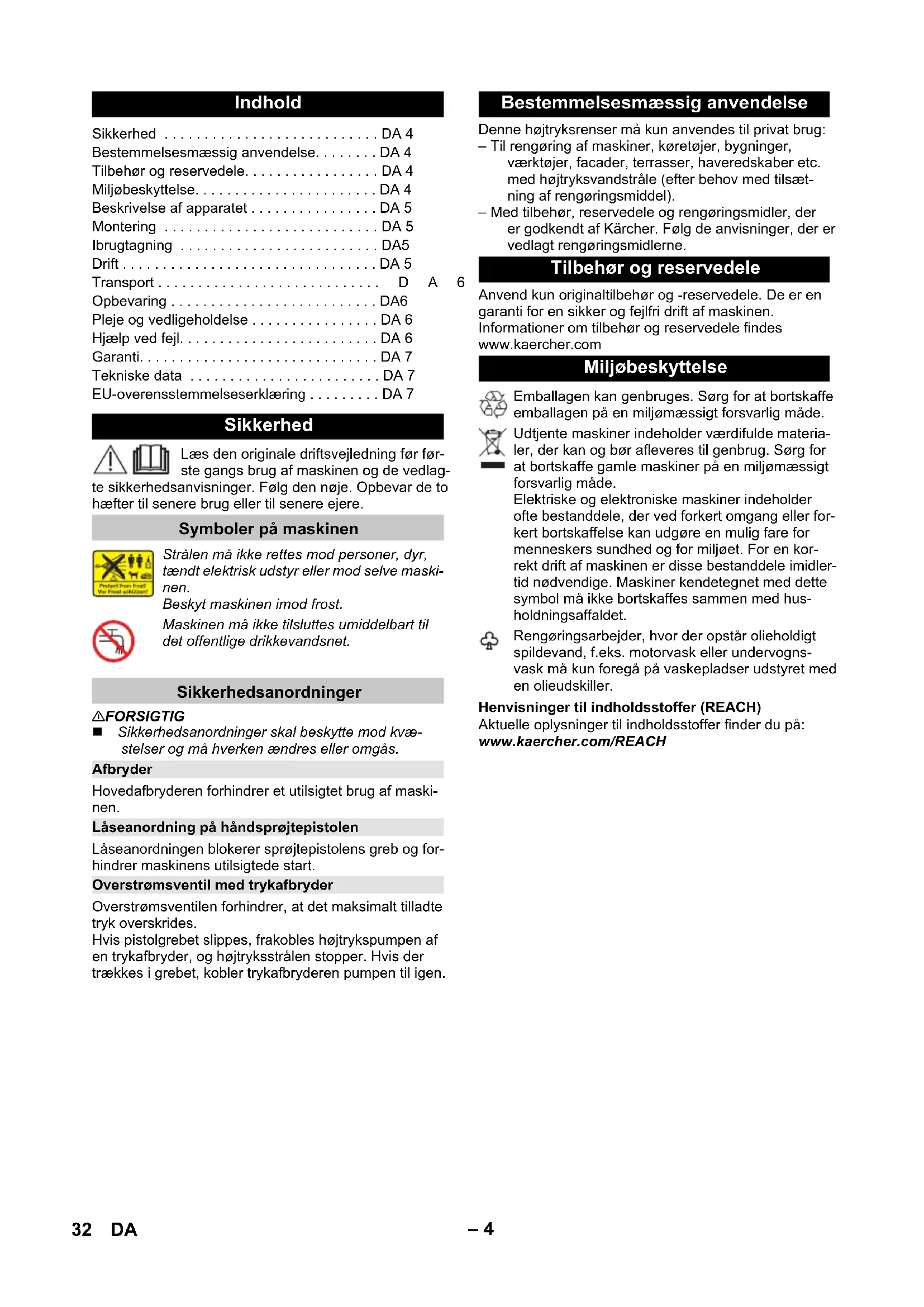 91 dB(A) Declaração UE de conformidade Produto: Lavadora de alta pressão Tipo: 1.600-xxx Respectivas Directrizes da UE 2006/42/CE (+2009/127/CE) 2014/30/UE 2011/65/UE 2000/14/CE Normas harmonizadas aplicadas EN 60335–1 EN 60335–2–79 EN 62233: 2008 EN 55014–1: 2017 EN 55014–2: 2015 EN 61000–3–2: 2014 EN 61000–3–3: 2013 EN 50581 Processo aplicado de avaliação de conformidade 2000/14/CE: Anexo V Nível de potência acústica dB(A) Medido: 89 Garantido: 91 Winnenden, 2020/08/01 Chairman of the Board of Management Director Regulatory Affairs & Certification 31PT– 4 Læs den originale driftsvejledning før før- ste gangs brug af maskinen og de vedlag- te sikkerhedsanvisninger. Følg den nøje. Opbevar de to hæfter til senere brug eller til senere ejere. 몇 FORSIGTIG Sikkerhedsanordninger skal beskytte mod kvæ- stelser og må hverken ændres eller omgås. Hovedafbryderen forhindrer et utilsigtet brug af maski- nen. Låseanordningen blokerer sprøjtepistolens greb og for- hindrer maskinens utilsigtede start. Overstrømsventilen forhindrer, at det maksimalt tilladte tryk overskrides. Hvis pistolgrebet slippes, frakobles højtrykspumpen af en trykafbryder, og højtryksstrålen stopper. Hvis der trækkes i grebet, kobler trykafbryderen pumpen til igen. Denne højtryksrenser må kun anvendes til privat brug: – Til rengøring af maskiner, køretøjer, bygninger, værktøjer, facader, terrasser, haveredskaber etc. med højtryksvandstråle (efter behov med tilsæt- ning af rengøringsmiddel). – Med tilbehør, reservedele og rengøringsmidler, der er godkendt af Kärcher. Følg de anvisninger, der er vedlagt rengøringsmidlerne. Anvend kun originaltilbehør og -reservedele. De er en garanti for en sikker og fejlfri drift af maskinen. Informationer om tilbehør og reservedele findes www.kaercher.com Henvisninger til indholdsstoffer (REACH) Aktuelle oplysninger til indholdsstoffer finder du på: www.kaercher.com/REACH Indhold Sikkerhed . . . . . . . . . . . . . . . . . . . . . . . . . . . DA 4 Bestemmelsesmæssig anvendelse. . . . . . . . DA 4 Tilbehør og reservedele. . . . . . . . . . . . . . . . . DA 4 Miljøbeskyttelse. . . . . . . . . . . . . . . . . . . . . . . DA 4 Beskrivelse af apparatet . . . . . . . . . . . . . . . . DA 5 Montering . . . . . . . . . . . . . . . . . . . . . . . . . . . DA 5 Ibrugtagning . . . . . . . . . . . . . . . . . . . . . . . . . DA5 Drift . . . . . . . . . . . . . . . . . . . . . . . . . . . . . . . . DA 5 Transport . . . . . . . . . . . . . . . . . . . . . . . . . . . .DA6 Opbevaring . . . . . . . . . . . . . . . . . . . . . . . . . . DA6 Pleje og vedligeholdelse . . . . . . . . . . . . . . . . DA 6 Hjælp ved fejl. . . . . . . . . . . . . . . . . . . . . . . . . DA 6 Garanti. . . . . . . . . . . . . . . . . . . . . . . . . . . . . . DA 7 Tekniske data . . . . . . . . . . . . . . . . . . . . . . . . DA 7 EU-overensstemmelseserklæring . . . . . . . . . DA 7 Sikkerhed Symboler på maskinen Strålen må ikke rettes mod personer, dyr, tændt elektrisk udstyr eller mod selve maski- nen. Beskyt maskinen imod frost. Maskinen må ikke tilsluttes umiddelbart til det offentlige drikkevandsnet. Sikkerhedsanordninger Afbryder Låseanordning på håndsprøjtepistolen Overstrømsventil med trykafbryder Bestemmelsesmæssig anvendelse Tilbehør og reservedele Miljøbeskyttelse Emballagen kan genbruges. Sørg for at bortskaffe emballagen på en miljømæssigt forsvarlig måde. Udtjente maskiner indeholder værdifulde materia- ler, der kan og bør afleveres til genbrug. Sørg for at bortskaffe gamle maskiner på en miljømæssigt forsvarlig måde. Elektriske og elektroniske maskiner indeholder ofte bestanddele, der ved forkert omgang eller for- kert bortskaffelse kan udgøre en mulig fare for menneskers sundhed og for miljøet. For en kor- rekt drift af maskinen er disse bestanddele imidler- tid nødvendige. Maskiner kendetegnet med dette symbol må ikke bortskaffes sammen med hus- holdningsaffaldet. Rengøringsarbejder, hvor der opstår olieholdigt spildevand, f.eks. motorvask eller undervogns- vask må kun foregå på vaskepladser udstyret med en olieudskiller. 32 DA– 5 Maskinen, tilbehør m.m. vises på emballagen. Kontrol- ler ved udpakningen, om indholdet er komplet. Kontakt venligst forhandleren, hvis der mangler tilbehør eller ved transportskader. Se figurerne på side 2 1 Vandtilslutning med integreret si 2 Tilkoblingsdel til vandforsyning 3 Højtrykstilslutning 4 Rum til tilbehør 5 Bæregreb 6 Strømledning med netstik 7 Kalbelclips 8 Opbevaring til strømledningen 9 Hovedafbryder „0/OFF“ / „I/ON“ 10 Håndsprøjtepistol 11 Låseanordning på håndsprøjtepistolen 12 Klemme til højtryksslangen 13 Sikringsmuffe 14 Strålerørsforlængelse 15 Strålerør med trykregulering (Vario Power) Arbejdstrykket kan øges trinløst fra "SOFT" til "HARD". Giv slip på højtrykspistolens greb, og drej strålerøret til den ønskede stilling for at justere ar- bejdstrykket. 16 Højtryksslange Løse komponenter, som er vedlagt maskinen, skal før brugen monteres. Se figurerne på side 3 Figur Skru den medfølgende koblingsdel på højtryksren- serens vandtilslutning. Figur Træk clipsen til højtryksslangen ud af håndsprøjte- pistolen. Figur Stik højtryksslangen ind i håndsprøjtepistolen. Tryk klemmen ind indtil den går i hak. Kontroller om forbindelsen er sikker ved at trække i højtryksslan- gen. Stil apparatet på en plan flade. Figur Højtryksslangen kobles til maskinens højtrykstil- slutning. Kontroller om forbindelsen er sikker ved at trække i højtryksslangen. Sæt netstikket i en stikdåse. Se typeskilt/tekniske data for tilslutningsværdier Læg mærke til vandforsyningsselskabets reglementer. BEMÆRK Forureninger i vandet kan beskadige højtrykspumpen og tilbehøret. For at beskytte maskinen anbefales brug af KÄRCHER-vandfilter (specialtilbehør, bestillings- nummer 4.730-059). Sæt vandtilløbsslangen på vandtillsutningens kob- l