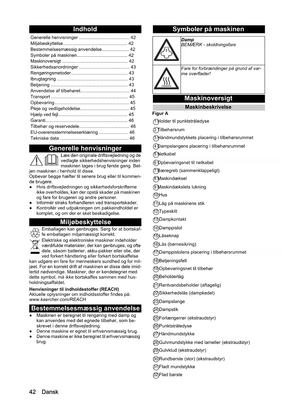 - Comprimento do cabo m 542 Dansk Indhold Generelle henvisninger Læs den originale driftsvejledning og de vedlagte sikkerhedshenvisninger inden maskinen tages i brug første gang. Bet- jen maskinen i henhold til disse. Opbevar begge hæfter til senere brug eller til kommen- de brugere. ● Hvis driftsvejledningen og sikkerhedsforskrifterne ikke overholdes, kan der opstå skader på maskinen og fare for brugeren og andre personer. ● Informér straks forhandleren ved transportskader. ● Kontrollér ved udpakningen om pakkeindholdet er komplet, og om der er sket beskadigelse. Miljøbeskyttelse Emballagen kan genbruges. Sørg for at bortskaf- fe emballagen miljømæssigt korrekt. Elektriske og elektroniske maskiner indeholder værdifulde materialer, der kan genbruges, og ofte dele, såsom batterier, akku-pakker eller olie, der ved forkert håndtering eller forkert bortskaffelse kan udgøre en fare for menneskers sundhed og for mil- jøet. For en korrekt drift af maskinen er disse dele imid- lertid nødvendige. Maskiner, der er kendetegnet med dette symbol, må ikke bortskaffes sammen med hus- holdningsaffaldet. Henvisninger til indholdsstoffer (REACH) Aktuelle oplysninger om indholdsstoffer findes på: www.kaercher.com/REACH Bestemmelsesmæssig anvendelse ● Maskinen er beregnet til rengøring med damp og kan anvendes med det egnede tilbehør, som be- skrevet i denne driftsvejledning. ● Denne maskine er egnet til erhvervsmæssig brug. ● Denne maskine er ikke beregnet til erhvervsmæssig brug. Symboler på maskinen Maskinoversigt Maskinbeskrivelse Figur A 1 Holder til punktstråledyse 2 Tilbehørsrum 3 Håndmundstykkets placering i tilbehørsrummet 4 Dampslangens placering i tilbehørsrummet 5 Netkabel 6 Opbevaringsnet til netkabel 7 Bæregreb (sammenklappeligt) 8 Maskindæksel 9 Maskindækslets lukning 10 Hus 11 Låg på maskinens stik 12 Typeskilt 13 Dampkontakt 14 Damppistol 15 Låseknap 16 Lås (børnesikring) 17 Damppistolens placering i tilbehørsrummet 18 Betjeningsfelt 19 Opbevaringsnet til tilbehør 20 Beholderlåg 21 Rentvandsbeholder (aftagelig) 22 Sikkerhedslås (dampkedel) 23 Dampslange 24 Dampstik 25 Forlængerrør (ekstraudstyr) 26 Punktstråledyse 27 Håndmundstykke 28 Gulvmundstykke med lameller (ekstraudstyr) 29 Gulvklud (ekstraudstyr) 30 Rundbørste (stor) (ekstraudstyr) 31 Fladt mundstykke 32 Flad børste Generelle henvisninger p. 42
