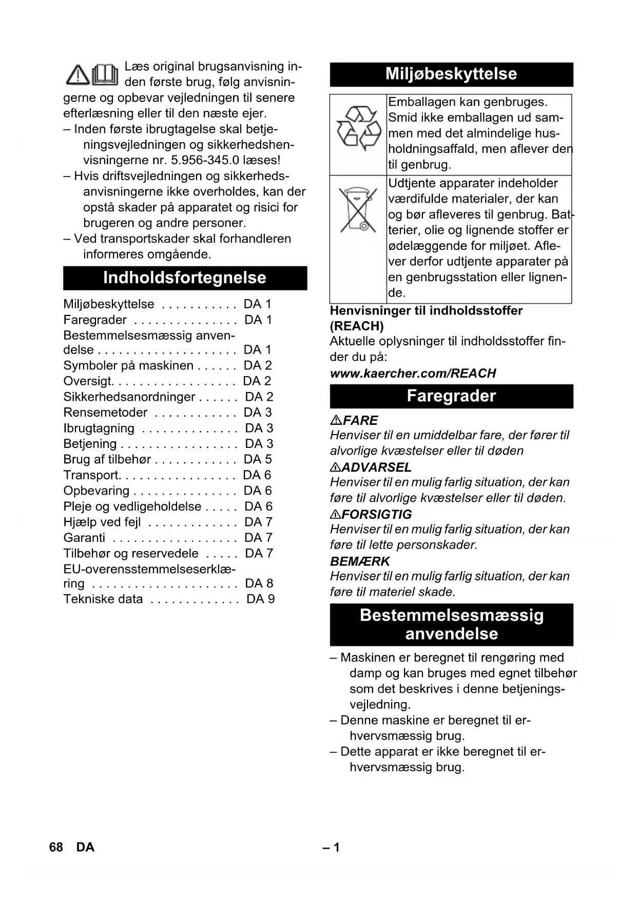 Refª Comprimen- to do cabo CN 6.650-597.0 7,5 m 67PT– 1 Læs original brugsanvisning in- den første brug, følg anvisnin- gerne og opbevar vejledningen til senere efterlæsning eller til den næste ejer. – Inden første ibrugtagelse skal betje- ningsvejledningen og sikkerhedshen- visningerne nr. 5.956-345.0 læses! – Hvis driftsvejledningen og sikkerheds- anvisningerne ikke overholdes, kan der opstå skader på apparatet og risici for brugeren og andre personer. – Ved transportskader skal forhandleren informeres omgående. Henvisninger til indholdsstoffer (REACH) Aktuelle oplysninger til indholdsstoffer fin- der du på: www.kaercher.com/REACH FARE Henviser til en umiddelbar fare, der fører til alvorlige kvæstelser eller til døden 몇 ADVARSEL Henviser til en mulig farlig situation, der kan føre til alvorlige kvæstelser eller til døden. 몇 FORSIGTIG Henviser til en mulig farlig situation, der kan føre til lette personskader. BEMÆRK Henviser til en mulig farlig situation, der kan føre til materiel skade. – Maskinen er beregnet til rengøring med damp og kan bruges med egnet tilbehør som det beskrives i denne betjenings- vejledning. – Denne maskine er beregnet til er- hvervsmæssig brug. – Dette apparat er ikke beregnet til er- hvervsmæssig brug. Indholdsfortegnelse Miljøbeskyttelse . . . . . . . . . . . DA 1 Faregrader . . . . . . . . . . . . . . . DA 1 Bestemmelsesmæssig anven- delse . . . . . . . . . . . . . . . . . . . . DA 1 Symboler på maskinen . . . . . . DA 2 Oversigt. . . . . . . . . . . . . . . . . . DA 2 Sikkerhedsanordninger . . . . . . DA 2 Rensemetoder . . . . . . . . . . . . DA 3 Ibrugtagning . . . . . . . . . . . . . . DA 3 Betjening . . . . . . . . . . . . . . . . . DA 3 Brug af tilbehør . . . . . . . . . . . . DA 5 Transport. . . . . . . . . . . . . . . . . DA 6 Opbevaring . . . . . . . . . . . . . . . DA 6 Pleje og vedligeholdelse . . . . . DA 6 Hjælp ved fejl . . . . . . . . . . . . . DA 7 Garanti . . . . . . . . . . . . . . . . . . DA 7 Tilbehør og reservedele . . . . . DA 7 EU-overensstemmelseserklæ- ring . . . . . . . . . . . . . . . . . . . . . DA 8 Tekniske data . . . . . . . . . . . . . DA 9 Miljøbeskyttelse Emballagen kan genbruges. Smid ikke emballagen ud sam- men med det almindelige hus- holdningsaffald, men aflever den til genbrug. Udtjente apparater indeholder værdifulde materialer, der kan og bør afleveres til genbrug. Bat- terier, olie og lignende stoffer er ødelæggende for miljøet. Afle- ver derfor udtjente apparater på en genbrugsstation eller lignen- de. Faregrader Bestemmelsesmæssig anvendelse 68 DA– 2 Damp OBS - skoldningsfare Figur 1 Sikkerhedslås (dampkedel) 2 Betjeningsfelt 3 Dampslange 4 Nulstillingsknap - Afkalkning 5 Dampkontakt 6 Rum til tilbehør 7 Låg til apparatets stikkontakt 8 Dampstik 9 Bæregreb 10 Kabelkrog 11 Hætte 12 Beholderlås (friskvandsbeholder) 13 Frottébetræk 14 Påfyldningstragt 15 Håndmundstykke 16 Vinduesdyse (ekstratilbehør) 17 Netkabel 18 Holdeklemmer 19 Gulvmundstykke med børster 20 Gulvklud (gulvmundstykke med bør- ster) 21 Rundbørste 22 Powerdyse (rød) 23 Forlængerrør 24 Gulvmundstykke med lameller 25 Punktstråledyse (120 mm) 26 Punktstråledyse (180 mm) 27 Gulvklud (gulvmundstykke med lamel- ler) 28 Låseknap 29 Forlængerrør 30 Lås (børnesikring) 31 Damppistol Figur 1 Kontakt - pumpe friskvandsbeholder 2 Kontrollampe - Varmesystem (gul) 3 Kontrollampe – Dampkedel mangler vand (rød) 4 Temperaturindikator 5 Drejeknap til VAPOHYDRO-regulering 6 Drejeknap til regulering af dampmæng- den 7 Arbejdstemperaturområde 8 Kontrollampe - Afkalkning (hvid) 9 Kontrollampe – friskvandsbeholderen mangler vand (rød) 10 Kontakt - Varmesystem (tænd/sluk) – Betjeningselementer til rengøringspro- cessen er bul. – Betjeningselementer til vedligeholdelse og service er lysegrå. Sikkerhedsanordningerne tjener brugerens beskyttelse og må ikke sættes ud af drift el- ler ignoreres i deres funktion. Trykregulatoren sørger for, at kedeltrykket er så konstant som muligt under driften. Varmesystemet kobles fra, når det maksi- male driftstryk i kedlen på 4 bar er opnået og kobles til igen ved trykfald i kedlen pga. dampudtagning. Når vandet i kedlen er ved at være brugt op, stiger temperaturen på varmesystemet. Vandmangeltermostaten kobler varmesy- stemet fra, og den røde kontrollampe "Vandmangel" lyser. Varmesystemet kob- les først til igen, når kedlen er kølet af eller bliver fyldt igen. Symboler på maskinen Skoldningsfare på grund af varme anlægskomponenter! Oversigt Maskinelementer Betjeningsfelt Farvekodning Sikkerhedsanordninger Trykregulator Vandmangeltermostat 69DA– 3 – Hvis vandmangeltermostaten svigter, og maskinen overophedes, kobler sik- kerhedstermostaten maskinen fra. – Kontakt den ansvarlige Kärcher-kunde- service for at få sikkerhedstermostaten nulstillet. – Sikkerhedslåsen lukker kedlen for det forestående damptryk. Hvis trykregula- toren er defekt, og i kedlen opstår et overtryk, åbnes en overtryksventil i sik- kerhedslåsen, og der strømmer damp ud igennem låsen. – Kontakt den ansvarlige Kärcher-kunde- service, inden maskinen i brug igen. Inden tekstiler behandles med damprense- ren, skal man altid kontrollere tekstilernes forligelighed et skjult sted: Afdamp teksti- lernes først, lad tekstilerne tørre og kontrol- ler så tekstilernes farve og form. Ved rengøring af lakerede eller kunststof- coatede overflader som f.eks. køkken- og almindelige møbler, døre, parket og linole- um kan der løsnes voks, møbelpolitur, kunststofcoating eller farve eller der kan opstå pletter. Ved rengøring af disse over- flader damp ført en klud og visk med kluden over overfladen. Ved meget lave temperaturer skal vinduer- ne opvarmes først. Afdamp forsigtigt først hele glasoverfladen med en afstand på ca. 50 cm. På den måde undgås spændinger på overfladen, som kan føre til et glasbrud. Klap låget på stikdåsen op, og stik dam
