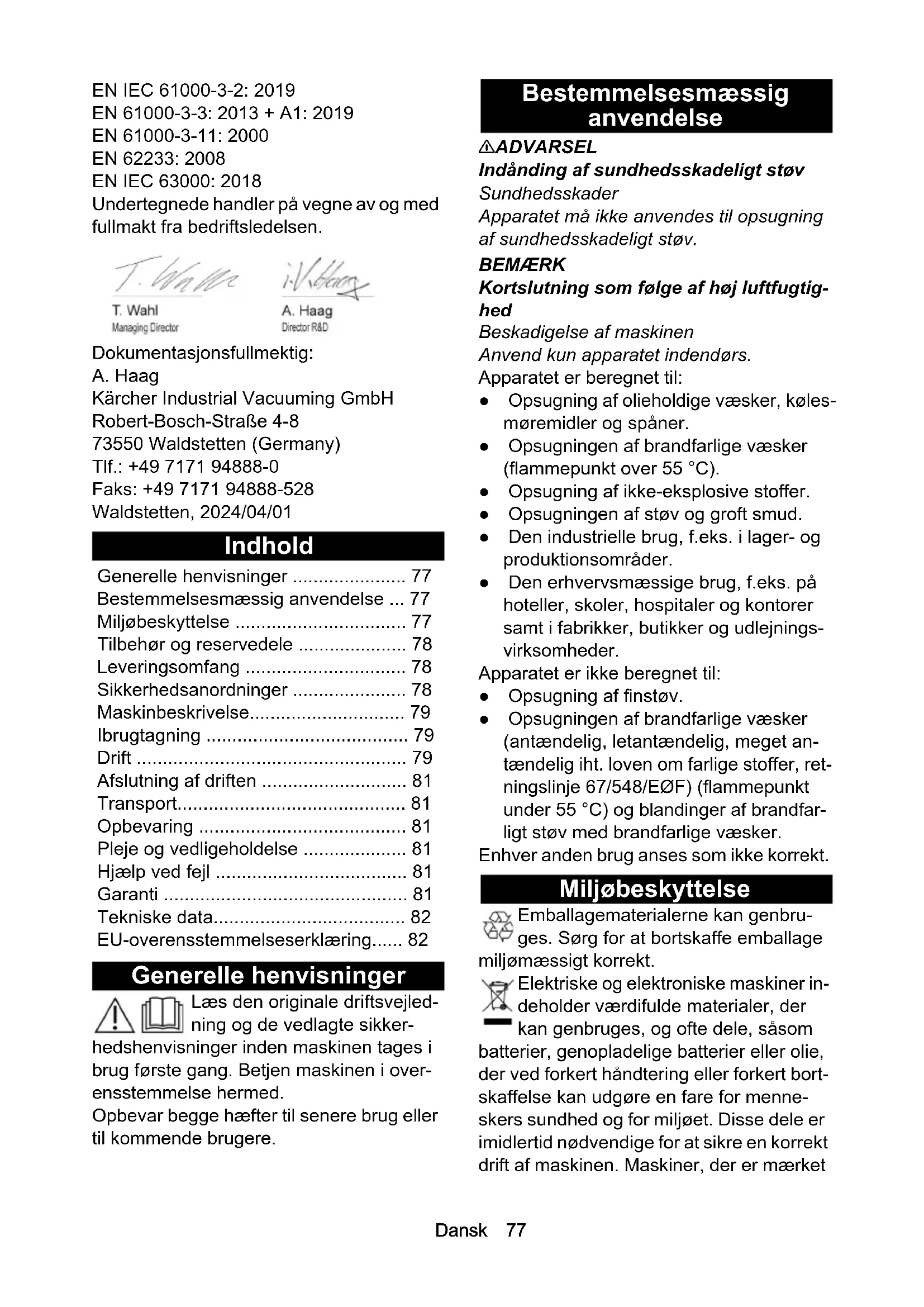 - EN 61000-3-3: 2013 + A1: 2019 EN 61000-3-11: 2000 EN 62233: 2008 EN IEC 63000: 2018 Undertegnede handler på vegne av og med fullmakt fra bedriftsledelsen. Dokumentasjonsfullmektig: A. Haag Kärcher Industrial Vacuuming GmbH Robert-Bosch-Straße 4-8 73550 Waldstetten (Germany) Tlf.: +49 7171 94888-0 Faks: +49 7171 94888-528 Waldstetten, 2024/04/01 Indhold Generelle henvisninger Læs den originale driftsvejled- ning og de vedlagte sikker- hedshenvisninger inden maskinen tages i brug første gang. Betjen maskinen i over- ensstemmelse hermed. Opbevar begge hæfter til senere brug eller til kommende brugere. Bestemmelsesmæssig anvendelse 몇 ADVARSEL Indånding af sundhedsskadeligt støv Sundhedsskader Apparatet må ikke anvendes til opsugning af sundhedsskadeligt støv. BEMÆRK Kortslutning som følge af høj luftfugtig- hed Beskadigelse af maskinen Anvend kun apparatet indendørs. Apparatet er beregnet til: ● Opsugning af olieholdige væsker, køles- møremidler og spåner. ● Opsugningen af brandfarlige væsker (flammepunkt over 55 °C). ● Opsugning af ikke-eksplosive stoffer. ● Opsugningen af støv og groft smud. ● Den industrielle brug, f.eks. i lager- og produktionsområder. ● Den erhvervsmæssige brug, f.eks. på hoteller, skoler, hospitaler og kontorer samt i fabrikker, butikker og udlejnings- virksomheder. Apparatet er ikke beregnet til: ● Opsugning af finstøv. ● Opsugningen af brandfarlige væsker (antændelig, letantændelig, meget an- tændelig iht. loven om farlige stoffer, ret- ningslinje 67/548/EØF) (flammepunkt under 55 °C) og blandinger af brandfar- ligt støv med brandfarlige væsker. Enhver anden brug anses som ikke korrekt. Miljøbeskyttelse Emballagematerialerne kan genbru- ges. Sørg for at bortskaffe emballage miljømæssigt korrekt. Elektriske og elektroniske maskiner in- deholder værdifulde materialer, der kan genbruges, og ofte dele, såsom batterier, genopladelige batterier eller olie, der ved forkert håndtering eller forkert bort- skaffelse kan udgøre en fare for menne- skers sundhed og for miljøet. Disse dele er imidlertid nødvendige for at sikre en korrekt drift af maskinen. Maskiner, der er mærket Generelle henvisninger p. 77