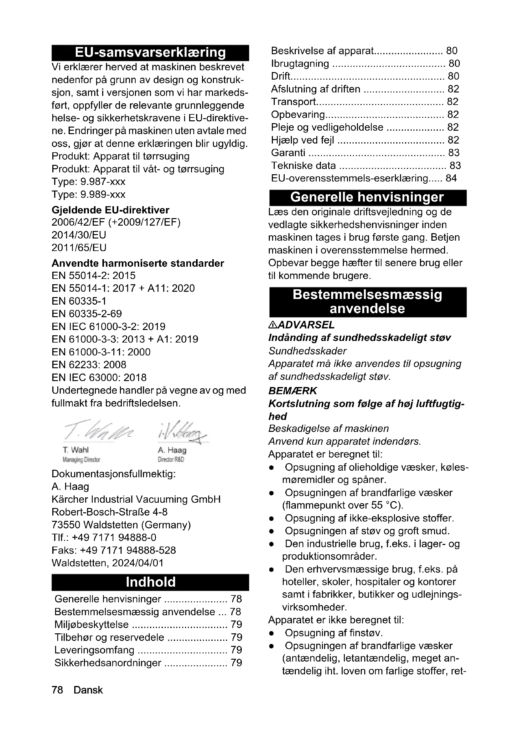 - EN 61000-3-3: 2013 + A1: 2019 EN 61000-3-11: 2000 EN 62233: 2008 EN IEC 63000: 2018 Undertegnede handler på vegne av og med fullmakt fra bedriftsledelsen. Dokumentasjonsfullmektig: A. Haag Kärcher Industrial Vacuuming GmbH Robert-Bosch-Straße 4-8 73550 Waldstetten (Germany) Tlf.: +49 7171 94888-0 Faks: +49 7171 94888-528 Waldstetten, 2024/04/01 Indhold Generelle henvisninger Læs den originale driftsvejledning og de vedlagte sikkerhedshenvisninger inden maskinen tages i brug første gang. Betjen maskinen i overensstemmelse hermed. Opbevar begge hæfter til senere brug eller til kommende brugere. Bestemmelsesmæssig anvendelse 몇 ADVARSEL Indånding af sundhedsskadeligt støv Sundhedsskader Apparatet må ikke anvendes til opsugning af sundhedsskadeligt støv. BEMÆRK Kortslutning som følge af høj luftfugtig- hed Beskadigelse af maskinen Anvend kun apparatet indendørs. Apparatet er beregnet til: ● Opsugning af olieholdige væsker, køles- møremidler og spåner. ● Opsugningen af brandfarlige væsker (flammepunkt over 55 °C). ● Opsugning af ikke-eksplosive stoffer. ● Opsugningen af støv og groft smud. ● Den industrielle brug, f.eks. i lager- og produktionsområder. ● Den erhvervsmæssige brug, f.eks. på hoteller, skoler, hospitaler og kontorer samt i fabrikker, butikker og udlejnings- virksomheder. Apparatet er ikke beregnet til: ● Opsugning af finstøv. ● Opsugningen af brandfarlige væsker (antændelig, letantændelig, meget an- tændelig iht. loven om farlige stoffer, ret- Generelle henvisninger p. 78