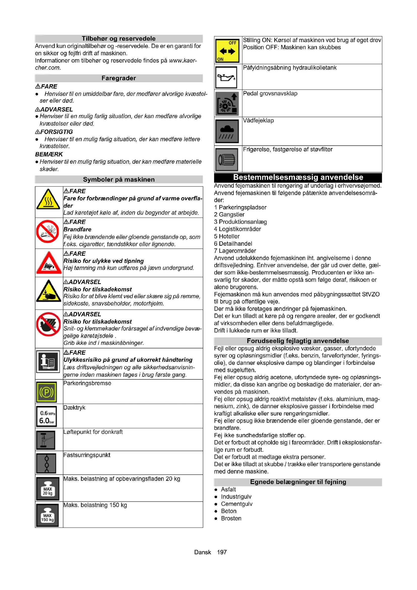 - EU-overensstemmelseserklæring Dansk 197 Tilbehør og reservedele Anvend kun originaltilbehør og -reservedele. De er en garanti for en sikker og fejlfri drift af maskinen. Informationer om tilbehør og reservedele findes på www.kaer- cher.com. Faregrader FARE ● Henviser til en umiddelbar fare, der medfører alvorlige kvæstel- ser eller død. 몇 ADVARSEL ● Henviser til en mulig farlig situation, der kan medføre alvorlige kvæstelser eller død. 몇 FORSIGTIG ● Henviser til en mulig farlig situation, der kan medføre lettere kvæstelser. BEMÆRK ● Henviser til en mulig farlig situation, der kan medføre materielle skader. Symboler på maskinen Bestemmelsesmæssig anvendelse Anvend fejemaskinen til rengøring af underlag i erhvervsøjemed. Anvend fejemaskinen til følgende påtænkte anvendelsesområ- der: 1 Parkeringspladser 2 Gangstier 3 Produktionsanlæg 4 Logistikområder 5 Hoteller 6 Detailhandel 7 Lagerområder Anvend udelukkende fejemaskinen iht. angivelserne i denne driftsvejledning. Enhver anvendelse, der går ud over dette, gæl- der som ikke-bestemmelsesmæssig. Producenten er ikke an- svarlig for skader, der måtte opstå som følge deraf, risikoen er alene brugerens. Fejemaskinen må kun anvendes med påbygningssættet StVZO til brug på offentlige veje. Der må ikke foretages ændringer på fejemaskinen. Det er kun tilladt at køre på og rengøre arealer, der er godkendt af virksomheden eller dens befuldmægtigede. Drift i lukkede rum er ikke tilladt. Forudseelig fejlagtig anvendelse Fejl eller opsug aldrig eksplosive væsker, gasser, ufortyndede syrer og opløsningsmidler (f.eks. benzin, farvefortynder, fyrings- olie), de danner eksplosive dampe og blandinger i forbindelse med sugeluften. Fej eller opsug aldrig acetone, ufortyndede syre- og opløsnings- midler, da disse kan angribe og beskadige de materialer, der an- vendes på maskinen. Fej eller opsug aldrig reaktivt metalstøv (f.eks. aluminium, mag- nesium, zink), de danner eksplosive gasser i forbindelse med kraftigt alkaliske eller sure rengøringsmidler. Fej eller opsug ikke brændende eller gloende genstande, der er brandfare. Fej ikke sundhedsfarlige stoffer op. Det er forbudt at opholde sig i fareområder. Drift i eksplosionsfar- lige rum er forbudt. Det er forbudt at medtage ekstra personer. Det er ikke tilladt at skubbe / trække eller transportere genstande med denne maskine. Egnede belægninger til fejning ● Asfalt ● Industrigulv ● Cementgulv ● Beton ● Brosten FARE Fare for forbrændinger på grund af varme overfla- der Lad køretøjet køle af, inden du begynder at arbejde. FARE Brandfare Fej ikke brændende eller gloende genstande op, som f.eks. cigaretter, tændstikker eller lignende. FARE Risiko for ulykke ved tipning Høj tømning må kun udføres på jævn undergrund. 몇 ADVARSEL Risiko for tilskadekomst Risiko for at blive klemt ved eller skære sig på remme, sidekoste, snavsbeholder, motorhjelm. 몇 ADVARSEL Risiko for tilskadekomst Snit- og klemmekader forårsaget af indvendige bevæ- gelige køretøjsdele . Grib ikke ind i maskinåbninger. FARE Ulykkesrisiko på grund af ukorrekt håndtering Læs driftsvejledningen og alle sikkerhedsanvisnin- gerne inden maskinen tages i brug første gang. Parkeringsbremse Dæktryk Løftepunkt for donkraft Fastsurringspunkt Maks. belastning af opbevaringsfladen 20 kg Maks. belastning 150 kg Stilling ON: Kørsel af maskinen ved brug af eget drev Position OFF: Maskinen kan skubbes Påfyldningsåbning hydraulikolietank Pedal grovsnavsklap Vådfejeklap Frigørelse, fastgørelse af støvfilter198 Dansk Funktion Fejemaskinen arbejder iht. overthrow-princippet. p. 213