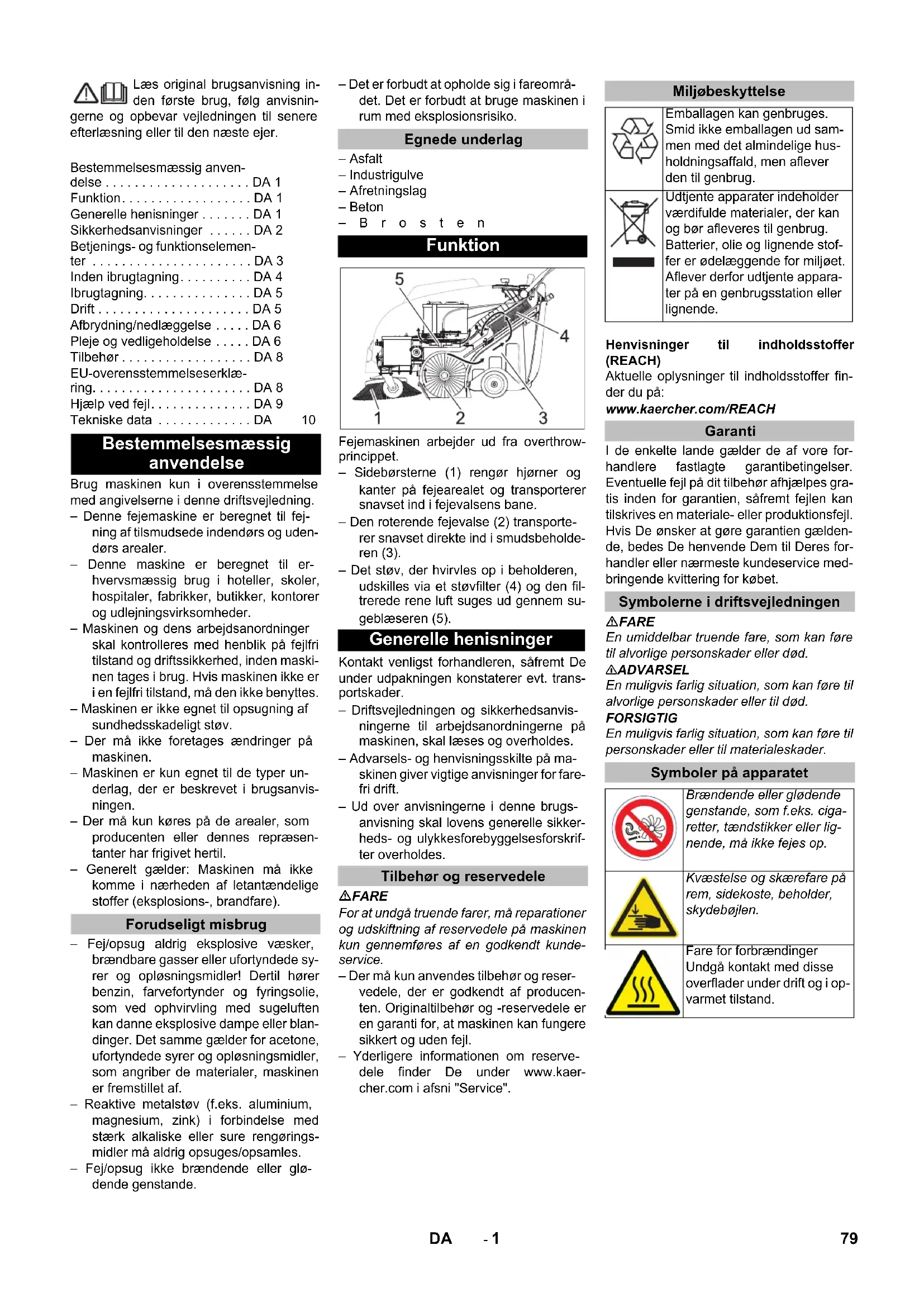 0,2 0,2 78 PT- 1 Læs original brugsanvisning in- den første brug, følg anvisnin- gerne og opbevar vejledningen til senere efterlæsning eller til den næste ejer. Brug maskinen kun i overensstemmelse med angivelserne i denne driftsvejledning. – Denne fejemaskine er beregnet til fej- ning af tilsmudsede indendørs og uden- dørs arealer. – Denne maskine er beregnet til er- hvervsmæssig brug i hoteller, skoler, hospitaler, fabrikker, butikker, kontorer og udlejningsvirksomheder. – Maskinen og dens arbejdsanordninger skal kontrolleres med henblik på fejlfri tilstand og driftssikkerhed, inden maski- nen tages i brug. Hvis maskinen ikke er i en fejlfri tilstand, må den ikke benyttes. – Maskinen er ikke egnet til opsugning af sundhedsskadeligt støv. – Der må ikke foretages ændringer på maskinen. – Maskinen er kun egnet til de typer un- derlag, der er beskrevet i brugsanvis- ningen. – Der må kun køres på de arealer, som producenten eller dennes repræsen- tanter har frigivet hertil. – Generelt gælder: Maskinen må ikke komme i nærheden af letantændelige stoffer (eksplosions-, brandfare). – Fej/opsug aldrig eksplosive væsker, brændbare gasser eller ufortyndede sy- rer og opløsningsmidler! Dertil hører benzin, farvefortynder og fyringsolie, som ved ophvirvling med sugeluften kan danne eksplosive dampe eller blan- dinger. Det samme gælder for acetone, ufortyndede syrer og opløsningsmidler, som angriber de materialer, maskinen er fremstillet af. – Reaktive metalstøv (f.eks. aluminium, magnesium, zink) i forbindelse med stærk alkaliske eller sure rengørings- midler må aldrig opsuges/opsamles. – Fej/opsug ikke brændende eller glø- dende genstande. – Det er forbudt at opholde sig i fareområ- det. Det er forbudt at bruge maskinen i rum med eksplosionsrisiko. – Asfalt – Industrigulve – Afretningslag – Beton –Brosten Fejemaskinen arbejder ud fra overthrow- princippet. – Sidebørsterne (1) rengør hjørner og kanter på fejearealet og transporterer snavset ind i fejevalsens bane. – Den roterende fejevalse (2) transporte- rer snavset direkte ind i smudsbeholde- ren (3). – Det støv, der hvirvles op i beholderen, udskilles via et støvfilter (4) og den fil- trerede rene luft suges ud gennem su- geblæseren (5). Kontakt venligst forhandleren, såfremt De under udpakningen konstaterer evt. trans- portskader. – Driftsvejledningen og sikkerhedsanvis- ningerne til arbejdsanordningerne på maskinen, skal læses og overholdes. – Advarsels- og henvisningsskilte på ma- skinen giver vigtige anvisninger for fare- fri drift. – Ud over anvisningerne i denne brugs- anvisning skal lovens generelle sikker- heds- og ulykkesforebyggelsesforskrif- ter overholdes. FARE For at undgå truende farer, må reparationer og udskiftning af reservedele på maskinen kun gen nemføres af en godkendt kunde- service. – Der må kun anvendes tilbehør og reser- vedele, der er godkendt af producen- ten. Originaltilbehør og -reservedele er en garanti for, at maskinen kan fungere sikkert og uden fejl. – Yderligere informationen om reserve- dele finder De under www.kaer- cher.com i afsni "Service". Henvisninger til indholdsstoffer (REACH) Aktuelle oplysninger til indholdsstoffer fin- der du på: www.kaercher.com/REACH I de enkelte lande gælder de af vore for- handlere fastlagte garantibetingelser. Eventuelle fejl på dit tilbehør afhjælpes gra- tis inden for garantien, såfremt fejlen kan tilskrives en materiale- eller produktionsfejl. Hvis De ønsker at gøre garantien gælden- de, bedes De henvende Dem til Deres for- handler eller nærmeste kundeservice med- bringende kvittering for købet. FARE En umiddelbar truende fare, som kan føre til alvorlige personskader eller død. 몇 ADVARSEL En muligvis farlig situation, som kan føre til alvorlige personskader eller til død. FORSIGTIG En muligvis farlig situation, som kan føre til personskader eller til materialeskader. Bestemmelsesmæssig anven- delse . . . . . . . . . . . . . . . . . . . . DA 1 Funktion. . . . . . . . . . . . . . . . . . DA 1 Generelle henisninger . . . . . . . DA 1 Sikkerhedsanvisninger . . . . . . DA 2 Betjenings- og funktionselemen- ter . . . . . . . . . . . . . . . . . . . . . . DA 3 Inden ibrugtagning. . . . . . . . . . DA 4 Ibrugtagning. . . . . . . . . . . . . . . DA 5 Drift . . . . . . . . . . . . . . . . . . . . . DA 5 Afbrydning/nedlæggelse . . . . . DA 6 Pleje og vedligeholdelse . . . . . DA 6 Tilbehør . . . . . . . . . . . . . . . . . . DA 8 EU-overensstemmelseserklæ- ring. . . . . . . . . . . . . . . . . . . . . . DA 8 Hjælp ved fejl. . . . . . . . . . . . . . DA 9 Tekniske data . . . . . . . . . . . . . DA 10 Bestemmelsesmæssig anvendelse Forudseligt misbrug Egnede underlag Funktion Generelle henisninger Tilbehør og reservedele Miljøbeskyttelse Emballagen kan genbruges. Smid ikke emballagen ud sam- men med det almindelige hus- holdningsaffald, men aflever den til genbrug. Udtjente apparater indeholder værdifulde materialer, der kan og bør afleveres til genbrug. Batterier, olie og lignende stof- fer er ødelæggende for miljøet. Aflever derfor udtjente appara- ter på en genbrugsstation eller lignende. Garanti Symbolerne i driftsvejledningen Symboler på apparatet Brændende eller glødende genstande, som f.eks. ciga- retter, tændstikker eller lig- nende, må ikke fejes op. Kvæstelse og skærefare på rem, sidekoste, beholder, skydebøjlen. Fare for forbrændinger Undgå kontakt med disse overflader under drift og i op- varmet tilstand. 79DA- 2 – Maskinen og dens arbejdsanordninger skal kontrolleres med henblik på fejlfri tilstand og driftssikkerhed, inden maski- nen tages i brug. Hvis maskinen ikke er i en fejlfri tilstand, må den ikke benyttes. – Overhold de gældende sikkerhedsfor- skrifter ved anvendelse af apparatet i fareområder (f.eks. tankstationer). Det er forbudt at bruge apparatet i rum med eksplosionsrisiko. – Brugeren skal anvende maskinen iht. de