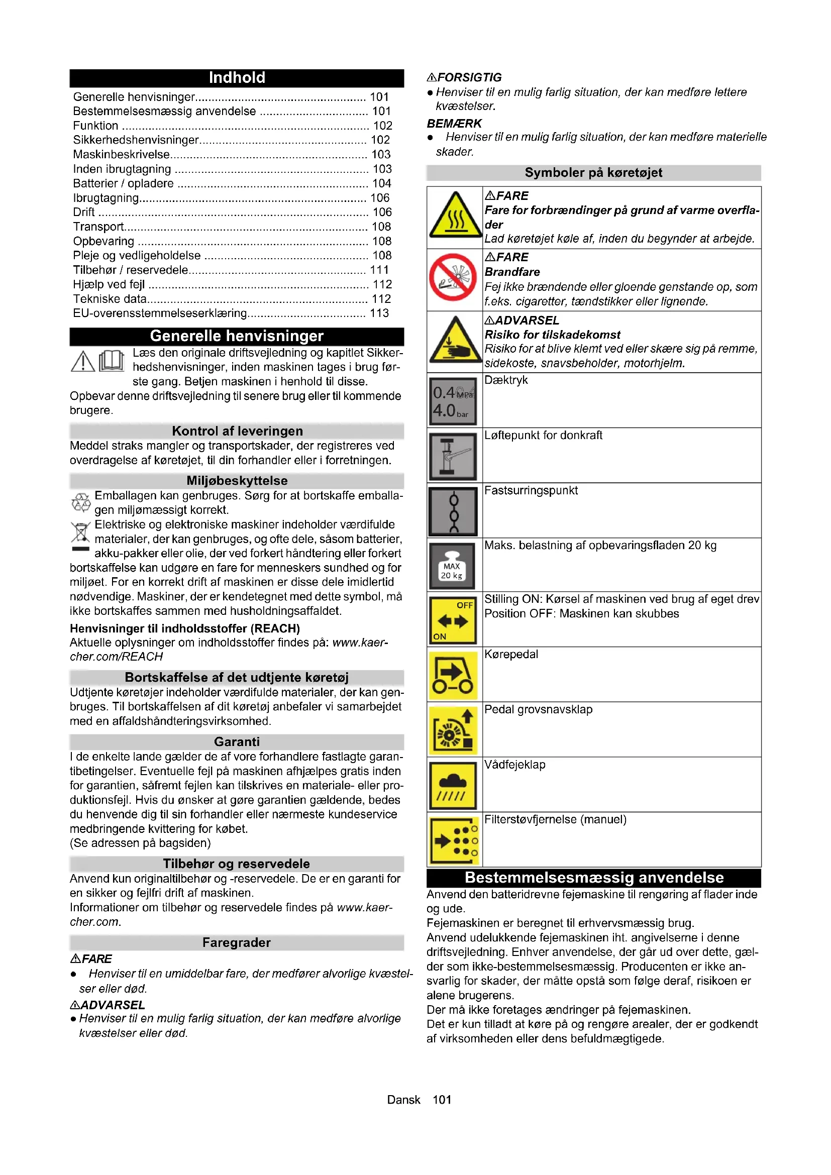 - EU-overensstemmelseserklæring FARE Fare for forbrændinger på grund af varme overfla- der Lad køretøjet køle af, inden du begynder at arbejde. FARE Brandfare Fej ikke brændende eller gloende genstande op, som f.eks. cigaretter, tændstikker eller lignende. 몇 ADVARSEL Risiko for tilskadekomst Risiko for at blive klemt ved eller skære sig på remme, sidekoste, snavsbeholder, motorhjelm. Dæktryk Løftepunkt for donkraft Fastsurringspunkt Maks. belastning af opbevaringsfladen 20 kg Stilling ON: Kørsel af maskinen ved brug af eget drev Position OFF: Maskinen kan skubbes Kørepedal Pedal grovsnavsklap Vådfejeklap Filterstøvfjernelse (manuel) p. 113