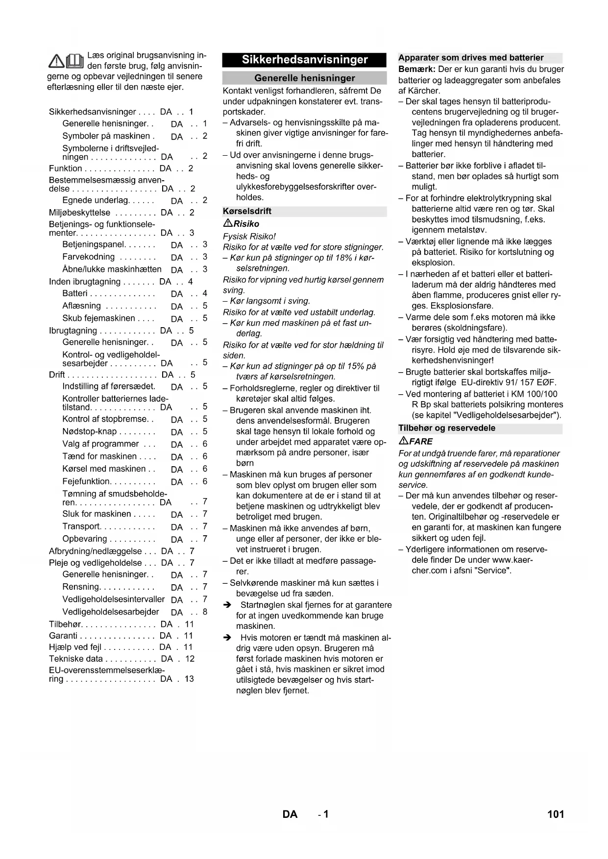 Processo aplicado de avaliação de con- formidade 2000/14/CE: Anexo V Nível de potência acústica dB(A) Medido: 92 Garantido: 94 Chairman of the Board of Management Director Regulatory Affairs & Certification 100 PT- 1 Læs original brugsanvisning in- den første brug, følg anvisnin- gerne og opbevar vejledningen til senere efterlæsning eller til den næste ejer. Kontakt venligst forhandleren, såfremt De under udpakningen konstaterer evt. trans- portskader. – Advarsels- og henvisningsskilte på ma- skinen giver vigtige anvisninger for fare- fri drift. – Ud over anvisningerne i denne brugs- anvisning skal lovens generelle sikker- heds- og ulykkesforebyggelsesforskrifter over- holdes. Risiko Fysisk Risiko! Risiko for at vælte ved for store stigninger. – Kør kun på stigninger op til 18% i kør- selsretningen. Risiko for vipning ved hurtig kørsel gennem sving. – Kør langsomt i sving. Risiko for at vælte ved ustabilt underlag. – Kør kun med maskinen på et fast un- derlag. Risiko for at vælte ved for stor hældning til siden. – Kør kun ad stigninger på op til 15% på tværs af kørselsretningen. – Forholdsreglerne, regler og direktiver til køretøjer skal altid følges. – Brugeren skal anvende maskinen iht. dens anvendelsesformål. Brugeren skal tage hensyn til lokale forhold og under arbejdet med apparatet være op- mærksom på andre personer, især børn – Maskinen må kun bruges af personer som blev oplyst om brugen eller som kan dokumentere at de er i stand til at betjene maskinen og udtrykkeligt blev betroliget med brugen. – Maskinen må ikke anvendes af børn, unge eller af personer, der ikke er ble- vet instrueret i brugen. – Det er ikke tilladt at medføre passage- rer. – Selvkørende maskiner må kun sættes i bevægelse ud fra sæden. Startnøglen skal fjernes for at garantere for at ingen uvedkommende kan bruge maskinen. Hvis motoren er tændt må maskinen al- drig være uden opsyn. Brugeren må først forlade maskinen hvis motoren er gået i stå, hvis maskinen er sikret imod utilsigtede bevægelser og hvis start- nøglen blev fjernet. Bemærk: Der er kun garanti hvis du bruger batterier og ladeaggregater som anbefales af Kärcher. – Der skal tages hensyn til batteriprodu- centens brugervejledning og til bruger- vejledningen fra opladerens producent. Tag hensyn til myndighedernes anbefa- linger med hensyn til håndtering med batterier. – Batterier bør ikke forblive i afladet til- stand, men bør oplades så hurtigt som muligt. – For at forhindre elektrolytkrypning skal batterierne altid være ren og tør. Skal beskyttes imod tilsmudsning, f.eks. igennem metalstøv. – Værktøj eller lignende må ikke lægges på batteriet. Risiko for kortslutning og eksplosion. – I nærheden af et batteri eller et batteri- laderum må der aldrig håndteres med åben flamme, produceres gnist eller ry- ges. Eksplosionsfare. – Varme dele som f.eks motoren må ikke berøres (skoldningsfare). – Vær forsigtig ved håndtering med batte- risyre. Hold øje med de tilsvarende sik- kerhedshenvisninger! – Brugte batterier skal bortskaffes miljø- rigtigt ifølge EU-direktiv 91/ 157 EØF. – Ved montering af batteriet i KM 100/100 R Bp skal batteriets polsikring monteres (se kapitel "Vedligeholdelsesarbejder"). FARE For at undgå truende farer, må reparationer og udskiftning af reservedele på maskinen kun gennemføres af en godkendt kunde- service. – Der må kun anvendes tilbehør og reser- vedele, der er godkendt af producen- ten. Originaltilbehør og -reservedele er en garanti for, at maskinen kan fungere sikkert og uden fejl. – Yderligere informationen om reserve- dele finder De under www.kaer- cher.com i afsni "Service". Sikkerhedsanvisninger . . . . DA . . 1 Generelle henisninger. .