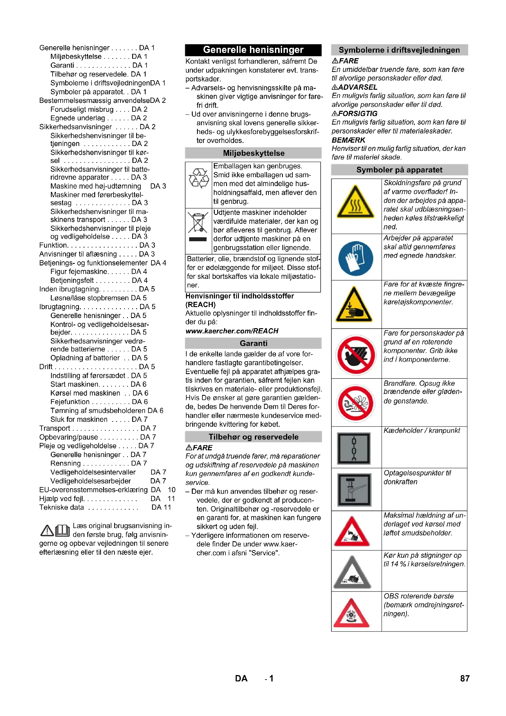 0,1 0,1 Medidas e pesos Comprimento x Largura x Altura mm 2082x1250x1450 2082x1250x1450 Raio de viragem direito mm 1350 1350 Raio de viragem esquerdo mm 1350 1350 Peso em vazio (com/sem bateria) kg 750/1200 750/1200 Peso total admissível kg 1620 1620 Carga permitida sobre o eixo dianteiro kg 797 797 Carga permitida sobre o eixo traseiro kg 823 823 Reservados os direitos a alterações técnicas! 86 PT- 1 Læs original brugsanvisning in- den første brug, følg anvisnin- gerne og opbevar vejledningen til senere efterlæsning eller til den næste ejer. Kontakt venligst forhandleren, såfremt De under udpakningen konstaterer evt. trans- portskader. – Advarsels- og henvisningsskilte på ma- skinen giver vigtige anvisninger for fare- fri drift. – Ud over anvisningerne i denne brugs- anvisning skal lovens generelle sikker- heds- og ulykkesforebyggelsesforskrif- ter overholdes. Henvisninger til indholdsstoffer (REACH) Aktuelle oplysninger til indholdsstoffer fin- der du på: www.kaercher.com/REACH I de enkelte lande gælder de af vore for- handlere fastlagte garantibetingelser. Eventuelle fejl på apparatet afhjælpes gra- tis inden for garantien, såfremt fejlen kan tilskrives en materiale- eller produktionsfejl. Hvis De ønsker at gøre garantien gælden- de, bedes De henvende Dem til Deres for- handler eller nærmeste kundeservice med- bringende kvittering for købet. FARE For at undgå truende farer, må reparationer og udskiftning af reservedele på maskinen kun gennemføres af en godkendt kunde- service. – Der må kun anvendes tilbehør og reser- vedele, der er godkendt af producen- ten. Originaltilbehør og -reservedele er en garanti for, at maskinen kan fungere sikkert og uden fejl. – Yderligere informationen om reserve- dele finder De under www.kaer- cher.com i afsni "Service". FARE En umiddelbar truende fare, som kan føre til alvorlige personskader eller død. 몇 ADVARSEL En muligvis farlig situation, som kan føre til alvorlige personskader eller til død. 몇 FORSIGTIG En muligvis farlig situation, som kan føre til personskader eller til materialeskader. BEMÆRK Henviser til en mulig farlig situation, der kan føre til materiel skade. Generelle henisninger . . . . . . . DA 1 Miljøbeskyttelse . . . . . . . DA 1 Garanti . . . . . . . . . . . . . . DA 1 Tilbehør og reservedele. DA 1 Symbolerne i driftsvejledningenDA 1 Symboler på apparatet. . DA 1 Bestemmelsesmæssig anvendelseDA 2 Forudseligt misbrug . . . . DA 2 Egnede underlag . . . . . . DA 2 Sikkerhedsanvisninger . . . . . . DA 2 Sikkerhedshenvisninger til be- tjeningen . . . . . . . . . . . . DA 2 Sikkerhedshenvisninger til kør- sel . . . . . . . . . . . . . . . . . DA 2 Sikkerhedsanvisninger til batte- ridrevne apparater . . . . . DA 3 Maskine med høj-udtømning DA 3 Maskiner med førerbeskyttel- sestag . . . . . . . . . . . . . . DA 3 Sikkerhedshenvisninger til ma- skinens transport . . . . . . DA 3 Sikkerhedshenvisninger til pleje og vedligeholdelse . . . . . DA 3 Funktion. . . . . . . . . . . . . . . . . . DA 3 Anvisninger til aflæsning . . . . . DA 3 Betjenings- og funktionselementer DA 4 Figur fejemaskine. . . . . . DA 4 Betjeningsfelt . . . . . . . . . DA 4 Inden ibrugtagning. . . . . . . . . . DA 5 Løsne/låse stopbremsen DA 5 Ibrugtagning. . . . . . . . . . . . . . . DA 5 Generelle henisninger . . DA 5 Kontrol- og vedligeholdelsesar- bejder. . . . . . . . . . . . . . . DA 5 Sikkerhedsanvisninger vedrø- rende batterierne . . . . . . DA 5 Opladning af batterier . . DA 5 Drift . . . . . . . . . . . . . . . . . . . . . DA 5 Indstilling af førersædet . DA 5 Start maskinen. . . . . . . . DA 6 Kørsel med maskinen . . DA 6 Fejefunktion . . . . . . . . . . DA 6 Tømning af smudsbeholderen DA 6 Sluk for maskinen . . . . . DA 7 Transport . . . . . . . . . . . . . . . . . DA 7 Opbevaring/pause . . . . . . . . . . DA 7 Pleje og vedligeholdelse . . . . . DA 7 Generelle henisninger . . DA 7 Rensning . . . . . . . . . . . . DA 7 Vedligeholdelsesintervaller DA 7 Vedligeholdelsesarbejder DA 7 EU-overensstemmelses-erklæring DA 10 Hjælp ved fejl. . . . . . . . . . . . . . DA 11 Tekniske data . . . . . . . . . . . . . DA 11 Generelle henisninger Miljøbeskyttelse Emballagen kan genbruges. Smid ikke emballagen ud sam- men med det almindelige hus- holdningsaffald, men aflever den til genbrug. Udtjente maskiner indeholder værdifulde materialer, der kan og bør afleveres til genbrug. Aflever derfor udtjente maskiner på en genbrugsstation eller lignende. Batterier, olie, brændstof og lignende stof- fer er ødelæggende for miljøet. Disse stof- fer skal bortskaffes via lokale miljøstatio- ner. Garanti Tilbehør og reservedele Symbolerne i driftsvejledningen Symboler på apparatet Skoldningsfare på grund af varme overflader! In- den der arbejdes på appa- ratet skal udblæsningsen- heden køles tilstrækkeligt ned. Arbejder på apparatet skal altid gennemføres med egnede handsker. Fare for at kvæste fingre- ne mellem bevægelige køretøjskomponenter. Fare for personskader på grund af en roterende komponenter. Grib ikke ind i komponenterne. Brandfare. Opsug ikke brændende eller gløden- de genstande. Kædeholder / kranpunkt Optagelsespunkter til donkraften Maksimal hældning af un- derlaget ved kørsel med løftet smudsbeholder. Kør kun på stigninger op til 14 % i kørselsretningen. OBS roterende børste (bemærk omdrejningsret- ningen). 87DA- 2 Fejemaskinen er beregnet til rengøring af gulve til industriel brug og f.eks. til følgende anvendelsesområder: Parkeringspladser Produktionsanlæg Logistikområder Hotel Detailhandel Lagerområder Gangstier – Denne fejemaskine er beregnet til fej- ning af tilsmudsede indendørs og uden- dørs arealer. – Maskinen og dens arbejdsanordninger skal kontrolleres med henblik på fejlfri tilstand og driftssikkerhed, inden maski- nen tages i brug. Hvis maskinen ikke er i en fejlfri tilstand, må den ikke benyttes. – Brug fejemaskinen kun i overensstem- melse med angivels