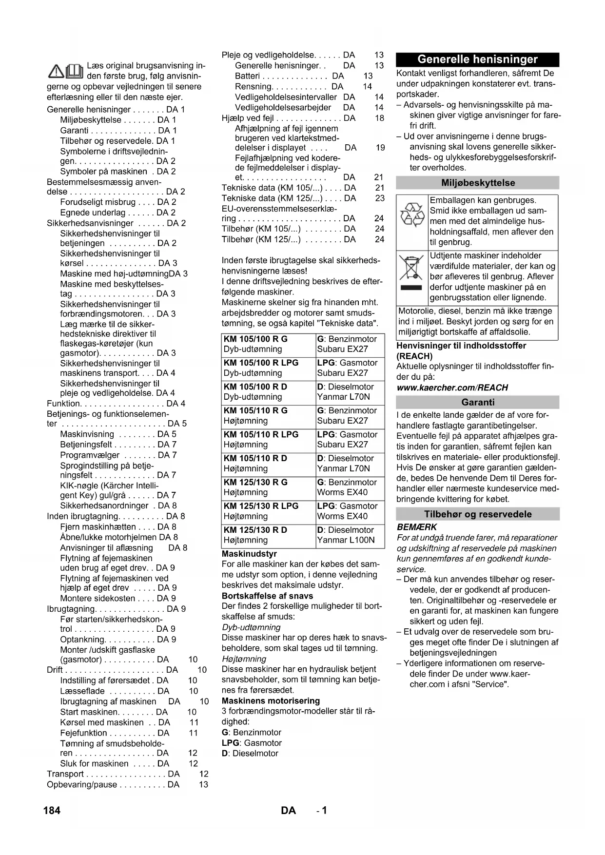 ing)). – El-håndlygterne som bruges i disse rum, skal være udstyret med et lukket og tætnet glaslåg og med en kraftigt sik- kerhedskurv. – Ved arbejder i reparationsværksteder- ne skal flaske- og hovedlukkeventilerne lukkes og drivgasflaskerne skal beskyt- tes imod varme. – Før arbejdspauser og fyraften skal en ansvarlig person kontrollere, om alle ventiler, især flaskeventilerne, er lukket. Arbejder med ild, især svejse- eller skærearbejder, må ikke gennemføres i nærheden af drivgasflasker. Drivgasfla- sker, selv hvis de er tom, må ikke opbe- vares i værkstederne. – Garager, lagerrum som også reparati- onsværksteder skal være godt ventile- ret. Herved skal der tages hensyn til at flydende gas er tungere end luft. Gas samler sig på gulvet, i arbejdsgruber og andre fordybninger og kan der danne eksplosionsfarlige gas-luft-blandinger. – Ved transport skal maskinens motor sættes i stå og maskinen selv skal be- fæstes. Luk brændstofhanen. – Inden maskinen renses eller vedlige- holdes, komponenter udskiftes eller der foretages en omstilling til en anden funktion, skal maskinen slukkes og KIK- nøglen (Kärcher Intelligent Key) træk- kes ud. – Ved arbejder på el-anlægget skal batte- riet udkobles. – Maskinen må ikke rengøres med en vandslange eller højtryksvandstråle (ri- siko for kortslutning eller andre skader). – Istandsættelser må kun gennemføres af den godkendte kundeservice eller fagkyndige personer, som er fortroligt mit alle gældende sikkerhedsbestem- melser. – Sikkerhedskontrollerne ifølge de lokale gældende forskrifter til mobile industri- maskiner skal overholdes. – Arbejder på apparatet skal altid gen- nemføres med egnede handsker. Fejemaskinen arbejder ud fra overthrow- princippet. – Sidebørsterne (3) rengør hjørner og kanter på fejearealet og transporterer snavset ind i fejevalsens bane. – Den roterende fejevalse (4) transporte- rer snavset direkte ind i smudsbeholde- ren (5). – Det støv, der hvirvles op i beholderen, udskilles via et støvfilter (2) og den fil- trerede rene luft suges ud gennem su- geblæseren (1). – Rensning af støvfilteret (2) foretages automatisk. I garager eller lagerrum som også reparationsværksteder Sikkerhedshenvisninger til maskinens transport Sikkerhedshenvisninger til pleje og vedligeholdelse Funktion 187DA- 5 KM 105/100 R (G, LPG, D) KM 105/110 R (G, LPG, D) 1 Betjeningsfelt 2Rat 3 Motorhjelm venstre 4 Åbningsmekanisme hydraulikolietank 5 Hydraulikolietank 6 Pedal for løft/sænk af grovsmudslåge 7 Arbejdslys (option) 8 Venstre sidebørst (option) 9 Forhjul 10 Fastspænding af sidekosten 11 Højre sidebørste 12 Kørepedal 13 Krum-fejekost (option) 14 Holdeskinne for "Homebase" 15 Maskinhætte højre 16 Baghjul 17 Arm til sædejustering 18 Stopbremse 19 Smudsbeholder høj-udtømning (KM 105/110 R) 20 Smudsbeholder dyb-udtømning (KM 105/100 R) 21 Læsseflade 22 Opbevaring cylinderstøtte (sikring høj- udtømning) 23 Støvfilter (fladt foldefilter) 24 Sæde (med sikkerhedsafbryder) 25 Knap for tohåndsbetjening (KM 105/110 R) 26 Bageste tætningsliste 27 Fejevalse 28 Tætningsliste højre side 29 Tætningsliste venstre side 30 Forreste tætningsliste 31 Benzin-/gasmotor 32 Dieselmotor 33 Servicefrit batteri 34 Frigeararm 35 Benzintank 36 NØD-frakobling forbrændingsmotor 37 Sikring starter FU20, 30 A (kun diesel- model) Optionel Følgende udstyr, som enten monteres ved bestilling af fabrikken eller kan monteres senere af kundeservice, vises ikke. – Rundomkring-advarselslys – Vejbeskyttelseskabine med rude og ru- devisker – Vejrbeskyttelseskaleche – Fører-beskyttelsestag – Sidekostafdækning – Komfortsæde Betjenings- og funktionselementer Maskinvisning 188 DA- 6 KM 125/130 R (G, LPG, D) 1 Betjeningsfelt 2Rat 3 Motorhjelm venstre 4 Hydraulikolietank 5 Beskyttelsesgitter oliekøler 6 Venstre sidebørst (option) 7 Pedal for løft/sænk af grovsmudslåge 8 Forhjul 9 Kørepedal 10 Fastspænding af sidekosten 11 Højre sidebørste 12 Krum-fejekost (option) 13 Baghjul 14 Maskinhætte højre 15 Arm til sædejustering 16 Stopbremse 17 Holdeskinne for "Homebase" 18 Smudsbeholder høj-udtømning 19 Sæde (med sikkerhedsafbryder) 20 Holder til gasflasken 21 Gasflaske 22 Sikringssplint 23 Knap for tohåndsbetjening 24 Støvfilter (fladt foldefilter) 25 Opbevaring cylinderstøtte (sikring høj- udtømning) 26 Bageste tætningsliste 27 Fejevalse 28 Tætningsliste venstre side 29 Forreste tætningsliste 30 Tætningsliste højre side 31 Benzin-/gasmotor 32 Servicefrit batteri 33 Benzintank 34 Dieselmotor 35 Frigeararm Optionel Følgende udstyr, som enten monteres ved bestilling af fabrikken eller kan monteres senere af kundeservice, vises ikke. – Rundomkring-advarselslys – Vejbeskyttelseskabine med rude og ru- devisker – Vejrbeskyttelseskaleche – Fører-beskyttelsestag – Sidekostafdækning – Komfortsæde – Arbejdsbelysning 189DA- 7 1 Hovedafbryder Position 0: Maskine er nedlukket Position I: Maskinen er klar til drift. 2 Trykknap sugeblæser med indikator- lampe Lampe lyser: Sugeblæser og filter- rensning deaktiveret: - til fejning af fugtige eller våde gulv, el- ler trælet, tørt smuds som strå, hø osv. Lampe slukket: Sugeblæser og filter- rensning aktiveret (standardindstilling): - til fejning af tørre gulve 3 KIK-nøgle (Kärcher Intelligent Key) gul - operatør grå - arbejdsgruppeleder 4 Visning fejeprogram "ECO" - for glatte gulve ved ringe tilsmudsning Bemærk: Ved hver ibrugtagning af fe- jesystemet er dette fejeprogram stan- dardmæssig aktiveret, selv hvis et andet fejeprogram blev indstillet tidlige- re. Bemærk: Det udvalgte fejeprogram vi- ses på displayet, indstillingen foretages med retningstasterne. 5 Visning fejeprogram "MEDIUM" - for almindelig tilsmudsede gulve 6 Visning fejeprogram "HEAVY" - for stærk tilsmudsede og ujævne gul-