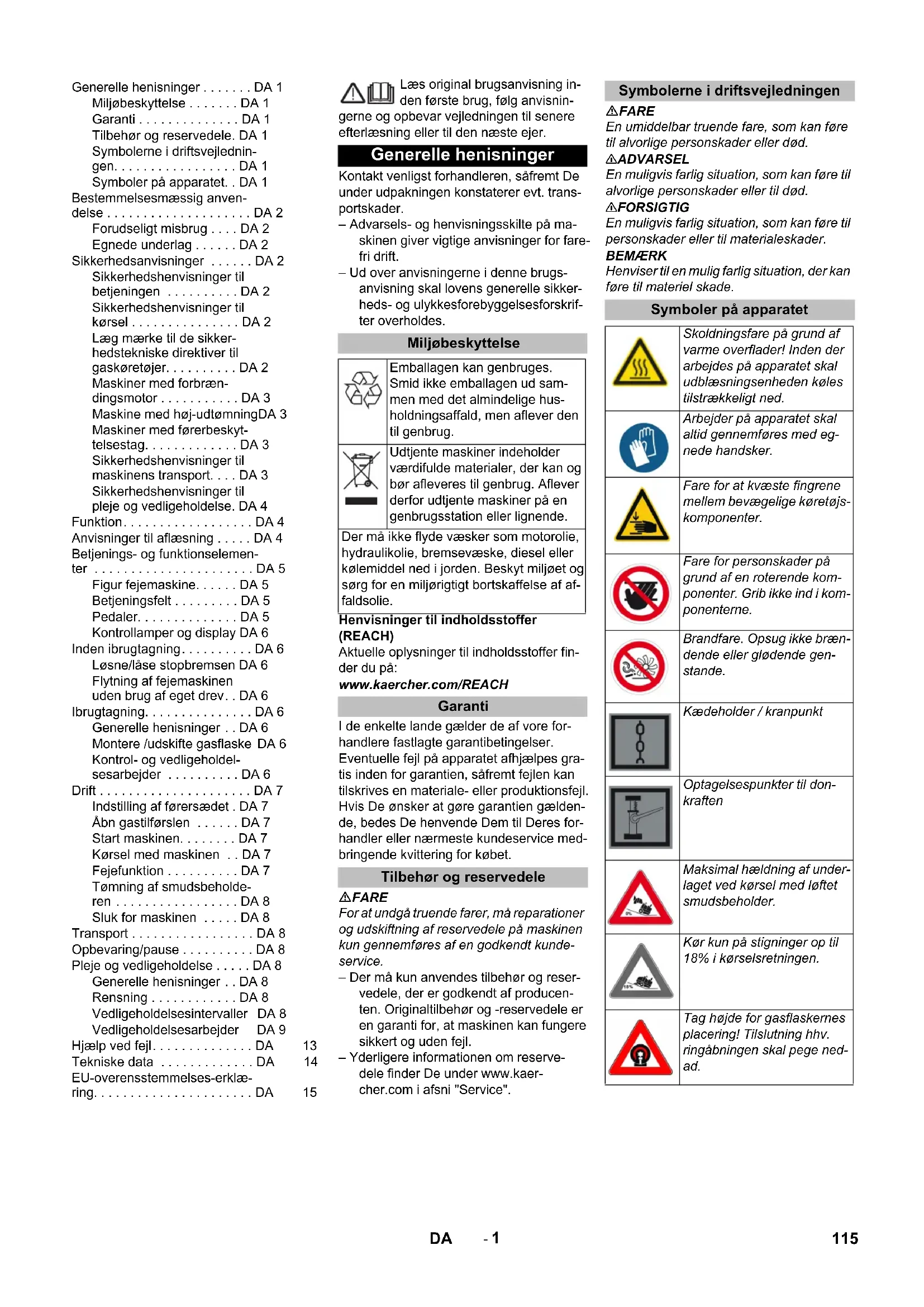 0,1 Medidas e pesos Comprimento x Largura x Altura mm 2082x1250x1450 Raio de viragem direito mm 1350 Raio de viragem esquerdo mm 1350 Peso em vazio kg 851 Peso total admissível kg 1300 Carga permitida sobre o eixo dianteiro kg 787 Carga permitida sobre o eixo traseiro kg 513 Reservados os direitos a alterações técnicas! KM 120/250 R LPG Classic Declaração UE de conformidade Produto: Aparelho de varredura e as- piração com assento Tipo: KM 120/250 R LPG Classic 1.186-001.0 Respectivas Directrizes da UE 2006/42/CE (+2009/127/CE) 2014/30/UE 2000/14/CE Normas harmonizadas aplicadas EN 60335–1 EN 60335–2–72 EN 55012: 2007 + A1: 2009 EN 61000–6–2: 2005 EN 62233: 2008 Processo aplicado de avaliação de con- formidade 2000/14/CE: Anexo V Nível de potência acústica dB(A) Medido: 102 Garantido: 104 Chairman of the Board of Management Director Regulatory Affairs & Certification 114 PT- 1 Læs original brugsanvisning in- den første brug, følg anvisnin- gerne og opbevar vejledningen til senere efterlæsning eller til den næste ejer. Kontakt venligst forhandleren, såfremt De under udpakningen konstaterer evt. trans- portskader. – Advarsels- og henvisningsskilte på ma- skinen giver vigtige anvisninger for fare- fri drift. – Ud over anvisningerne i denne brugs- anvisning skal lovens generelle sikker- heds- og ulykkesforebyggelsesforskrif- ter overholdes. Henvisninger til indholdsstoffer (REACH) Aktuelle oplysninger til indholdsstoffer fin- der du på: www.kaercher.com/REACH I de enkelte lande gælder de af vore for- handlere fastlagte garantibetingelser. Eventuelle fejl på apparatet afhjælpes gra- tis inden for garantien, såfremt fejlen kan tilskrives en materiale- eller produktionsfejl. Hvis De ønsker at gøre garantien gælden- de, bedes De henvende Dem til Deres for- handler eller nærmeste kundeservice med- bringende kvittering for købet. FARE For at undgå truende farer, må reparationer og udskiftning af reservedele på maskinen kun gennemføres af en godkendt kunde- service. – Der må kun anvendes tilbehør og reser- vedele, der er godkendt af producen- ten. Originaltilbehør og -reservedele er en garanti for, at maskinen kan fungere sikkert og uden fejl. – Yderligere informationen om reserve- dele finder De under www.kaer- cher.com i afsni "Service". FARE En umiddelbar truende fare, som kan føre til alvorlige personskader eller død. 몇 ADVARSEL En muligvis farlig situation, som kan føre til alvorlige personskader eller til død. 몇 FORSIGTIG En muligvis farlig situation, som kan føre til personskader eller til materialeskader. BEMÆRK Henviser til en mulig farlig situation, der kan føre til materiel skade. Generelle henisninger . . . . . . . DA 1 Miljøbeskyttelse . . . . . . . DA 1 Garanti . . . . . . . . . . . . . . DA 1 Tilbehør og reservedele. DA 1 Symbolerne i driftsvejlednin- gen. . . . . . . . . . . . . . . . . DA 1 Symboler på apparatet. . DA 1 Bestemmelsesmæssig anven- delse . . . . . . . . . . . . . . . . . . . . DA 2 Forudseligt misbrug . . . . DA 2 Egnede underlag . . . . . . DA 2 Sikkerhedsanvisninger . . . . . . DA 2 Sikkerhedshenvisninger til betjeningen . . . . . . . . . . DA 2 Sikkerhedshenvisninger til kørsel . . . . . . . . . . . . . . . DA 2 Læg mærke til de sikker- hedstekniske direktiver til gaskøretøjer. . . . . . . . . . DA 2 Maskiner med forbræn- dingsmotor . . . . . . . . . . . DA 3 Maskine med høj-udtømningDA 3 Maskiner med førerbeskyt- telsestag. . . . . . . . . . . . . DA 3 Sikkerhedshenvisninger til maskinens transport. . . . DA 3 Sikkerhedshenvisninger til pleje og vedligeholdelse. DA 4 Funktion. . . . . . . . . . . . . . . . . . DA 4 Anvisninger til aflæsning . . . . . DA 4 Betjenings- og funktionselemen- ter . . . . . . . . . . . . . . . . . . . . . . DA 5 Figur fejemaskine. . . . . . DA 5 Betjeningsfelt . . . . . . . . . DA 5 Pedaler. . . . . . . . . . . . . . DA 5 Kontrollamper og display DA 6 Inden ibrugtagning. . . . . . . . . . DA 6 Løsne/låse stopbremsen DA 6 Flytning af fejemaskinen uden brug af eget drev. . DA 6 Ibrugtagning. . . . . . . . . . . . . . . DA 6 Generelle henisninger . . DA 6 Montere /udskifte gasflaske DA 6 Kontrol- og vedligeholdel- sesarbejder . . . . . . . . . . DA 6 Drift . . . . . . . . . . . . . . . . . . . . . DA 7 Indstilling af førersædet . DA 7 Åbn gastilførslen . . . . . . DA 7 Start maskinen. . . . . . . . DA 7 Kørsel med maskinen . . DA 7 Fejefunktion . . . . . . . . . . DA 7 Tømning af smudsbeholde- ren . . . . . . . . . . . . . . . . . DA 8 Sluk for maskinen . . . . . DA 8 Transport . . . . . . . . . . . . . . . . . DA 8 Opbevaring/pause . . . . . . . . . . DA 8 Pleje og vedligeholdelse . . . . . DA 8 Generelle henisninger . . DA 8 Rensning . . . . . . . . . . . . DA 8 Vedligeholdelsesintervaller DA 8 Vedligeholdelsesarbejder DA 9 Hjælp ved fejl. . . . . . . . . . . . . . DA 13 Tekniske data . . . . . . . . . . . . . DA 14 EU-overensstemmelses-erklæ- ring. . . . . . . . . . . . . . . . . . . . . . DA 15 Generelle henisninger Miljøbeskyttelse Emballagen kan genbruges. Smid ikke emballagen ud sam- men med det almindelige hus- holdningsaffald, men aflever den til genbrug. Udtjente maskiner indeholder værdifulde materialer, der kan og bør afleveres til genbrug. Aflever derfor udtjente maskiner på en genbrugsstation eller lignende. Der må ikke flyde væsker som motorolie, hydraulikolie, bremsevæske, diesel eller kølemiddel ned i jorden. Beskyt miljøet og sørg for en miljørigtigt bortskaffelse af af- faldsolie. Garanti Tilbehør og reservedele Symbolerne i driftsvejledningen Symboler på apparatet Skoldningsfare på grund af varme overflader! Inden der arbejdes på apparatet skal udblæsningsenheden køles tilstrækkeligt ned. Arbejder på apparatet skal altid gennemføres med eg- nede handsker. Fare for at kvæste fingrene mellem bevægelige køretøjs- komponenter. Fare for personskader på grund af en roterende kom- ponenter. Grib ikke ind i kom- pone