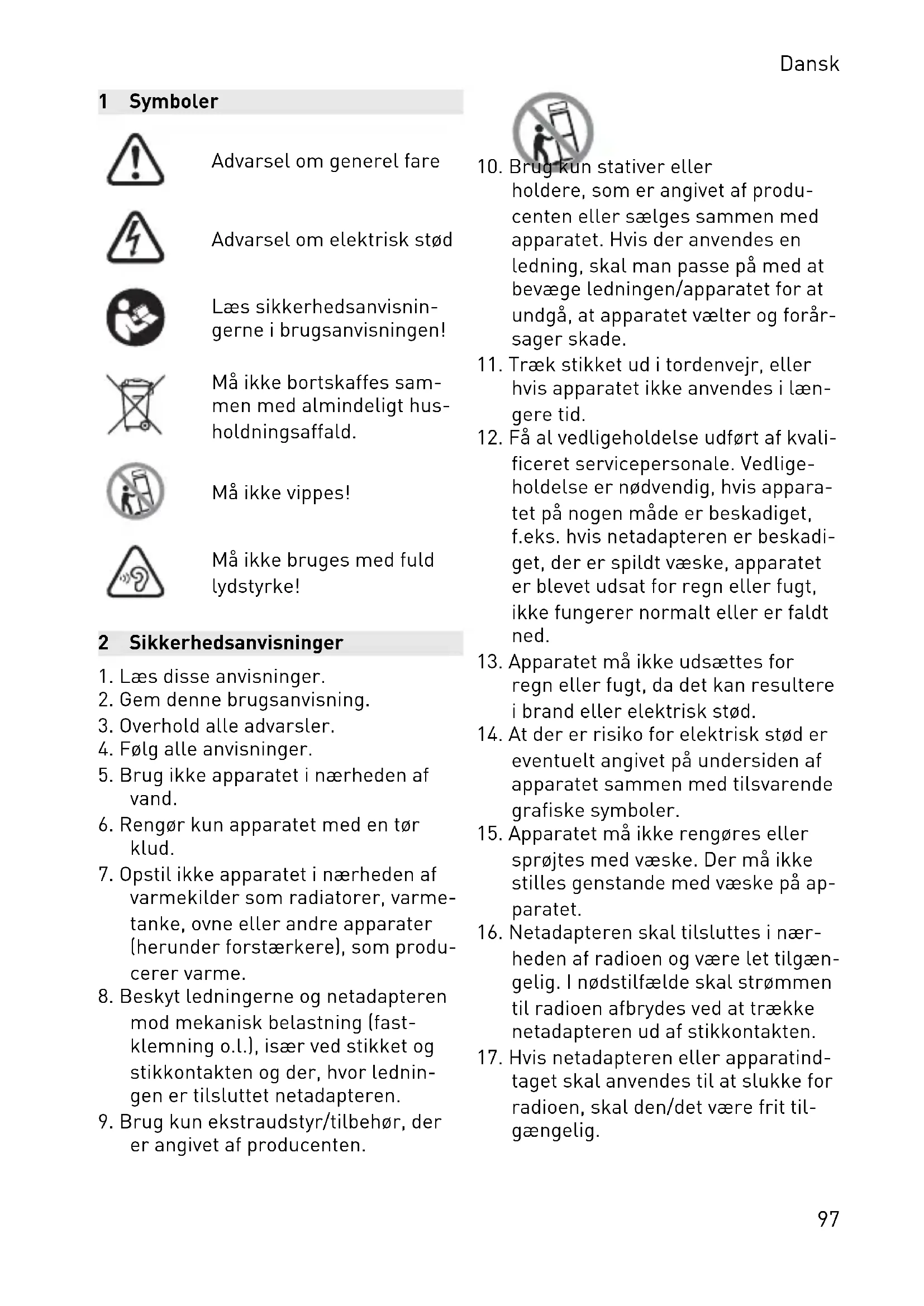 taget skal anvendes til at slukke for radioen, skal den/det være frit til gængelig. Dansk 9718. Udsæt ikke batteriet for høje tempe raturer som f.eks. sol, ild eller lig nende. Læs sikkerhedsanvisningerne til batteriet for flere informationer.