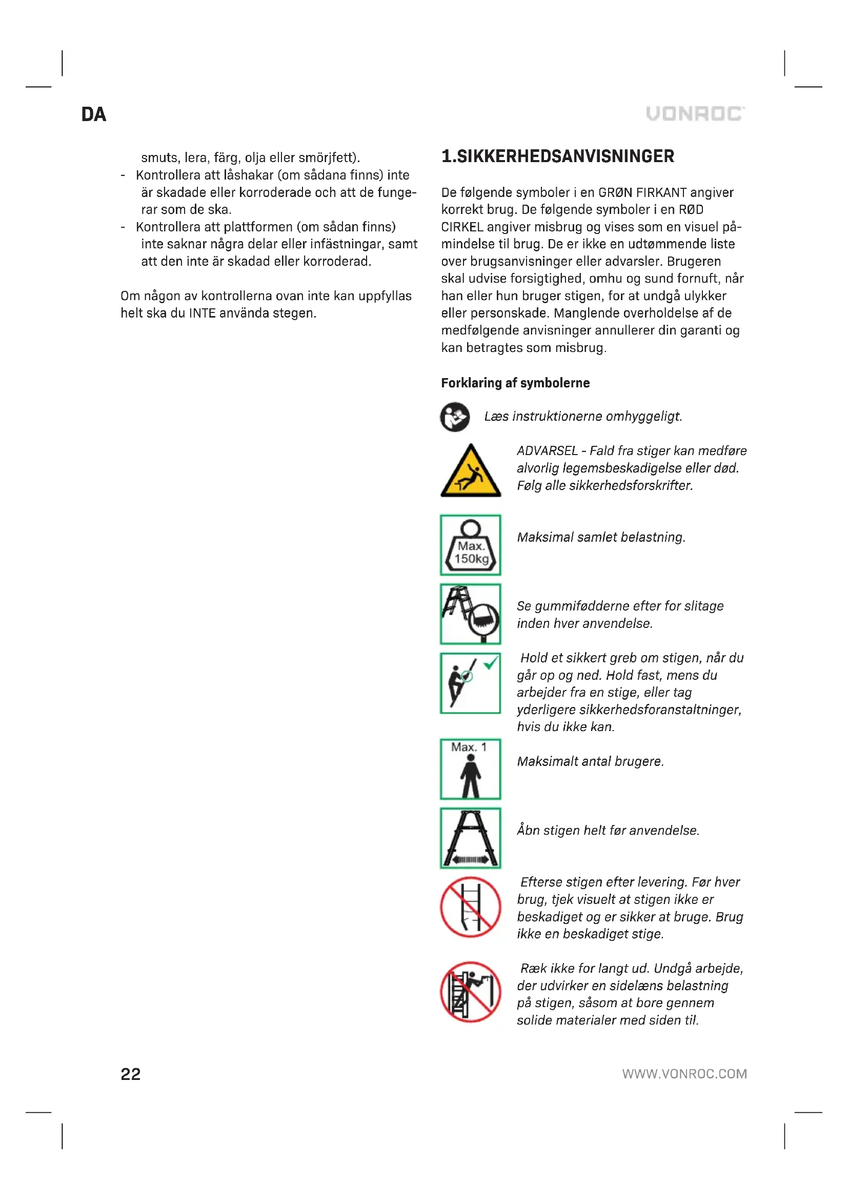 De følgende symboler i en GRØN FIRKANT angiver korrekt brug. De følgende symboler i en RØD CIRKEL angiver misbrug og vises som en visuel på- mindelse til brug. De er ikke en udtømmende liste over brugsanvisninger eller advarsler. Brugeren skal udvise forsigtighed, omhu og sund fornuft, når han eller hun bruger stigen, for at undgå ulykker eller personskade. Manglende overholdelse af de medfølgende anvisninger annullerer din garanti og kan betragtes som misbrug. Forklaring af symbolerne Læs instruktionerne omhyggeligt. ADVARSEL - Fald fra stiger kan medføre alvorlig legemsbeskadigelse eller død. Følg alle sikkerhedsforskrifter. Maksimal samlet belastning. Se gummifødderne efter for slitage inden hver anvendelse. Hold et sikkert greb om stigen, når du går op og ned. Hold fast, mens du arbejder fra en stige, eller tag yderligere sikkerhedsforanstaltninger, hvis du ikke kan. Maksimalt antal brugere. Åbn stigen helt før anvendelse. Efterse stigen efter levering. Før hver brug, tjek visuelt at stigen ikke er beskadiget og er sikker at bruge. Brug ikke en beskadiget stige. Ræk ikke for langt ud. Undgå arbejde, der udvirker en sidelæns belastning på stigen, såsom at bore gennem solide materialer med siden til.DA
