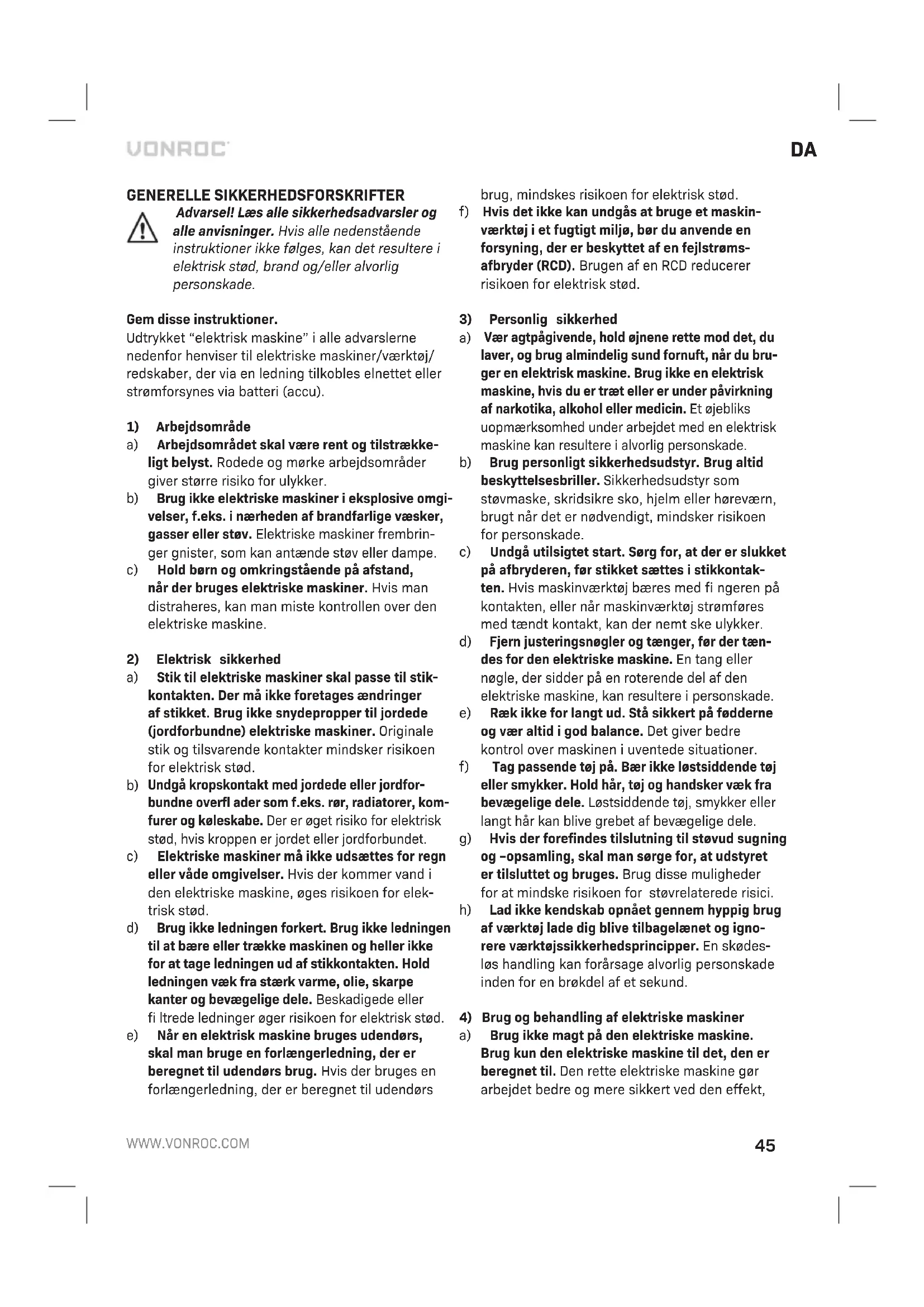 Inden rengøring og vedligeholdelse skal maskinen altid slukkes, og netstikket skal tages ud af stikkontakten. Rengør maskinbeklædningerne regelmæssigt med en blød klud, helst efter hver anvendelse. Sørg for, at der ikke er støv eller snavs i ventilationsåbnin- gerne. Fjern snavs, der sidder meget godt fast, med en blød klud, der er fugtet i sæbevand. Brug ikke opløsningsmidler, som f.eks. benzin, sprit, ammoniak osv. Kemikalier som disse beskadiger de syntetiske komponenter. MILJØ Defekte og/eller bortskaffede elektriske og elektroniske apparater skal afl everes på en passende genbrugsstation. Kun for lande i EU Maskinværktøj må ikke bortskaffes sammen med husholdningsaffald. Ifølge EU-direktiv 2012/19/EU om affald af elektrisk og elektronisk udstyr og dets gennemførelse i den nationale lovgivning skal mas- kinværktøjer, der ikke længere anvendes, afl everes separat og bortskaffes på en miljøvenlig måde. GARANTIVILKÅR VONROC produkter er udviklet efter de højeste kvalitetsstandarder og er garanteret fri for mangler i såvel materialer som udførelse i den lovpligtige periode, der starter fra datoen for det oprindelige køb. Skulle produktet udvikle nogen fejl i løbet af denne periode på grund af defekte materialer og/ eller fabrikationsfejl, så kontakt VONROC direkte. De følgende forhold er udelukket fra denne garanti: