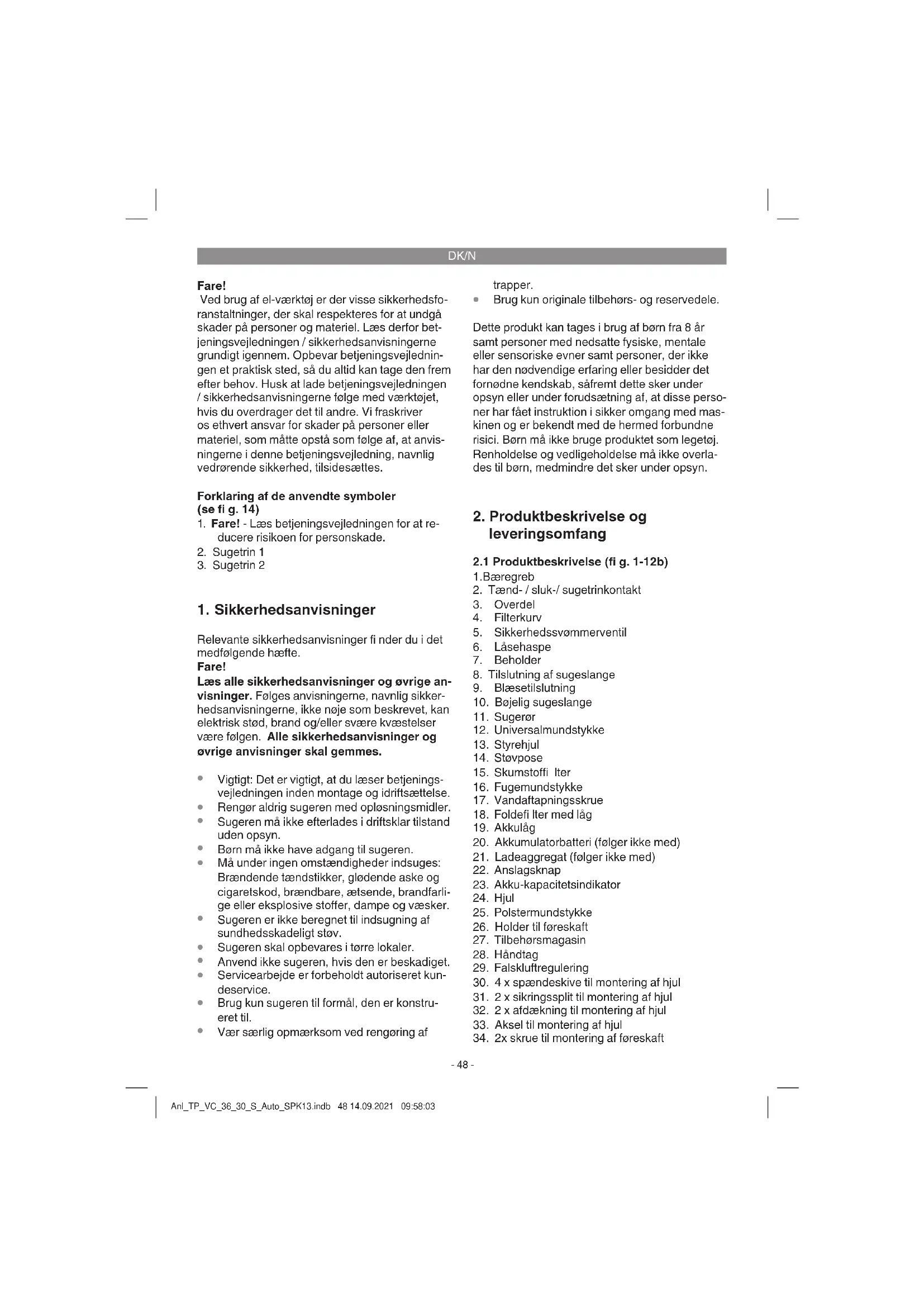 Montering af overdel (fi g. 1, 4) Overdelen (3) er fastgjort til beholderen (7) med lukkehasperne (6). For at tage sugerens overdel (3) af åbnes lukkehasperne (6), og overdelen (3) løftes op. Sørg for, at lukkehasperne (6) går or- dentligt i indgreb, når overdelen (3) sættes på. Montering af hjul (fi g. 5a-5g) Sæt en sikringssplit til hjulmontage (31) gennem hullet i hjulakslen (33), og træk en spændeskive (30), et hjul (24) og en spændeskive hen over hjulakslen (33) (fi g. 5a-5b). Nu skubbes hjulakslen (33) gennem føringerne på undersiden af behol- deren (7) (fi g. 5c). Sæt en spændeskive og det andet hjul (24) på den frie ende af hjulakslen (33), og fi kser det med den anden spændeskive (30) og sikringssplitten (31) (fi g. 5d-5f). Pres afdæknin- gerne (32) på hjulenes (24) yderside, så holde- ansatserne går i indgreb i afdækningerne (32) på Anl_TP_VC_36_30_S_Auto_SPK13.indb 49 14.09.2021 09:58:03DK/N