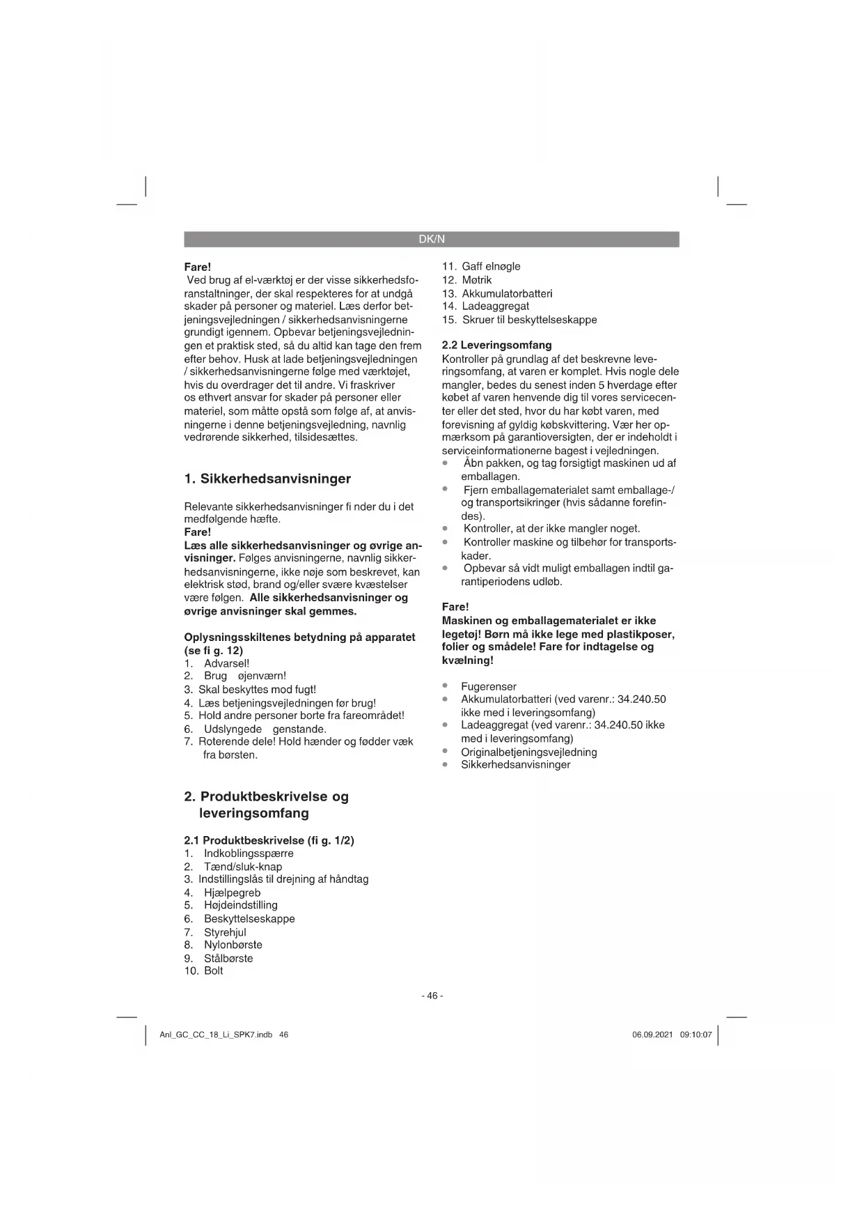 Produktet kører ikke: Kontroller, om akkumulatorbatteriet er ladet op, og om ladeaggregatet fungerer. Hvis produktet ikke fungerer, selv om spænding er til stede, skal du indsende den til den angivne kundeservice. Anl_GC_CC_18_Li_SPK7.indb 49Anl_GC_CC_18_Li_SPK7.indb 49 06.09.2021 09:10:0806.09.2021 09:10:08DK/N