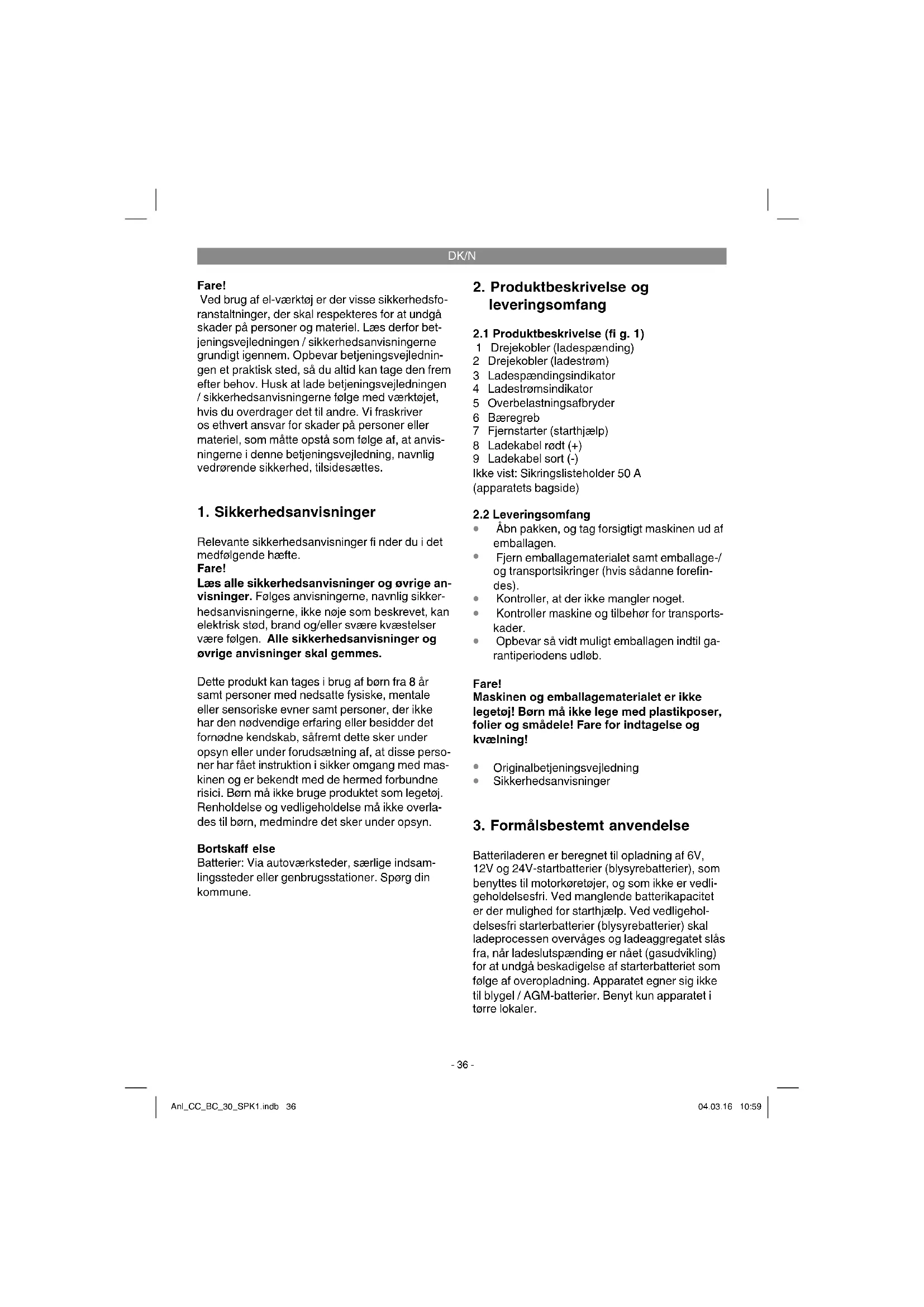 Batteriladeren er beregnet til opladning af 6V, 12V og 24V-startbatterier (blysyrebatterier), som benyttes til motorkøretøjer, og som ikke er vedli- geholdelsesfri. Ved manglende batterikapacitet er der mulighed for starthjælp. Ved vedligehol- delsesfri starterbatterier (blysyrebatterier) skal ladeprocessen overvåges og ladeaggregatet slås fra, når ladeslutspænding er nået (gasudvikling) for at undgå beskadigelse af starterbatteriet som følge af overopladning. Apparatet egner sig ikke til blygel / AGM-batterier. Benyt kun apparatet i tørre lokaler. Anl_CC_BC_30_SPK1.indb 36Anl_CC_BC_30_SPK1.indb 36 04.03.16 10:5904.03.16 10:59DK/N