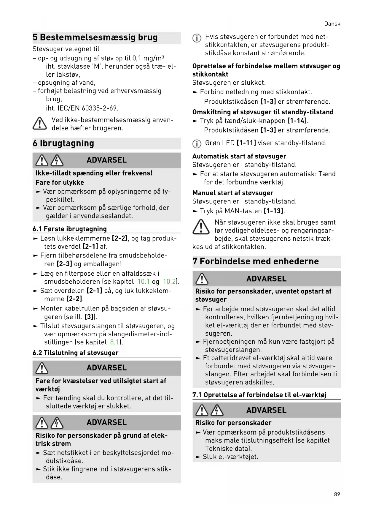 ADVARSEL Risiko for personskader på grund af elek trisk strøm ► Sæt netstikket i en beskyttelsesjordet mo dulstikdåse. ► Stik ikke fingrene ind i støvsugerens stik dåse. Hvis støvsugeren er forbundet med net stikkontakten, er støvsugerens produkt stikdåse konstant strømførende. Oprettelse af forbindelse mellem støvsuger og stikkontakt Støvsugeren er slukket. ► Forbind netledning med stikkontakt. Produktstikdåsen[1-3] er strømførende. Omskiftning af støvsuger til standby-tilstand ► Tryk på tænd/sluk-knappen[1-14]. Produktstikdåsen[1-3] er strømførende. Grøn LED[1-11] viser standby-tilstand. Automatisk start af støvsuger Støvsugeren er i standby-tilstand. ► For at starte støvsugeren automatisk: Tænd for det forbundne værktøj. Manuel start af støvsuger Støvsugeren er i standby-tilstand. ► Tryk på MAN-tasten[1-13]. Når støvsugeren ikke skal bruges samt før vedligeholdelses- og rengøringsar bejde, skal støvsugerens netstik træk kes ud af stikkontakten. 7 Forbindelse med enhederne
