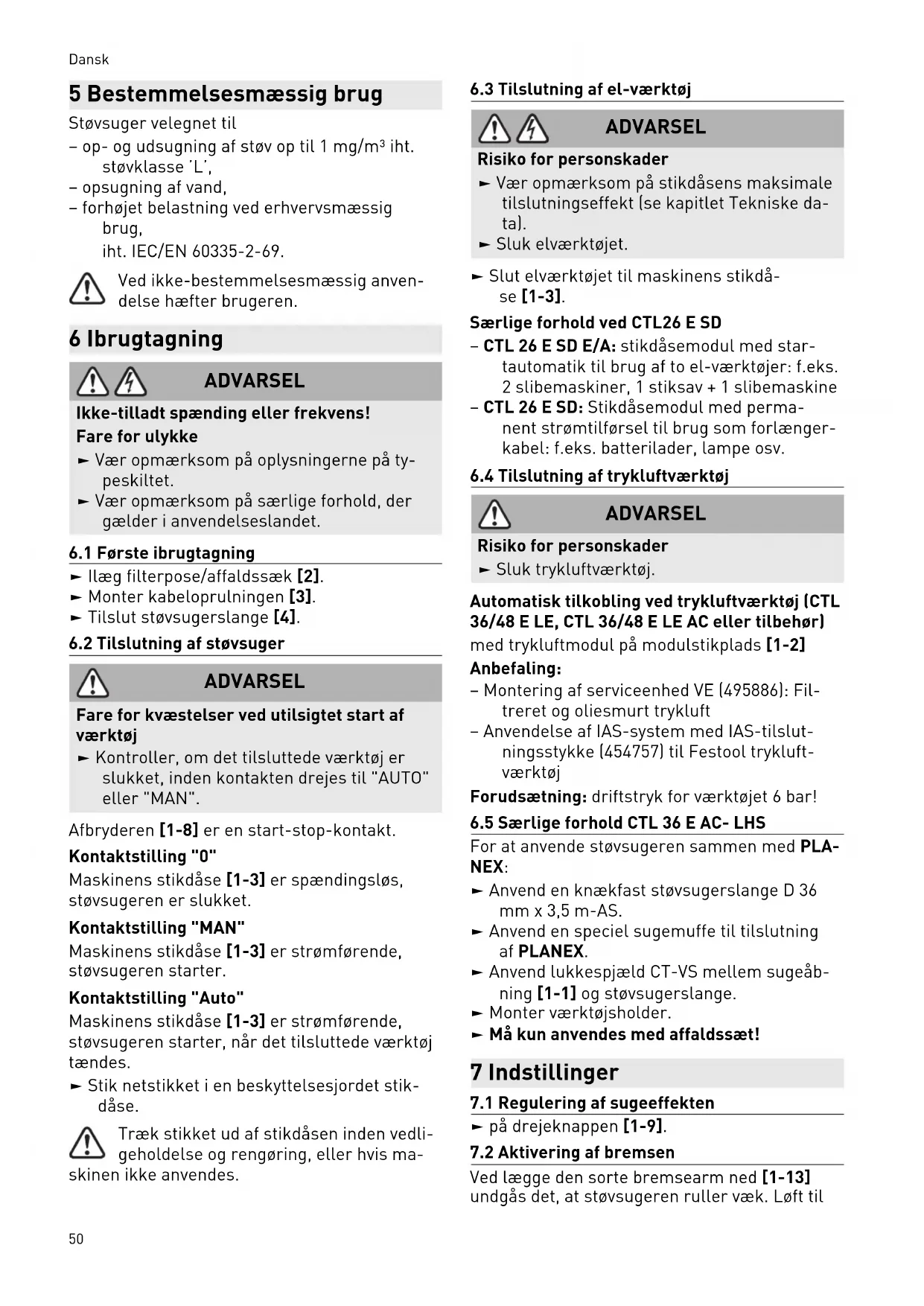 - 10 Miljø 1 Sikkerhedsanvisninger Advarsel! Læs alle sikkerhedsanvisninger og øvrige anvisninger. Overholdes anvisninger ne ikke, er der risiko for elektrisk stød, brand og/eller alvorlige kvæstelser. Opbevar alle sikkerhedsanvisninger og vejled ninger til senere brug. – Denne maskine må ikke bruges af personer (herunder børn) med nedsatte fysiske, sensoriske eller mentale evner eller med manglende erfaring og viden. Børn skal være under opsyn for at sikre, at de ikke le ger med maskinen. – Advarsel: maskinen kan indeholde sund hedsskadeligt støv. Vedligeholdelse, tøm ning, filterskift må kun udføres af en auto riseret fagmand med egnet beskyttelses udstyr. – Må kun anvendes med installeret filtersy stem! – Eksplosions- og brandfare: Opsug ikke: – gnister eller varmt støv; – brændbare eller eksplosive stoffer (f.eks. magnesium, aluminium, benzin, fortyn der); – aggressive stoffer (f.eks. syre, lud, opløs ningsmidler); – kemisk reaktive stoffer, som medfører dannelse af varme, syrer/baser, gasser osv. (f.eks. reaktive tokomponent-mate rialer, aluminium og vand). – Nationale sikkerhedsforskrifter og oplys ninger fra materialeproducenten skal over holdes! – Må kun anvendes med egnet sikkerhedsud styr! – Må kun anvendes i intakt stand konstateret ved visuel kontrol, i tørre omgivelser og ef ter oplæring! – Anvend kun stikdåsen på maskinen til det angivne formål! – Kontroller regelmæssigt stik og kabel for at undgå risici. I tilfælde af beskadigelse skal de udskiftes på et autoriseret kunde værksted. – Må ikke løftes og transporteres med kran krog eller løfteudstyr! – Dette apparat må ikke benyttes af perso ner, der kan reagere følsomt på et elek trisk stød (f.eks. personer med pacema ker ), da statisk opladning af apparatet ikke kan udelukkes. – Brug kun den originale Festool støvsuger slange. – Tag hensyn til arbejdsomgivelserne, og pas på dig selv og andre ved transport el ler arbejde med maskinen. Derved undgår du f.eks. risikoen for at snu ble over støvsugerslangen eller netlednin gen. – Emballagefolie skal være utilgængeligt for børn. Der er risiko for kvælning. – Netstikket må kun sættes i en stikkontakt med jordforbindelse. 2 Symboler Symbol Betydning Advarsel om generel fare Advarsel om elektrisk stød Brugsanvisning, læs sikkerhedsan visningerne! Brug åndedrætsværn! Tip, Bemærk Handlingsanvisning Dansk 48Symbol Betydning Advarsel! Maskinen kan indeholde sundhedsskadeligt støv! Må ikke bortskaffes sammen med almindeligt husholdningsaffald. 3 Maskinelementer [1-1] Sugeåbning [1-2] Udvidelsesenhed (trykluftmodul på CTL 36/48 E LE, CTL 36/48 E LE AC, stikdåsemodul på bei CTL 26 E SD) [1-3] Stikdåse [1-4] Slangeopbevaring [1-5] Håndgreb [1-6] SysDoc [1-7] Automatisk rengøring (kun varianter med AutoClean) [1-8] Kontakt [1-9] Sugekraftregulering [1-10] Lukkeklemme [1-11] Støvbeholder [1-13] Bremse De angivne illustrationer findes i tillægget til brugsanvisningen. 4 Tekniske data Støvsugere Optagen effekt 350 ‑ 1200 W Tilslutningsværdi til maskinens stikdåse maks. p. 52
