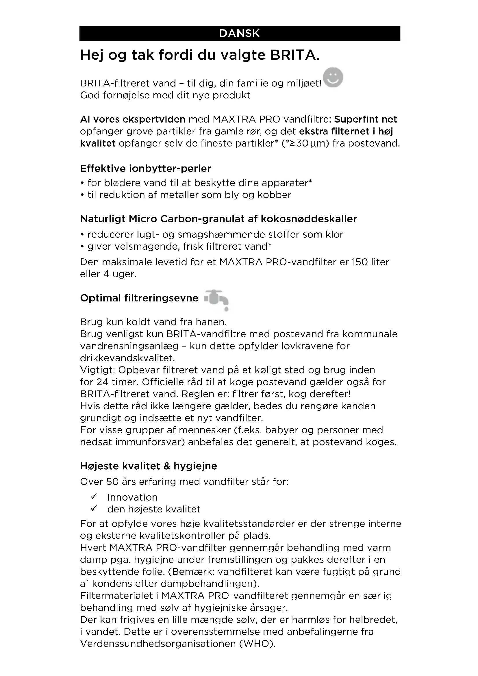 - giver velsmagende, frisk filtreret vand* Den maksimale levetid for et MAXTRA PRO-vandfilter er 150 liter eller 4 uger. Optimal filtreringsevne Brug kun koldt vand fra hanen. Brug venligst kun BRITA-vandfiltre med postevand fra kommunale vandrensningsanlæg – kun dette opfylder lovkravene for drikkevandskvalitet. Vigtigt: Opbevar filtreret vand på et køligt sted og brug inden for 24 timer. Ocielle råd til at koge postevand gælder også for BRITA-filtreret vand. Reglen er: filtrer først, kog derefter! Hvis dette råd ikke længere gælder, bedes du rengøre kanden grundigt og indsætte et nyt vandfilter. For visse grupper af mennesker (f.eks. babyer og personer med nedsat immunforsvar) anbefales det generelt, at postevand koges. Højeste kvalitet & hygiejne Over 50 års erfaring med vandfilter står for: 9 Innovation 9 den højeste kvalitet For at opfylde vores høje kvalitetsstandarder er der strenge interne og eksterne kvalitetskontroller på plads. Hvert MAXTRA PRO-vandfilter gennemgår behandling med varm damp pga. hygiejne under fremstillingen og pakkes derefter i en beskyttende folie. (Bemærk: vandfilteret kan være fugtigt på grund af kondens efter dampbehandlingen). Filtermaterialet i MAXTRA PRO-vandfilteret gennemgår en særlig behandling med sølv af hygiejniske årsager. Der kan frigives en lille mængde sølv, der er harmløs for helbredet, i vandet. Dette er i overensstemmelse med anbefalingerne fra Verdenssundhedsorganisationen (WHO).BRITA anbefaler at udskifte vandfilteret regelmæssigt. Følg venligst de anbefalede rengøringsprocedurer og råd om klargøring af filteret (kapitel 1 – 7). Kanden bør rengøres regelmæssigt. Bemærk: Hvis kanden ikke bruges i et stykke tid, skal du fjerne vandfilteret, tømme kanden og sætte vandfilteret løst i den tomme tragt. Se kapitel 7 “Udskiftning af MAXTRA PRO-vandfilter”. Nem betjening