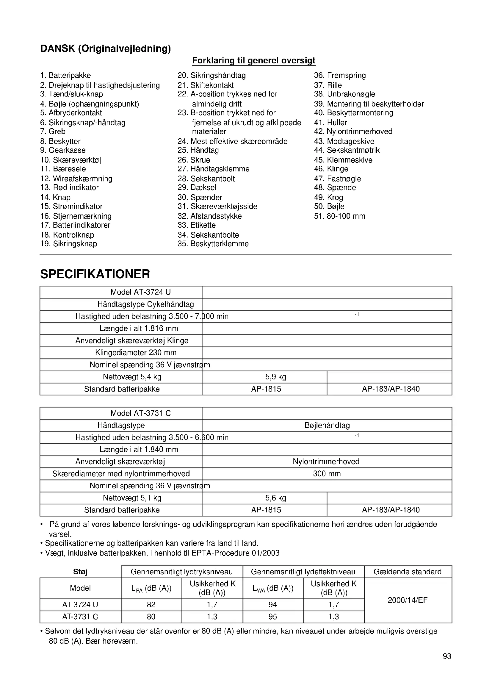 Længde i alt 1.816 mm Anvendeligt skæreværktøj Klinge Klingediameter 230 mm Nominel spænding 36 V jævnstrøm Nettovægt 5,4 kg 5,9 kg Standard batteripakke AP-1815 AP-183/AP-1840 Model AT-3731 C Håndtagstype Bøjlehåndtag Hastighed uden belastning 3.500 - 6.600 min