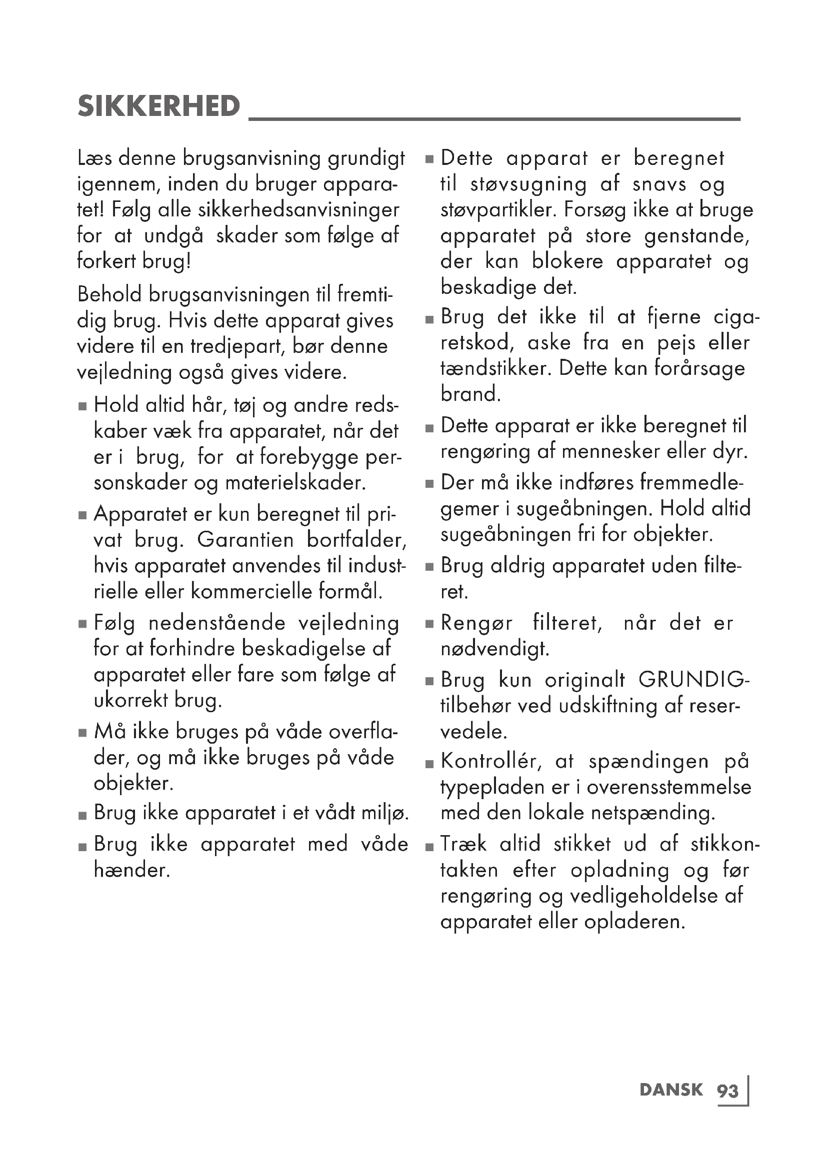 Vores GRUNDIG hushold- ningsapparater opfylder alle gældende sikkerhedsstandarder, og skal, hvis apparatet eller led- ningen er beskadiget, udskiftes af forhandleren, et servicecenter eller en tilsvarende kvalificeret og autoriseret servicetekniker for at undgå, at der opstår fare. Forkert eller ukvalificeret reparationsar- bejde kan forårsage fare og risiko for brugeren.