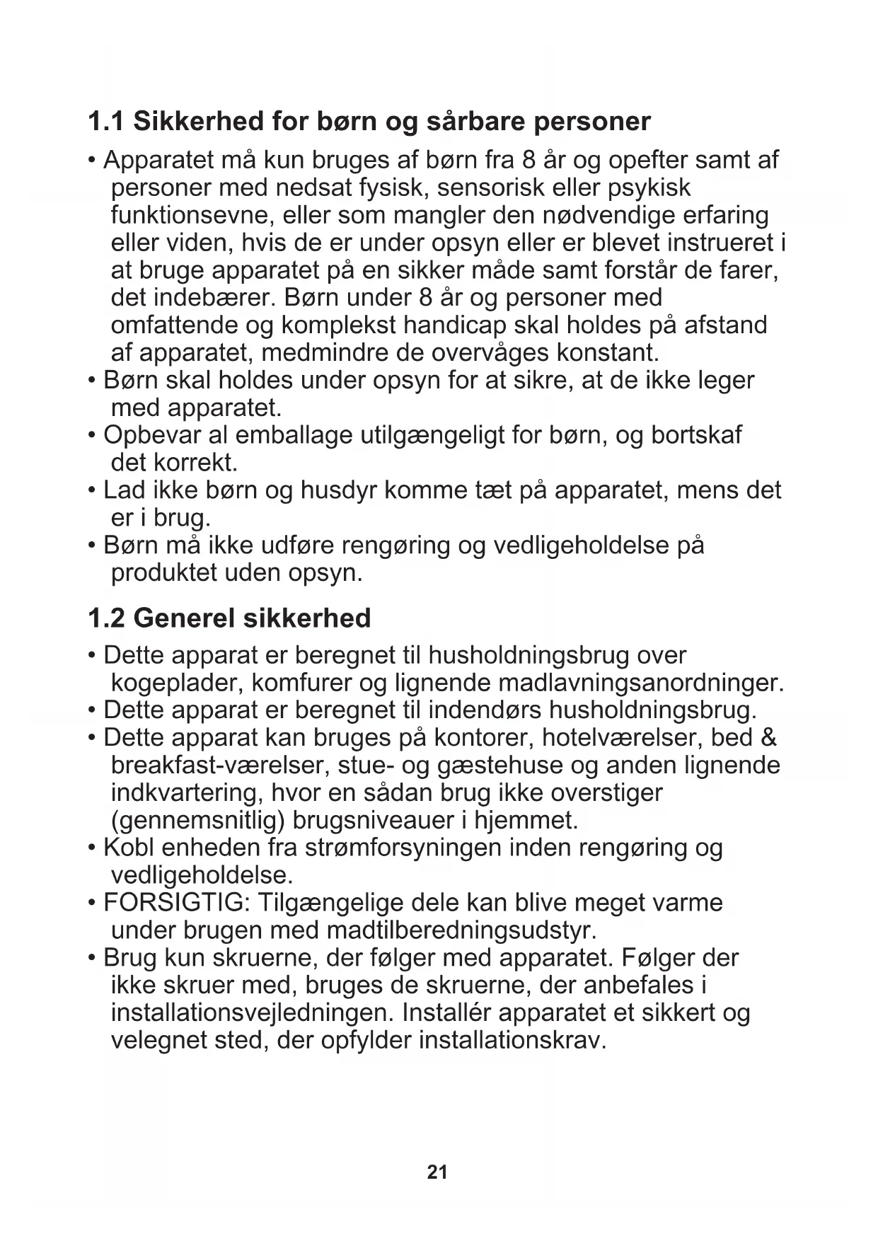 ADVARSEL! Risiko for personskade, forbrændinger og elektrisk stød. 23• Dette apparat må kun anvendes til tilberedning af fødevarer. Brug ikke apparatet til andet.