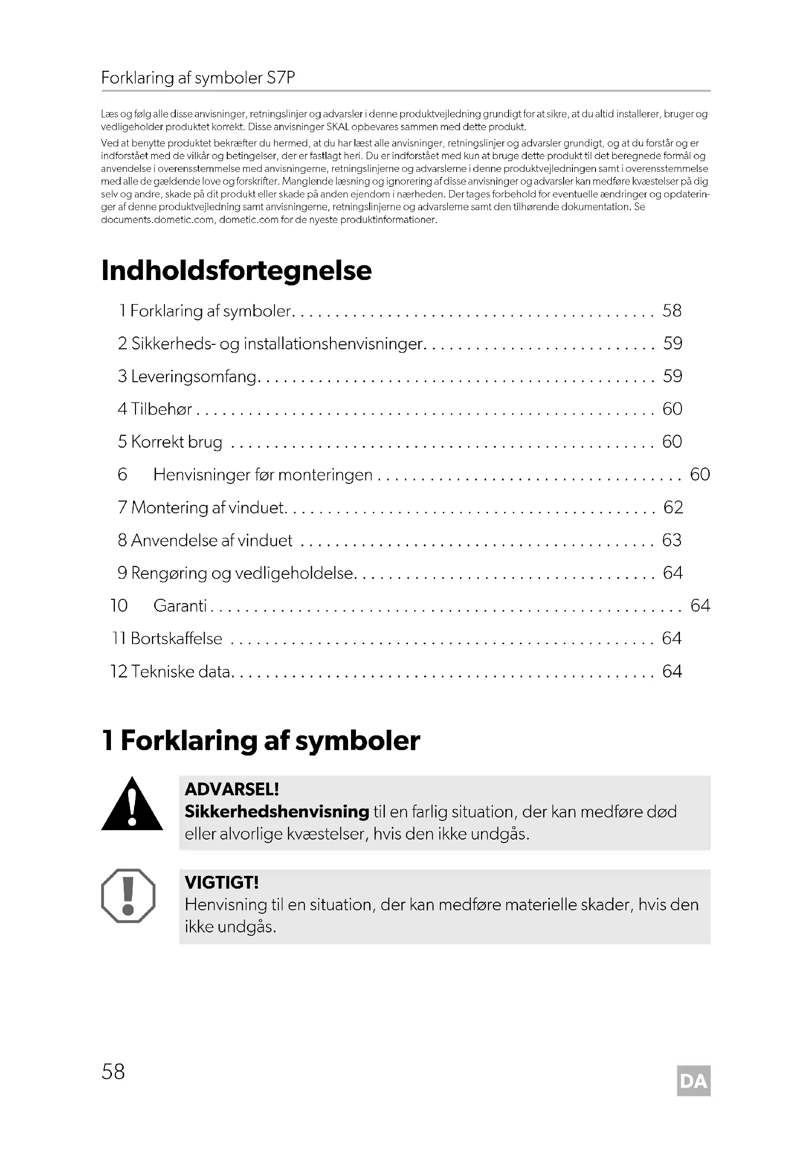 - Læs og følg alle disse anvisninger, retningslinjer og advarsler i denne produktvejledning grundigt for at sikre, at du altid installerer, bruger og vedligeholder produktet korrekt. Disse anvisninger SKAL opbevares sammen med dette produkt. Ved at benytte produktet bekræfter du hermed, at du har læst alle anvisninger, retningslinjer og advarsler grundigt, og at du forstår og er indforstået med de vilkår og betingelser, der er fastlagt heri. Du er indforstået med kun at bruge dette produkt til det beregnede formål og anvendelse i overensstemmelse med anvisningerne, retningslinjerne og advarslerne i denne produktvejledningen samt i overensstemmelse med alle de gældende love og forskrifter. Manglende læsning og ignorering af disse anvisninger og advarsler kan medføre kvæstelser på dig selv og andre, skade på dit produkt eller skade på anden ejendom i nærheden. Der tages forbehold for eventuelle ændringer og opdaterin- ger af denne produktvejledning samt anvisningerne, retningslinjerne og advarslerne samt den tilhørende dokumentation. Se documents.dometic.com, dometic.com for de nyeste produktinformationer. Indholdsfortegnelse 1 Forklaring af symboler p. 58