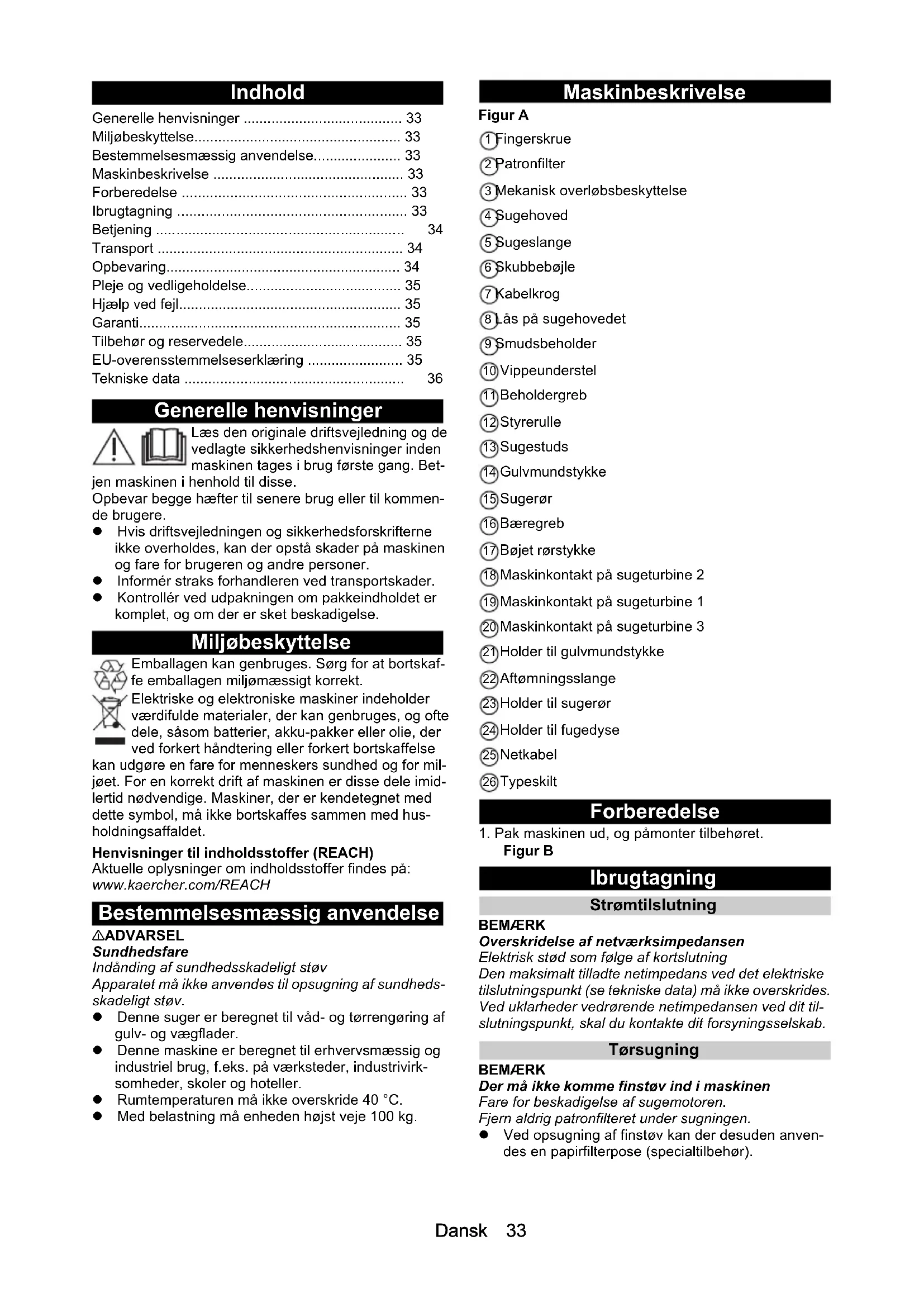 H05VV-F 2x1,5 H05VV-F 2x1,5 Referência (EU) 6.647-069.0 6.647-069.0 Comprimento do cabo m 10 10Dansk 33 Indhold Generelle henvisninger Læs den originale driftsvejledning og de vedlagte sikkerhedshenvisninger inden maskinen tages i brug første gang. Bet- jen maskinen i henhold til disse. Opbevar begge hæfter til senere brug eller til kommen- de brugere. Hvis driftsvejledningen og sikkerhedsforskrifterne ikke overholdes, kan der opstå skader på maskinen og fare for brugeren og andre personer. Informér straks forhandleren ved transportskader. Kontrollér ved udpakningen om pakkeindholdet er komplet, og om der er sket beskadigelse. Miljøbeskyttelse Emballagen kan genbruges. Sørg for at bortskaf- fe emballagen miljømæssigt korrekt. Elektriske og elektroniske maskiner indeholder værdifulde materialer, der kan genbruges, og ofte dele, såsom batterier, akku-pakker eller olie, der ved forkert håndtering eller forkert bortskaffelse kan udgøre en fare for menneskers sundhed og for mil- jøet. For en korrekt drift af maskinen er disse dele imid- lertid nødvendige. Maskiner, der er kendetegnet med dette symbol, må ikke bortskaffes sammen med hus- holdningsaffaldet. Henvisninger til indholdsstoffer (REACH) Aktuelle oplysninger om indholdsstoffer findes på: www.kaercher.com/REACH Bestemmelsesmæssig anvendelse 몇 ADVARSEL Sundhedsfare Indånding af sundhedsskadeligt støv Apparatet må ikke anvendes til opsugning af sundheds- skadeligt støv. Denne suger er beregnet til våd- og tørrengøring af gulv- og vægflader. Denne maskine er beregnet til erhvervsmæssig og industriel brug, f.eks. på værksteder, industrivirk- somheder, skoler og hoteller. Rumtemperaturen må ikke overskride 40 °C. Med belastning må enheden højst veje 100 kg. Maskinbeskrivelse Figur A 1 Fingerskrue 2 Patronfilter 3 Mekanisk overløbsbeskyttelse 4 Sugehoved 5 Sugeslange 6 Skubbebøjle 7 Kabelkrog 8 Lås på sugehovedet 9 Smudsbeholder 10 Vippeunderstel 11 Beholdergreb 12 Styrerulle 13 Sugestuds 14 Gulvmundstykke 15 Sugerør 16 Bæregreb 17 Bøjet rørstykke 18 Maskinkontakt på sugeturbine 2 19 Maskinkontakt på sugeturbine 1 20 Maskinkontakt på sugeturbine 3 21 Holder til gulvmundstykke 22 Aftømningsslange 23 Holder til sugerør 24 Holder til fugedyse 25 Netkabel 26 Typeskilt Forberedelse