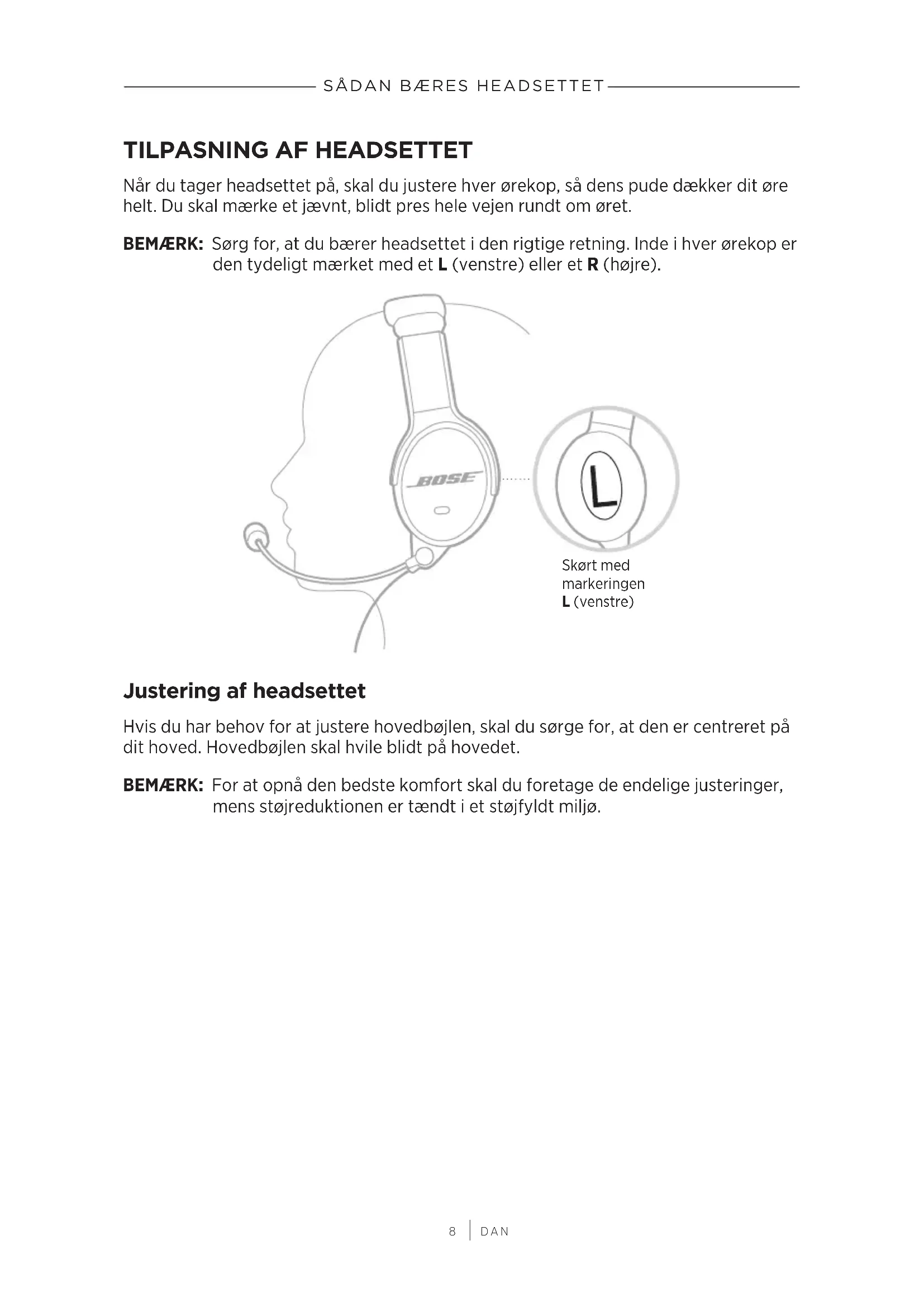 Når du tager headsettet på, skal du justere hver ørekop, så dens pude dækker dit øre helt. Du skal mærke et jævnt, blidt pres hele vejen rundt om øret. BEMÆRK: Sørg for, at du bærer headsettet i den rigtige retning. Inde i hver ørekop er den tydeligt mærket med et L (venstre) eller et R (højre). Skørt med markeringen L(venstre) Justering af headsettet Hvis du har behov for at justere hovedbøjlen, skal du sørge for, at den er centreret på dit hoved. Hovedbøjlen skal hvile blidt på hovedet. BEMÆRK: For at opnå den bedste komfort skal du foretage de endelige justeringer, mens støjreduktionen er tændt i et støjfyldt miljø.9
