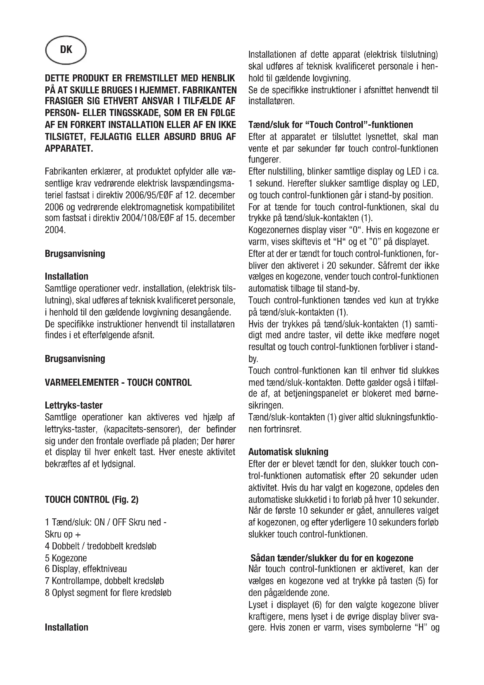 Lettryks-taster Samtlige operationer kan aktiveres ved hjælp af lettryks-taster, (kapacitets-sensorer), der befinder sig under den frontale overflade på pladen; Der hører et display til hver enkelt tast. Hver eneste aktivitet bekræftes af et lydsignal. TOUCH CONTROL (Fig. 2) 1 Tænd/sluk: ON / OFF Skru ned - Skru op + 4 Dobbelt / tredobbelt kredsløb 5 Kogezone 6 Display, effektniveau 7 Kontrollampe, dobbelt kredsløb 8 Oplyst segment for flere kredsløb Installation Installationen af dette apparat (elektrisk tilslutning) skal udføres af teknisk kvalificeret personale i hen- hold til gældende lovgivning. Se de specifikke instruktioner i afsnittet henvendt til installatøren. Tænd/sluk for “Touch Control”-funktionen Efter at apparatet er tilsluttet lysnettet, skal man vente et par sekunder før touch control-funktionen fungerer. Efter nulstilling, blinker samtlige display og LED i ca. 1 sekund. Herefter slukker samtlige display og LED, og touch control-funktionen går i stand-by position. For at tænde for touch control-funktionen, skal du trykke på tænd/sluk-kontakten (1). Kogezonernes display viser “0“. Hvis en kogezone er varm, vises skiftevis et “H“ og et ”0” på displayet. Efter at der er tændt for touch control-funktionen, for- bliver den aktiveret i 20 sekunder. Såfremt der ikke vælges en kogezone, vender touch control-funktionen automatisk tilbage til stand-by. Touch control-funktionen tændes ved kun at trykke på tænd/sluk-kontakten (1). Hvis der trykkes på tænd/sluk-kontakten (1) samti- digt med andre taster, vil dette ikke medføre noget resultat og touch control-funktionen forbliver i stand- by. Touch control-funktionen kan til enhver tid slukkes med tænd/sluk-kontakten. Dette gælder også i tilfæl- de af, at betjeningspanelet er blokeret med børne- sikringen. Tænd/sluk-kontakten (1) giver altid slukningsfunktio- nen fortrinsret. Automatisk slukning Efter der er blevet tændt for den, slukker touch con- trol-funktionen automatisk efter 20 sekunder uden aktivitet. Hvis du har valgt en kogezone, opdeles den automatiske slukketid i to forløb på hver 10 sekunder. Når de første 10 sekunder er gået, annulleres valget af kogezonen, og efter yderligere 10 sekunders forløb slukker touch control-funktionen. Sådan tænder/slukker du for en kogezone Når touch control-funktionen er aktiveret, kan der vælges en kogezone ved at trykke på tasten (5) for den pågældende zone. Lyset i displayet (6) for den valgte kogezone bliver kraftigere, mens lyset i de øvrige display bliver sva- gere. Hvis zonen er varm, vises symbolerne “H” og DK“0” skiftevis. Ved at trykke på tasten SKRU OP (3) eller SKRU NED (2), kan man vælge kogeniveau, hvorefter zonen be- gynder at varme op. Når du har valgt en kogezone, kan du indstille koge- niveauet ved at trykke og holde på tasten SKRU OP (3). Med niveau 1 som udgangspunkt øges effekten med 1 enhed pr. 0,4 sekund. Niveau 9 udgør det hø- jeste kogeniveau. Hvis kogeniveauet er blevet sat med tasten SKRU NED (2), vil udgangspunktet være niveau “9”, (mak- simal effekt). Når man trykker og holder på tasten, reduceres kogeniveauet med 1 enhed pr. 0,4 sekund. Når der nås ned på niveau 0, kan effekten ikke re- duceres yderligere. Kun ved igen at trykke på tasten SKRU NED (2) eller SKRU OP (3) bliver det igen muligt at regulere kogeniveauet. Sådan slukker du for en kogezone Du vælger den kogezone, du gerne vil slukke for, med den tilsvarende tast (5). Lyset i displayet (6) for den valgte kogezone bliver kraftigere, mens lyset i de øvrige display bliver svagere. Ved at trykke på taster- ne SKRU OP (3) og SKRU NED (2) samtidigt, indstilles kogezonens kogeniveau på ”0”. Alternativt kan man bruge tasten SKRU NED (2) til at reducere kogeni- veauet til 0. Hvis en kogezone er varm, vises symbolerne “H” og “0” skiftevis. Sådan slukker du for alle kogezonerne Ved at trykke på tænd/sluk-kontakten (1) kan du med øjeblikkelig virkning slukke for alle kogezonerne. I stand-by vises der et “H“ i displayet for alle de ko- gezoner, som er varme. Alle øvrige display forbliver slukket. Kogeniveau Kogezonernes styrke kan indstilles på 9 forskellige niveauer, der angives med tallene fra “1“ til “9“ på LED-displayene (6) med syv segmenter. Indikator for restvarme Denne indikator viser brugeren, at den glaskeramis- ke zone har en temperatur, der er farlig, hvis du rører området over kogezonerne. Temperaturen beregnes ved hjælp af en matematisk model, og i tilfælde af at der er restvarme til stede, vises dette med et “H” på det pågældende display med 7 segmenter. Opvarmningen og afkølingen beregnes på basis af: