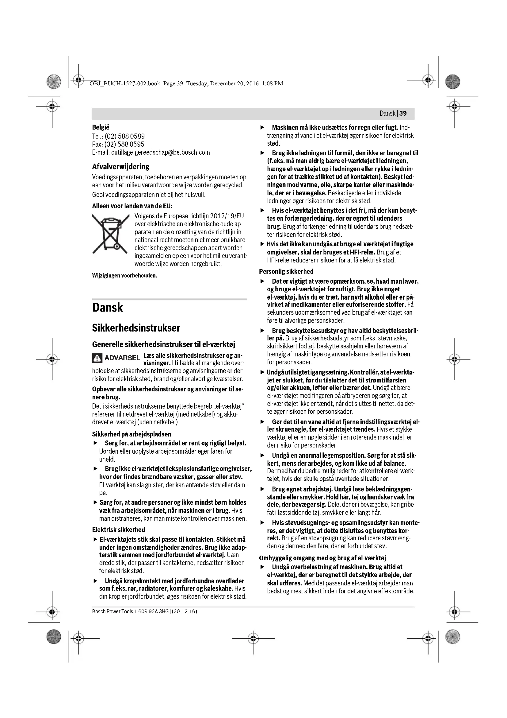lbs 2,6 5,7 2,6 5,7 Isolatieklasse /I /I OBJ_BUCH-1527-002.book Page 37 Tuesday, December 20, 2016 1:08 PM38 | Nederlands 1 609 92A 3HG | (20.12.16) Bosch Power Tools Gebruik Ingebruikneming Voedingsapparaat in- en uitschakelen PUC-EXACT (zie afbeelding C) U moet eerst het voedingsapparaat PUC-EXACT inschakelen voordat u het elektrische gereedschap C-EXACT kunt inscha- kelen (zie „Aansluiting op de energievoorziening”, pagina 37). Voor het inschakelen van de voedingseenheid zet u de aan/uit-schakelaar 2 op de voedingseenheid in stand 1. De groen oplichtende LED-aanduiding 3 geeft aan, wanneer de voedingseenheid gereed is voor gebruik. PUC-EXACT 1: brandt de LED-aanduiding 4, dan is er sprake van een storing. Als u het voedingsapparaat wilt uitschakelen, duwt u de aan/uit-schakelaar van het voedingsapparaat 2 in stand 0. Om energie te sparen, schakelt u de voedingseenheid alleen in als u deze gebruikt. Elektrisch gereedschap in- en uitschakelen Elektrische rechte schroevendraaier met hendelstart (zie afbeelding D) Als u het elektrische gereedschap wilt inschakelen, drukt u de aan/uit-schakelaar 2 in tot deze niet meer verder kan. Het elektrische gereedschap wordt automatisch uitgescha- keld zodra het ingestelde draaimoment bereikt is. Als u de aan/uit-schakelaar 2 te vroeg loslaat, wordt het vooraf ingestelde draaimoment niet bereikt. Elektrische rechte schroevendraaier met duwstart Als u het elektrische gereedschap wilt inschakelen, plaatst u het inzetgereedschap op de schroef en oefent u een lichte druk axiaal op de schroevendraaier uit. Het elektrische gereedschap wordt automatisch uitgescha- keld zodra het ingestelde draaimoment bereikt is. Als de schroevendraaier te vroeg wordt ontlast, bij- voorbeeld wanneer het inzetgereedschap van de schroef glijdt, wordt het vooraf ingestelde draaimo- ment niet bereikt. Tips voor de werkzaamheden Let er tijdens de werkzaamheden op dat het voedingsappa- raat niet per ongeluk van het werkblad wordt getrokken. Be- vestig het voedingsapparaat stevig aan de muur of leg de aan- sluitkabel zo neer dat u er niet over kunt struikelen. Beveiliging tegen overbelasting (PUC-EXACT 1) Bij overbelasting van het voedingsapparaat gaat de LED-indi- catie 4 branden en signaleert deze een storing. Staak uw werkzaamheden. Schakel de schroevendraaier en het voedingsapparaat uit. Controleer de schroevendraaier en de apparaatkabel. Ver- vang defecte onderdelen. Neem vervolgens het voedingsapparaat en de schroeven- draaier weer in gebruik. Als de LED-indicatie 4 dan nog steeds brandt, is het voedings- apparaat defect. Laat het door een erkende klantenservice- werkplaats voor Bosch elektrische gereedschappen repare- ren. Onderhoud en service Onderhoud en reiniging Verbreek de verbinding van het voedingsapparaat PUC-EXACT met het stroomnet voordat u reinigings- werkzaamheden uitvoert. Daardoor voorkomt u het ge- vaar van een elektrische schok. Het uitschakelen van het voedingsapparaat is niet voldoende. Het voedingsapparaat is onderhoudsvrij. Houd het apparaat en de ventilatieopeningen altijd vrij en schoon. Reinig de aansluitbussen, koppelingen en stekkers van het voedingsapparaat, nadat de verbinding met het stroomnet is verbroken, regelmatig met een droge, pluisvrije doek en ver- wijder stof- en vuildeeltjes. Als de aansluitkabel moet worden vervangen, moeten deze werkzaamheden door Bosch of een erkende klantenservice voor Bosch elektrische gereedschappen worden uitgevoerd om veiligheidsrisico’s te voorkomen. Laat onderhouds- en reparatiewerkzaamheden alleen uitvoeren door gekwalificeerd vakpersoneel. Daarmee wordt gewaarborgd dat de veiligheid van het voedingsap- paraat in stand blijft. Een erkende Bosch-klantenservice voert deze werkzaamhe- den snel en vakkundig uit. Voer smeer- en reinigingsmiddelen op een voor het mi- lieu verantwoorde wijze af. Neem de wettelijke voor- schriften in acht. Toebehoren Meer informatie over het volledige programma met kwaliteits- toebehoren vindt u op het internet op www.bosch-pt.com en www.boschproductiontools.com, of vraag uw vakhandel om advies. Klantenservice en gebruiksadviezen Onze klantenservice beantwoordt uw vragen over reparatie en onderhoud van uw product en over vervangingsonderde- len. Explosietekeningen en informatie over vervangingson- derdelen vindt u ook op: www.bosch-pt.com Het Bosch-team voor gebruiksadviezen helpt u graag bij vra- gen over onze producten en toebehoren. Vermeld bij vragen en bestellingen van vervangingsonderde- len altijd het uit tien cijfers bestaande productnummer vol- gens het typeplaatje van het product. Nederland Tel.: (076) 579 54 54 Fax: (076) 579 54 94 E-mail: gereedschappen@nl.bosch.com OBJ_BUCH-1527-002.book Page 38 Tuesday, December 20, 2016 1:08 PMDansk | 39 Bosch Power Tools 1 609 92A 3HG | (20.12.16) België Tel.: (02) 588 0589 Fax: (02) 588 0595 E-mail: outillage.gereedschap@be.bosch.com Afvalverwijdering Voedingsapparaten, toebehoren en verpakkingen moeten op een voor het milieu verantwoorde wijze worden gerecycled. Gooi voedingsapparaten niet bij het huisvuil. Alleen voor landen van de EU: Volgens de Europese richtlijn 2012/19/EU over elektrische en elektronische oude ap- paraten en de omzetting van de richtlijn in nationaal recht moeten niet meer bruikbare elektrische gereedschappen apart worden ingezameld en op een voor het milieu verant- woorde wijze worden hergebruikt. Wijzigingen voorbehouden. Dansk Sikkerhedsinstrukser Generelle sikkerhedsinstrukser til el-værktøj Læs alle sikkerhedsinstrukser og an- visninger. I tilfælde af manglende over- holdelse af sikkerhedsinstrukserne og anvisningerne er der risiko for elektrisk stød, brand og/eller alvorlige kvæstelser. Opbevar alle sikkerhedsinstrukser og anvisninger til se- nere brug. Det i sikkerhedsinstrukserne benyttede begreb „el-værktøj“ refererer til netdrevet el-værktøj (med netkabel) og akku- drevet el-værktøj (uden netkabel). Sikkerhed på arbejdspladsen Sørg for, at arbejdsområdet er rent og rigtigt be