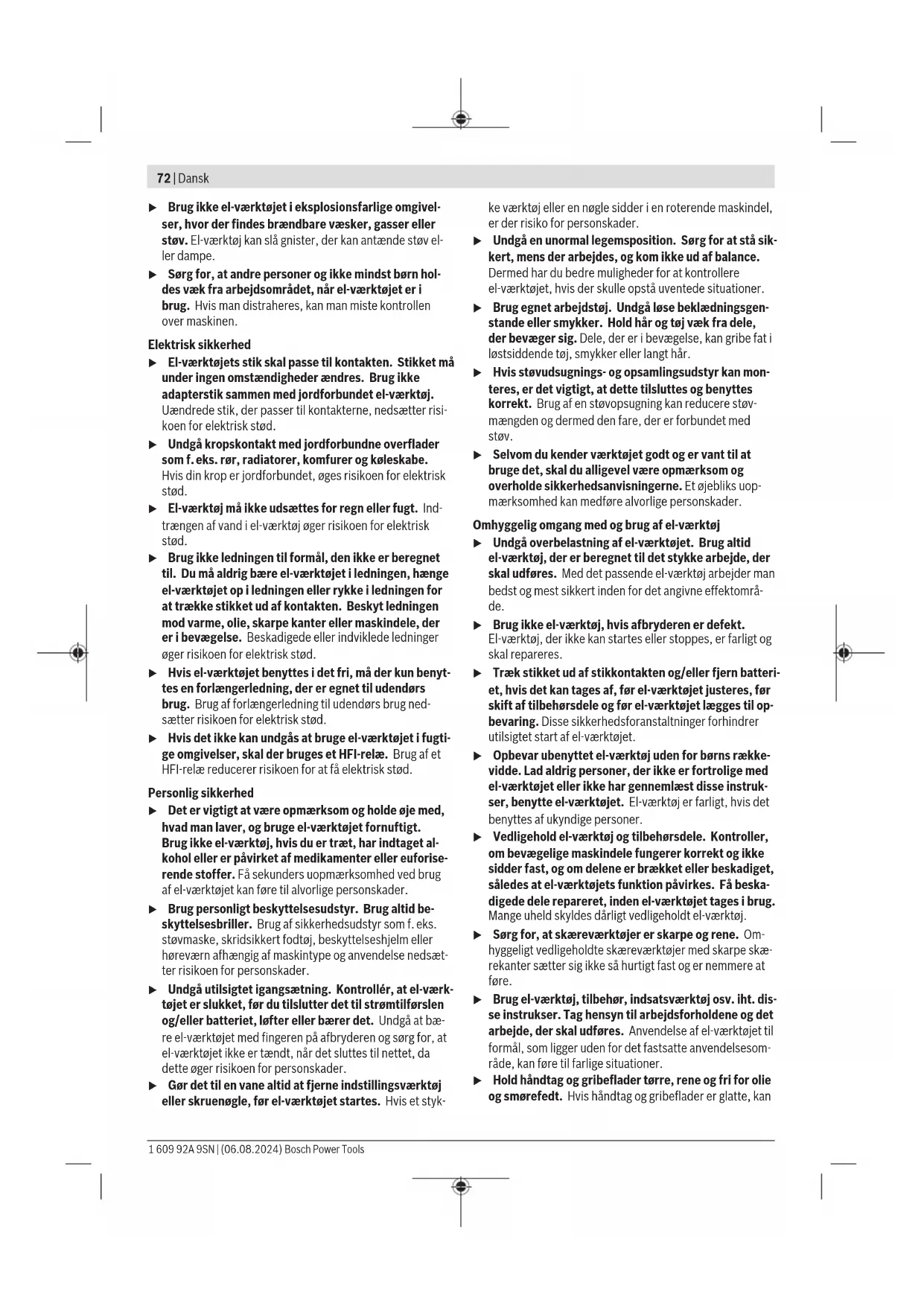Voor de markering van individueel ingestelde draaimomen- ten kunt u de markeringsring (17) vervangen door een mar- keringsring van een andere kleur. – Duw de markeringsring (17) er met een dun schroeven- draaierblad, een plamuurmes of iets dergelijks af. In- en uitschakelen De schroevendraaiers hebben een van het draaimoment afhankelijke uitschakelkoppe- ling die in het aangegeven bereik ingesteld kan worden. Deze spreekt aan, wanneer het inge- stelde draaimoment is bereikt. – Voor het inschakelen van het elektrische gereedschap drukt u de aan/uit-schakelaar(10) tot aan de aanslag. – Het elektrische gereedschap schakelt automatisch uit, zodra het ingestelde draaimoment bereikt is. u Bij voortijdig loslaten van de aan/uit-schakelaar (10) wordt het vooringestelde draaimoment niet bereikt. u Controleer het draaimoment regelmatig bij de schroefverbinding en stel evt. de uitschakelkoppeling opnieuw in. Werklicht inschakelen Met het werklicht (13) kan de schroefplek bij ongunstige lichtomstandigheden verlicht worden. U schakelt het werk- licht (13) in door licht op de aan/uit-schakelaar (10) te druk- ken. Wanneer u de aan/uit-schakelaar verder indrukt, wordt het elektrische gereedschap ingeschakeld en blijft het werk- licht branden. u Kijk niet recht in het werklicht, het kan u verblinden. Aanwijzingen voor werkzaamheden u Plaats het elektrische gereedschap alleen uitgescha- keld op de moer/schroef. Draaiende inzetgereedschap- pen kunnen wegglijden. Aanduiding schroefverbindingen (groene/rode LED) Bij het bereiken van het vooringestelde draaimoment wordt de uitschakelkoppeling geactiveerd. De LED-aanduiding (7) brandt groen. Als het vooringestelde draaimoment niet werd bereikt, dan licht de LED-aanduiding (7) rood op en er is een geluidssig- naal te horen. De schroefverbinding moet nogmaals worden uitgevoerd. Herhalingsbescherming Als bij een schroefverbinding de uitschakelkoppeling werd geactiveerd, dan wordt de motor uitgeschakeld. Opnieuw in- schakelen is pas na een pauze van 0,7 seconden mogelijk. Daardoor voorkomt u per ongeluk vaster aandraaien van reeds vastgedraaide schroefverbindingen. Onderhoud en service Onderhoud en reiniging u Neem de accu vóór alle werkzaamheden aan het elek- trische gereedschap (bijv. onderhoud, wisselen van accessoires, enz.) uit het elektrische gereedschap. Bij per ongeluk bedienen van de aan/uit-schakelaar bestaat gevaar voor letsel. u Houd het elektrische gereedschap en de ventilatie- openingen altijd schoon om goed en veilig te werken. 1 609 92A 9SN | (06.08.2024) Bosch Power ToolsDansk | 71 Smering van het elektrische gereedschap Smeermiddel: Speciaal tandwielvet (225 ml) Productnummer 3 605 430 009 Molykote vet Motorolie SAE 10/SAE 20 – Reinig de aandrijving met een mild oplosmiddel na de eer- ste 150 gebruiksuren. Volg de aanwijzingen van de fabri- kant van het oplosmiddel m.b.t. gebruik en afvoer op. Smeer de aandrijving aansluitend met speciaal tandwiel- vet van Bosch. Herhaal de reiniging telkens na 300 ge- bruiksuren vanaf de eerste reiniging. – Smeer de bewegende delen van de uitschakelkoppeling na 100.000 schroefverbindingen met enkele druppels motorolie SAE 10/SAE 20. Smeer de glijdende en rollen- de delen met Molykote vet. Controleer bij deze gelegen- heid de koppeling op slijtage om er zeker van te zijn dat de herhaalbaarheid en nauwkeurigheid niet werden beïn- vloed. Aansluitend moet het draaimoment van de koppe- ling opnieuw worden ingesteld. u Laat onderhouds- en reparatiewerkzaamheden uitslui- tend uitvoeren door gekwalificeerd geschoold perso- neel. Daarmee wordt gewaarborgd dat de veiligheid van het elektrische gereedschap behouden blijft. Een erkende Bosch-klantenservice voert deze werkzaamhe- den snel en betrouwbaar uit. u Voer smeer- en reinigingsmiddelen op een voor het milieu verantwoorde wijze af. Neem de wettelijke voorschriften in acht. u Controleer uiterlijk om de 100000 schroefverbindin- gen het complete elektrische gereedschap op bescha- digingen en slijtage en test alle functies. Stel vervol- gens het draaimoment van de koppeling opnieuw in. Klantenservice en gebruiksadvies Onze klantenservice beantwoordt uw vragen over reparatie en onderhoud van uw product en over vervangingsonderde- len. Explosietekeningen en informatie over vervangingson- derdelen vindt u ook op: www.bosch-pt.com Het Bosch-adviesteam helpt u graag bij vragen over onze producten en het toebehoren. Vermeld bij vragen en bestellingen van vervangingsonderde- len altijd het uit tien cijfers bestaande productnummer vol- gens het typeplaatje van het product. Nederland Tel.: (076) 579 54 54 Fax: (076) 579 54 94 E-mail: gereedschappen@nl.bosch.com Meer serviceadressen vindt u op: www.bosch-pt.com/serviceaddresses Vervoer Op de geadviseerde lithium-ion-accu’s zijn de eisen voor het vervoer van gevaarlijke stoffen van toepassing. De accu’s kunnen door de gebruiker zonder verdere voorwaarden over de weg worden vervoerd. Bij verzending door derden (bijv. luchtvervoer of expeditie- bedrijf) moeten bijzondere eisen ten aanzien van verpakking en markering in acht worden genomen. In deze gevallen moet bij de voorbereiding van de verzending een deskundige voor gevaarlijke goederen worden geraadpleegd. Verzend accu’s alleen als de behuizing onbeschadigd is. Plak blootliggende contacten af en verpak de accu zodanig dat deze niet in de verpakking beweegt. Neem ook eventuele bij- komende nationale voorschriften in acht. Afvalverwijdering Elektrische gereedschappen, accu’s, accessoi- res en verpakkingen moeten op een voor het milieu verantwoorde wijze gerecycled worden. Gooi elektrische gereedschappen, accu’s en batterijen niet bij het huisvuil. Alleen voor landen van de EU: Afgedankte elektrische gereedschappen en defecte of lege accu's/batterijen moeten apart worden verwijderd. Maak ge- bruik van de hiervoor bestemde inzamelingssystemen. Als afgedankte elektrische en elektronische apparatuur op onjuiste wijze wordt verwijderd, kan dit schadelijke gevolgen 