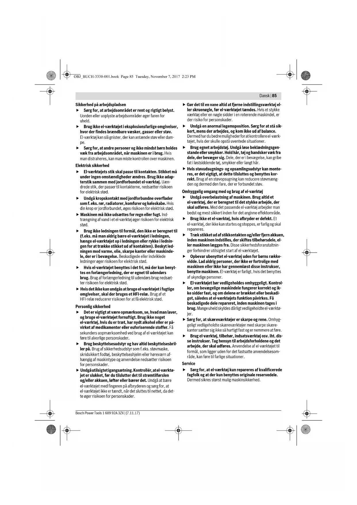 Hvis støvudsugnings- og opsamlingsudstyr kan monte- res, er det vigtigt, at dette tilsluttes og benyttes kor- rekt. Brug af en støvopsugning kan reducere støvmæng- den og dermed den fare, der er forbundet støv. Omhyggelig omgang med og brug af el-værktøj Undgå overbelastning af maskinen. Brug altid et el-værktøj, der er beregnet til det stykke arbejde, der skal udføres. Med det passende el-værktøj arbejder man bedst og mest sikkert inden for det angivne effektområde. Brug ikke et el-værktøj, hvis afbryder er defekt. Et el-værktøj, der ikke kan startes og stoppes, er farlig og skal repareres. Træk stikket ud af stikkontakten og/eller fjern akkuen, inden maskinen indstilles, der skiftes tilbehørsdele, el- ler maskinen lægges fra. Disse sikkerhedsforanstaltnin- ger forhindrer utilsigtet start af el-værktøjet. Opbevar ubenyttet el-værktøj uden for børns række- vidde. Lad aldrig personer, der ikke er fortrolige med maskinen eller ikke har gennemlæst disse instrukser, benytte maskinen. El-værktøj er farligt, hvis det benyttes af ukyndige personer. El-værktøjet bør vedligeholdes omhyggeligt. Kontrol- ler, om bevægelige maskindele fungerer korrekt og ik- ke sidder fast, og om delene er brækket eller beskadi- get, således at el-værktøjets funktion påvirkes. Få beskadigede dele repareret, inden maskinen tages i brug. Mange uheld skyldes dårligt vedligeholdte el-værktø- jer. Sørg for, at skæreværktøjer er skarpe og rene. Omhyg- geligt vedligeholdte skæreværktøjer med skarpe skære- kanter sætter sig ikke så hurtigt fast og er nemmere at føre. Brug el-værktøj, tilbehør, indsatsværktøj osv. iht. dis- se instrukser. Tag hensyn til arbejdsforholdene og det arbejde, der skal udføres. Anvendelse af el-værktøjet til formål, som ligger uden for det fastsatte anvendelsesom- råde, kan føre til farlige situationer. Service Sørg for, at el-værktøj kun repareres af kvalificerede fagfolk og at der kun benyttes originale reservedele. Dermed sikres størst mulig maskinsikkerhed. OBJ_BUCH-3330-001.book Page 85 Tuesday, November 7, 2017 2:23 PM86 | Dansk 1 609 92A 3ZX | (7.11.17) Bosch Power Tools Sikkerhedsinstrukser til vinkelslibere Fælles sikkerhedsinstrukser til slibning, sandpapirslib- ning, arbejde med trådbørster og skærearbejde Dette el-værktøj kan anvendes som sliber, sandpa- pirsliber, trådbørste og skæremaskine. Læs og over- hold alle advarsler, instrukser, illustrationer og data, som du modtager i forbindelse med el-værktøjet. Over- holder du ikke følgende instrukser, kan du få elektrisk stød, der kan opstå brand og/eller du kan blive kvæstet al- vorligt. Dette el-værktøj er ikke egnet til polering. Anvendelse af el-værktøjet til formål, det ikke er beregnet til, er forbun- det med fare og kvæstelsr. Anvend kun tilbehør, hvis det er beregnet til dette el-værktøj og anbefalet af fabrikanten. En mulig fastgø- relse af tilbehøret til el-værktøjet sikrer ikke en sikker an- vendelse. Den tilladte hastighed for indsatsværktøjet skal være mindst lige så høj som den max. hastighed, der er angi- vet på el-værktøjet. Tilbehør, der drejer hurtigere end til- ladt, kan blive ødelagt eller flyve omkring. Indsatsværktøjets udvendige diameter og tykkelse skal svare til målene på dit el-værktøj. Forkert målt ind- satsværktøj kan ikke afskærmes eller kontrolleres tilstræk- keligt. Indsatsværktøj med gevindindsats skal passe nøjagtigt på slibespindlens gevind. Ved indsatsværktøj, der monteres med en flange, skal indsatsværktøjets hul- diameter passe til flangens holdediameter. Indsats- værktøj, der ikke fastgøres nøjagtigt på el-værktøjer, dre- jer ujævnt, vibrerer meget stærkt og kan medføre, at man taber kontrollen. Brug ikke el-værktøjet, hvis det er beskadiget. Kontrol- lér altid før brug indsatsværktøj som f.eks. slibeskiver for afsplintninger og revner, slibebagskiver for revner, slid eller stærkt slid, trådbørster for løse eller brække- de tråde. Tabes el-værktøjet eller indsatsværktøjet på jorden, skal du kontrollere, om det er beskadiget; an- vend evt. et ubeskadiget indsatsværktøj. Når indsats- værktøjet er kontrolleret og indsat, skal du holde dig selv og personer, der befinder sig i nærheden, uden for det niveau, hvor indsastværktøjet roterer, og lade el-værktøjet køre i et minut ved højeste hastighed. Be- skadiget indsatsværktøj brækker for det meste i denne testtid. Brug personligt beskyttelsesudstyr. Brug helmaske til ansigtet, øjenværn eller beskyttelsesbriller, afhængigt af det udførte arbejde. Brug afhængigt af arbejdets art støvmaske, høreværn, beskyttelseshandsker eller spe- cialforklæde, der beskytter dig mod små slibe- og ma- terialepartikler. Øjnene skal beskyttes mod fremmede genstande, der flyver rundt i luften og som opstår i forbin- delse med forskelligt arbejde. Støv- eller åndedrætsmaske skal filtrere det støv, der opstår under arbejdet. Udsættes du for høj støj i længere tid, kan du lide høretab. Sørg for tilstrækkelig afstand til andre personer under arbejdet. Enhver, der betræder arbejdsområdet, skal bruge personligt beskyttelsesudstyr. Brudstykker fra emnet eller brækket indsatsværktøj kan flyve væk og føre til kvæstelser også uden for det direkte arbejdsområde. Hold altid maskinen i de isolerede gribeflader, når du udfører arbejde, hvor indsatsværktøjet kan ramme bø- jede strømledninger eller maskinens eget kabel. Kon- takt med en spændingsførende ledning kan også sætte ma- skinens metaldele under spænding, hvilket kan føre til elektrisk stød. Hold netkablet væk fra roterende indsatsværktøj. Ta- ber du kontrollen over el-værktøjet, kan netkablet skæres over eller rammes, og din hånd eller din arm kan trækkes ind i det roterende indsatsværktøj. Læg aldrig el-værktøjet til side, før indsatsværktøjet står helt stille. Det roterende indsatsværktøj kan komme i kon