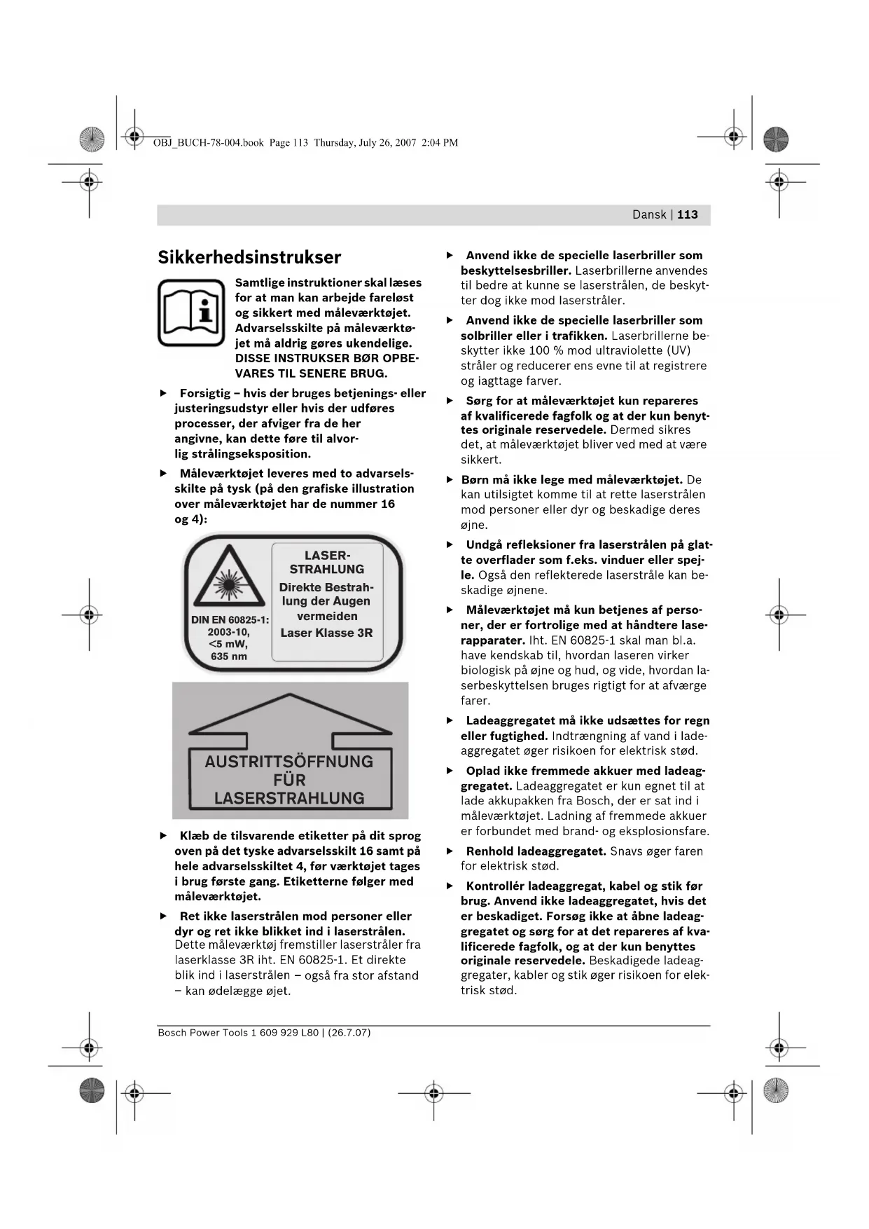 VARES TIL SENERE BRUG. f Forsigtig – hvis der bruges betjenings- eller justeringsudstyr eller hvis der udføres processer, der afviger fra de her angivne, kan dette føre til alvor- lig strålingseksposition. f Måleværktøjet leveres med to advarsels- skilte på tysk (på den grafiske illustration over måleværktøjet har de nummer 16 og 4): f Klæb de tilsvarende etiketter på dit sprog oven på det tyske advarselsskilt 16 samt på hele advarselsskiltet 4, før værktøjet tages i brug første gang. Etiketterne følger med måleværktøjet. f Ret ikke laserstrålen mod personer eller dyr og ret ikke blikket ind i laserstrålen. Dette måleværktøj fremstiller laserstråler fra laserklasse 3R iht. EN 60825-1. Et direkte blik ind i laserstrålen – også fra stor afstand – kan ødelægge øjet. f Anvend ikke de specielle laserbriller som beskyttelsesbriller. Laserbrillerne anvendes til bedre at kunne se laserstrålen, de beskyt- ter dog ikke mod laserstråler. f Anvend ikke de specielle laserbriller som solbriller eller i trafikken. Laserbrillerne be- skytter ikke 100 % mod ultraviolette (UV) stråler og reducerer ens evne til at registrere og iagttage farver. f Sørg for at måleværktøjet kun repareres af kvalificerede fagfolk og at der kun benyt- tes originale reservedele. Dermed sikres det, at måleværktøjet bliver ved med at være sikkert. f Børn må ikke lege med måleværktøjet. De kan utilsigtet komme til at rette laserstrålen mod personer eller dyr og beskadige deres øjne. f Undgå refleksioner fra laserstrålen på glat- te overflader som f.eks. vinduer eller spej- le. Også den reflekterede laserstråle kan be- skadige øjnene. f Måleværktøjet må kun betjenes af perso- ner, der er fortrolige med at håndtere lase- rapparater. Iht. EN 60825-1 skal man bl.a. have kendskab til, hvordan laseren virker biologisk på øjne og hud, og vide, hvordan la- serbeskyttelsen bruges rigtigt for at afværge farer. f Ladeaggregatet må ikke udsættes for regn eller fugtighed. Indtrængning af vand i lade- aggregatet øger risikoen for elektrisk stød. f Oplad ikke fremmede akkuer med ladeag- gregatet. Ladeaggregatet er kun egnet til at lade akkupakken fra Bosch, der er sat ind i måleværktøjet. Ladning af fremmede akkuer er forbundet med brand- og eksplosionsfare. f Renhold ladeaggregatet. Snavs øger faren for elektrisk stød. f Kontrollér ladeaggregat, kabel og stik før brug. Anvend ikke ladeaggregatet, hvis det er beskadiget. Forsøg ikke at åbne ladeag- gregatet og sørg for at det repareres af kva- lificerede fagfolk, og at der kun benyttes originale reservedele. Beskadigede ladeag- gregater, kabler og stik øger risikoen for elek- trisk stød. DIN EN 60825-1:2003-10, <5 mW, 635 nm LASER- STRAHLUNG Direkte Bestrah- lung der Augen vermeiden Laser Klasse 3R AUSTRITTSÖFFNUNG FÜR LASERSTRAHLUNG OBJ_BUCH-78-004.book Page 113 Thursday, July 26, 2007 2:04 PM114 | Dansk 1 609 929 L80 | (26.7.07) Bosch Power Tools f Anvend ikke ladeaggregatet på let brænd- bar undergrund (f.eks. papir, tekstiler osv.) eller i brændbare omgivelser. Pas på! Lade- aggregatet bliver varmt under opladningen. Brandfare! f Hvis akku’en anvendes forkert, kan der slip- pe væske ud af akku’en. Undgå at komme i kontakt med denne væske. Hvis det allige- vel skulle ske, skylles med vand. Søg læge, hvis væsken kommer i øjnene. Akku-væske kan give hudirritation eller forbrændinger. Funktionsbeskrivelse Klap venligst foldesiden med illustration af må- leværktøjet ud og lad denne side være foldet ud, mens du læser betjeningsvejledningen. Beregnet anvendelse Måleværktøjet er beregnet til at måle og kontrol- lere nøjagtigt vandrette højderids, lodrette lin- jer, flugtlinjer og lodpunkter ude og inde. Illustrerede komponenter Nummereringen af de illustrerede komponenter refererer til illustrationen af måleværktøjet på il- lustrationssiden. 1 Libelle 2 Modtagerlinse til fjernbetjening 3 Bøsning til ladestik 4 Advarselsskilt åbning laserstråle 5 Åbning til laserstråle 6 Markering Y-akse 7 Markering X-akse 8 Lodstråle 9 Variabel laserstråle 10 Lodkærv X-akse 11 Lodkærv Y-akse 12 Låsning af låg til batterirum 13 Låg til batterirum 14 Gummifod 15 Akku-pack 16 Laser-advarselsskilt 17 Stativholder 5/8" (vandret og lodret) 18 Serienummer 19 Taste til linjedrift og valg af linjelængde 20 Retningstaste foroven 21 Retningstaste til venstre 22 Taste til rotationsdrift og valg af rotations- hastighed 23 Retningstaste forneden 24 Retningstaste til højre 25 Lampe manuel nivellering „man“ 26 Lampe automatisk nivellering „auto“ 27 Batteri-ladetilstandsindikator 28 Taste „man/auto“ til slukning af nivelle- ringsautomatik 29 Tænd-sluk-taste 30 Baulaser-måleplade* 31 Specielle laserbriller 32 Vægholder/justeringsenhed* 33 5/8"-skrue på vægholder* 34 Skruer til justeringsenhed* 35 Måleplade med fod 36 Loftsmåleplade* 37 Hældningskil* 38 Højkapacitetsmodtager med holder 39 Fjernbetjening 40 Stativ* 41 Ladestik 42 Ladeaggregat 43 Koffer *Tilbehør, som er illustreret eller beskrevet i betje- ningsvejledningen, hører ikke til standard-leveringen. OBJ_BUCH-78-004.book Page 114 Thursday, July 26, 2007 2:04 PMDansk | 115 Bosch Power Tools 1 609 929 L80 | (26.7.07) Tekniske data Byggelaser BL 200 GC Professional Typenummer 3 601 K15 000 Arbejdsområde (radius)