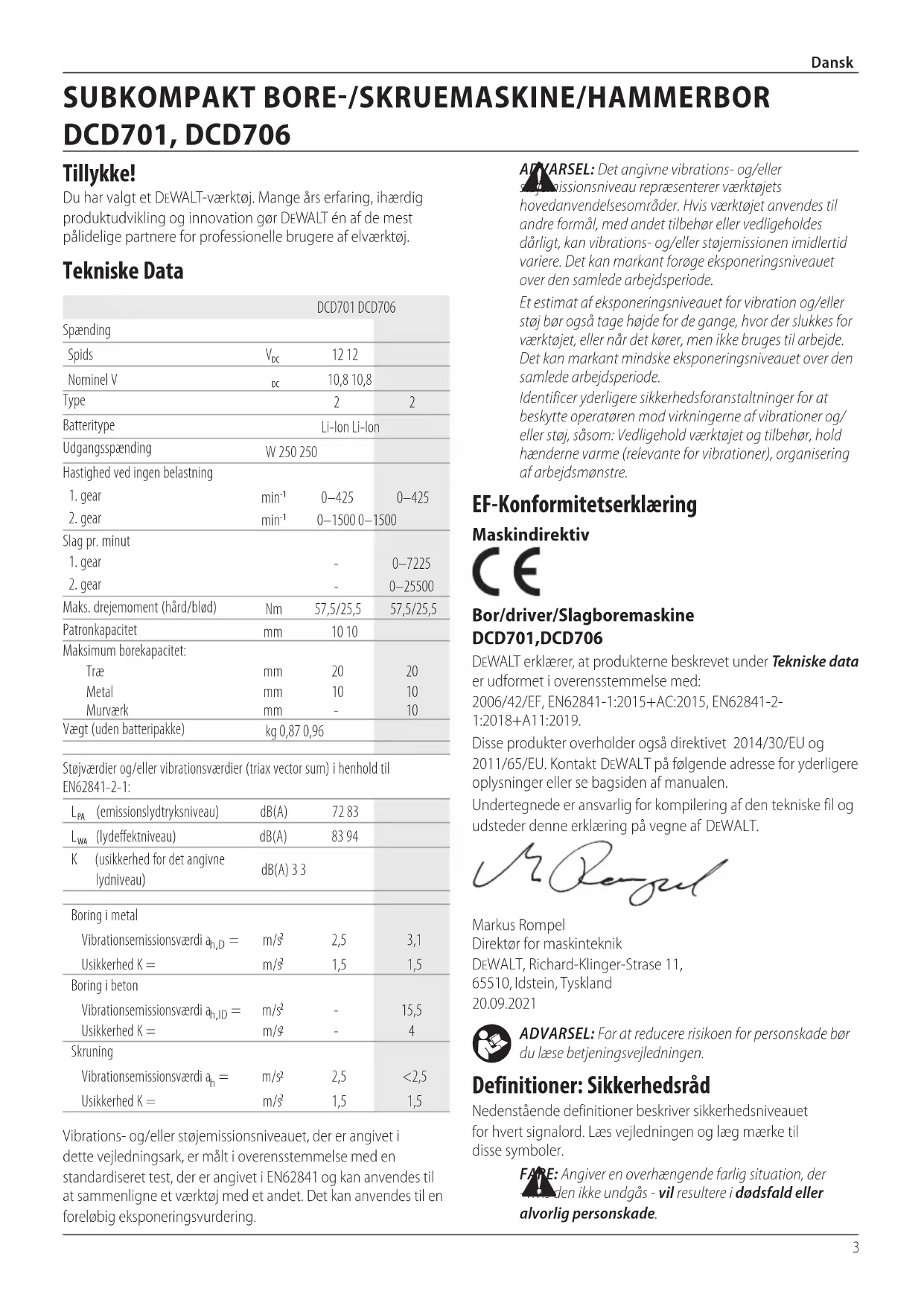 ADVARSEL: For at reducere risikoen for personskade bør du læsebetjeningsvejledningen. Definitioner: Sikkerhedsråd Nedenstående definitioner beskriver sikkerhedsniveauet for hvert signalord. Læs vejledningen og læg mærke til dissesymboler. FARE: Angiver en overhængende farlig situation, der - hvis den ikke undgås - vil resultere i dødsfald eller alvorligpersonskade. EF‑Konformitetserklæring Maskindirektiv Bor/driver/Slagboremaskine DCD701, DCD706 DeWALT erklærer, at produkterne beskrevet under Tekniske data er udformet i overensstemmelse med: 2006/42/EF, EN62841-1:2015+AC:2015, EN62841-2-1:2018+A11:2019.Disse produkter overholder også direktivet 2014/30/EU og 2011/65/EU. Kontakt DeWALT på følgende adresse for yderligere oplysninger eller se bagsiden afmanualen.Undertegnede er ansvarlig for kompilering af den tekniske fil og udsteder denne erklæring på vegne afDeWALT.Markus Rompel Direktør for maskinteknik DeWALT, Richard-Klinger-Strase 11, 65510, Idstein, Tyskland 20.09.2021 ADVARSEL: Det angivne vibrations- og/eller støjemissionsniveau repræsenterer værktøjets hovedanvendelsesområder. Hvis værktøjet anvendes til andre formål, med andet tilbehør eller vedligeholdes dårligt, kan vibrations- og/eller støjemissionen imidlertid variere. Det kan markant forøge eksponeringsniveauet over den samledearbejdsperiode.Et estimat af eksponeringsniveauet for vibration og/eller støj bør også tage højde for de gange, hvor der slukkes for værktøjet, eller når det kører, men ikke bruges til arbejde. Det kan markant mindske eksponeringsniveauet over den samledearbejdsperiode.Identificer yderligere sikkerhedsforanstaltninger for at beskytte operatøren mod virkningerne af vibrationer og/eller støj, såsom: Vedligehold værktøjet og tilbehør, hold hænderne varme (relevante for vibrationer), organisering afarbejdsmønstre.Vibrations- og/eller støjemissionsniveauet, der er angivet i dette vejledningsark, er målt i overensstemmelse med en standardiseret test, der er angivet i EN62841 og kan anvendes til at sammenligne et værktøj med et andet. Det kan anvendes til en foreløbigeksponeringsvurdering.DCD701 DCD706Spænding Spids
