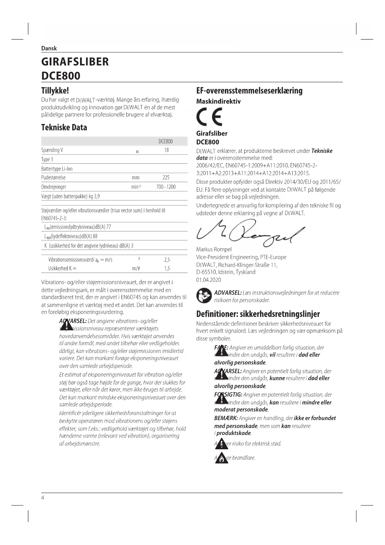 Angiverbrandfare. EF-overensstemmelseserklæring Maskindirektiv Girafsliber DCE800 DeWALT erklærer, at produkterne beskrevet under Tekniske data er i overensstemmelse med: 2006/42/EC, EN60745-1:2009+A11:2010, EN60745-2- 3:2011+A2:2013+A11:2014+A12:2014+A13:2015. Disse produkter opfylder også Direktiv 2014/30/EU og 2011/65/ EU. Få flere oplysninger ved at kontakte DeWALT på følgende adresse eller se bag påvejledningen. Undertegnede er ansvarlig for kompilering af den tekniske fil og udsteder denne erklæring på vegne af DeWALT