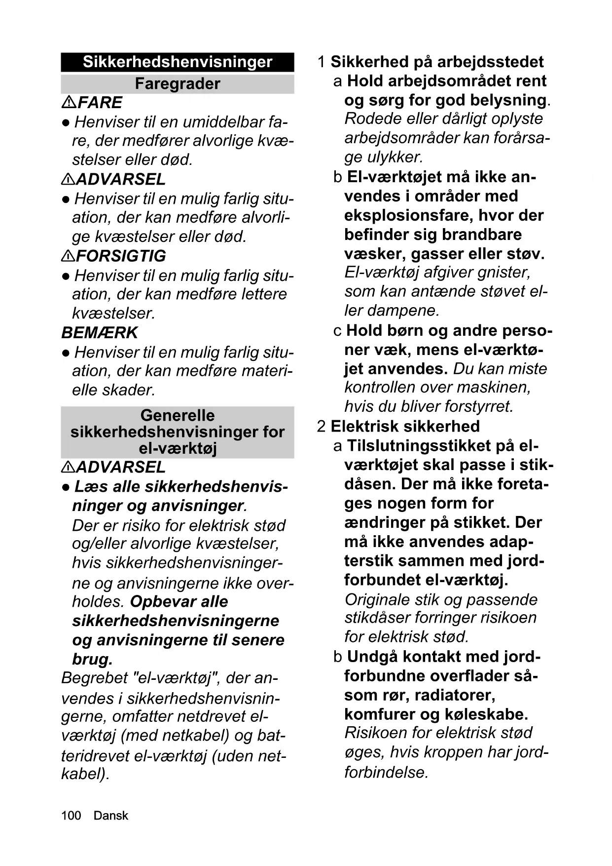 - EU-overensstemmelseserklæring 00 Dansk Sikkerhedshenvisninger Faregrader FARE ● Henviser til en umiddelbar fa- re, der medfører alvorlige kvæ- stelser eller død. 몇 ADVARSEL ● Henviser til en mulig farlig situ- ation, der kan medføre alvorli- ge kvæstelser eller død. 몇 FORSIGTIG ● Henviser til en mulig farlig situ- ation, der kan medføre lettere kvæstelser. BEMÆRK ● Henviser til en mulig farlig situ- ation, der kan medføre materi- elle skader. Generelle sikkerhedshenvisninger for el-værktøj 몇 ADVARSEL ● Læs alle sikkerhedshenvis- ninger og anvisninger. Der er risiko for elektrisk stød og/eller alvorlige kvæstelser, hvis sikkerhedshenvisninger- ne og anvisningerne ikke over- holdes. Opbevar alle sikkerhedshenvisningerne og anvisningerne til senere brug. Begrebet "el-værktøj", der an- vendes i sikkerhedshenvisnin- gerne, omfatter netdrevet el- værktøj (med netkabel) og bat- teridrevet el-værktøj (uden net- kabel). 1 Sikkerhed på arbejdsstedet a Hold arbejdsområdet rent og sørg for god belysning. Rodede eller dårligt oplyste arbejdsområder kan forårsa- ge ulykker. b El-værktøjet må ikke an- vendes i områder med eksplosionsfare, hvor der befinder sig brandbare væsker, gasser eller støv. El-værktøj afgiver gnister, som kan antænde støvet el- ler dampene. c Hold børn og andre perso- ner væk, mens el-værktø- jet anvendes. Du kan miste kontrollen over maskinen, hvis du bliver forstyrret. 2 Elektrisk sikkerhed a Tilslutningsstikket på el- værktøjet skal passe i stik- dåsen. Der må ikke foreta- ges nogen form for ændringer på stikket. Der må ikke anvendes adap- terstik sammen med jord- forbundet el-værktøj. Originale stik og passende stikdåser forringer risikoen for elektrisk stød. b Undgå kontakt med jord- forbundne overflader så- som rør, radiatorer, komfurer og køleskabe. Risikoen for elektrisk stød øges, hvis kroppen har jord- forbindelse.Dansk 101 c Udsæt ikke el-værktøj for regn eller fugt. Hvis der trænger vand ind i el-værk- tøjet, øges risikoen for elek- trisk stød. d Brug ikke kablet til at løfte el-værktøjet, hænge det op eller trække stikket ud af stikdåsen. Hold kablet væk fra varme, olie, skar- pe kanter eller bevægelige dele på maskinen. Beska- digede eller snoede tilslut- ningskabler øger risikoen for elektrisk stød. e Anvend kun forlænger- kabler, der er beregnet til udendørs brug, hvis du ar- bejder med el-værktøjet i det fri. Risikoen for elektrisk stød forringes, hvis der an- vendes et forlængerkabel, der er beregnet til udendørs brug. f Anvend et HFI-relæ/FI-re- læ, hvis el-værktøjet an- vendes i fugtige omgivelser. Anvendelse af et HFI-relæ/FI-relæ forringer risikoen for elektrisk stød. 3 Personlig sikkerhed a Vær opmærksom, overvej, hvad du gør, og brug din fornuft, når du arbejder med el-værktøj. Brug ikke el-værktøj, hvis du er træt eller er påvirket af narkoti- ka, alkohol eller medicin. Et øjebliks uopmærksom- hed under arbejdet med el- værktøj kan medføre alvorli- ge kvæstelser. b Bær personligt beskyttel- sesudstyr og altid beskyt- telsesbriller. Hvis der bæres personligt beskyttel- sesudstyr, såsom støvma- ske, skridsikre sikkerhedssko, beskyttel- seshjelm eller høreværn, forringes risikoen for kvæ- stelser, afhængigt af el- værktøjets anvendelse. c Undgå, at maskinen star- ter utilsigtet. Kontrollér, om el-værktøjet er slået fra, inden du tilslutter strømforsyningen og/eller batteriet, løfter det op eller bærer det. Hvis du holder fingeren på kontakten, mens du bærer el-værktøjet, eller maskinen er tændt, når strømforsyningen tilsluttes, kan det medføre ulykker. d Fjern indstillingsværktøj eller skruenøgle, inden du tænder for el-værktøjet. Et værktøj eller en nøgle, der befinder sig i roterende ma- skindele, kan medføre kvæ- stelser. e Undgå unormale kropsstil- linger. Sørg for at stå fast, og sørg altid for at have li- gevægt. Således har du bedre kontrol over el-værk- tøjet i en uventet situation.102 Dansk f Bær egnet tøj. Bær ikke løstsiddende tøj eller smykker. Hold hår, tøj og handsker væk fra bevæge- lige dele. Løstsiddende tøj, handsker, smykker eller langt hår kan blive grebet og trukket med af bevægelige dele. g Hvis der kan monteres støvudsugnings- og -op- samlingsanordninger, skal du sikre dig, at disse er korrekt tilsluttet og an- vendes korrekt. Fare på grund af støv kan forringes ved anvendelse af en støv- udsugning. 4 Anvendelse og håndtering af el-værktøj a Undgå at overbelaste ma- skinen. Anvend et el-værk- tøj, der passer til det pågældende arbejde. Med det passende el-værktøj ar- bejder du bedre og mere sik- kert inden for det angivne effektområde. b Brug ikke el-værktøj med defekt kontakt. Et el-værk- tøj, som ikke kan tændes el- ler slukkes, er farligt og skal repareres. c Tag stikket ud af stikdåsen og/eller fjern batteriet, in- den du foretager indstillin- ger på maskinen, skifter tilbehørsdele eller lægger maskinen til side. Disse sikkerhedsforanstaltninger forhindrer en utilsigtet start af el-værktøjet. d Opbevar el-værktøj, der ik- ke anvendes, uden for børns rækkevidde. Lad ik- ke personer anvende ma- skinen, der ikke er fortrolige med det eller ik- ke har læst disse anvisnin- ger. El-værktøj er farligt, hvis det anvendes af uerfar- ne personer. e Sørg for omhyggelig vedli- geholdelse af el-værktøj. Kontrollér, om de bevæge- lige dele fungerer korrekt og ikke er blokeret, om de- le er brækket eller beska- diget på en sådan måde, at el-værktøjet ikke fungerer korrekt. Lad beskadigede dele reparere, inden du ta- ger maskinen i brug. Man- ge uheld skyldes el-værktøj, der er dårligt vedligeholdt. f Hold skæreværktøj skarpt og rent. Ordentligt vedlige- holdt skæreværktøj med skarpe skærekanter sætter sig ikke så let fast og er let- tere at styre. g Anvend el-værktøj, tilbe- hør, hjælpeværktøj etc. i ove