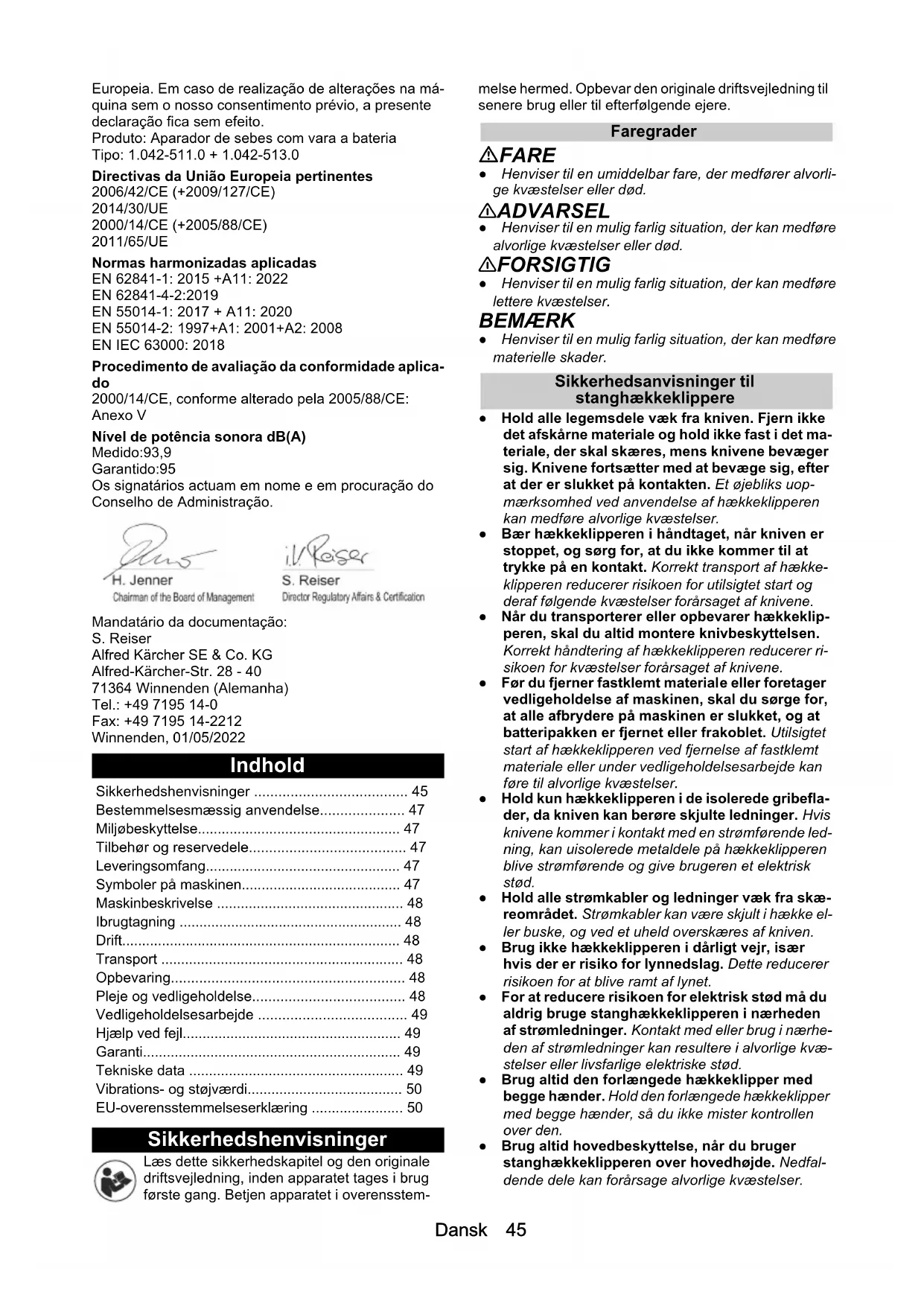 • 2000/14/CE, conforme alterado pela 2005/88/CE: Anexo V Nível de potência sonora dB(A) Medido:93,9 Garantido:95 Os signatários actuam em nome e em procuração do Conselho de Administração. Mandatário da documentação: S. Reiser Alfred Kärcher SE & Co. KG Alfred-Kärcher-Str. 28 - 40 71364 Winnenden (Alemanha) Tel.: +49 7195 14-0 Fax: +49 7195 14-2212 Winnenden, 01/05/2022 Indhold Sikkerhedshenvisninger Læs dette sikkerhedskapitel og den originale driftsvejledning, inden apparatet tages i brug første gang. Betjen apparatet i overensstem- melse hermed. Opbevar den originale driftsvejledning til senere brug eller til efterfølgende ejere. Faregrader FARE ● Henviser til en umiddelbar fare, der medfører alvorli- ge kvæstelser eller død. 몇 ADVARSEL ● Henviser til en mulig farlig situation, der kan medføre alvorlige kvæstelser eller død. 몇 FORSIGTIG ● Henviser til en mulig farlig situation, der kan medføre lettere kvæstelser. BEMÆRK ● Henviser til en mulig farlig situation, der kan medføre materielle skader. Sikkerhedsanvisninger til stanghækkeklippere ● Hold alle legemsdele væk fra kniven. Fjern ikke det afskårne materiale og hold ikke fast i det ma- teriale, der skal skæres, mens knivene bevæger sig. Knivene fortsætter med at bevæge sig, efter at der er slukket på kontakten. Et øjebliks uop- mærksomhed ved anvendelse af hækkeklipperen kan medføre alvorlige kvæstelser. ● Bær hækkeklipperen i håndtaget, når kniven er stoppet, og sørg for, at du ikke kommer til at trykke på en kontakt. Korrekt transport af hække- klipperen reducerer risikoen for utilsigtet start og deraf følgende kvæstelser forårsaget af knivene. ● Når du transporterer eller opbevarer hækkeklip- peren, skal du altid montere knivbeskyttelsen. Korrekt håndtering af hækkeklipperen reducerer ri- sikoen for kvæstelser forårsaget af knivene. ● Før du fjerner fastklemt materiale eller foretager vedligeholdelse af maskinen, skal du sørge for, at alle afbrydere på maskinen er slukket, og at batteripakken er fjernet eller frakoblet. Utilsigtet start af hækkeklipperen ved fjernelse af fastklemt materiale eller under vedligeholdelsesarbejde kan føre til alvorlige kvæstelser. ● Hold kun hækkeklipperen i de isolerede gribefla- der, da kniven kan berøre skjulte ledninger. Hvis knivene kommer i kontakt med en strømførende led- ning, kan uisolerede metaldele på hækkeklipperen blive strømførende og give brugeren et elektrisk stød. ● Hold alle strømkabler og ledninger væk fra skæ- reområdet. Strømkabler kan være skjult i hække el- ler buske, og ved et uheld overskæres af kniven. ● Brug ikke hækkeklipperen i dårligt vejr, især hvis der er risiko for lynnedslag. Dette reducerer risikoen for at blive ramt af lynet. ● For at reducere risikoen for elektrisk stød må du aldrig bruge stanghækkeklipperen i nærheden af strømledninger. Kontakt med eller brug i nærhe- den af strømledninger kan resultere i alvorlige kvæ- stelser eller livsfarlige elektriske stød. ● Brug altid den forlængede hækkeklipper med begge hænder. Hold den forlængede hækkeklipper med begge hænder, så du ikke mister kontrollen over den. ● Brug altid hovedbeskyttelse, når du bruger stanghækkeklipperen over hovedhøjde. Nedfal- dende dele kan forårsage alvorlige kvæstelser. Sikkerhedshenvisninger p. 45