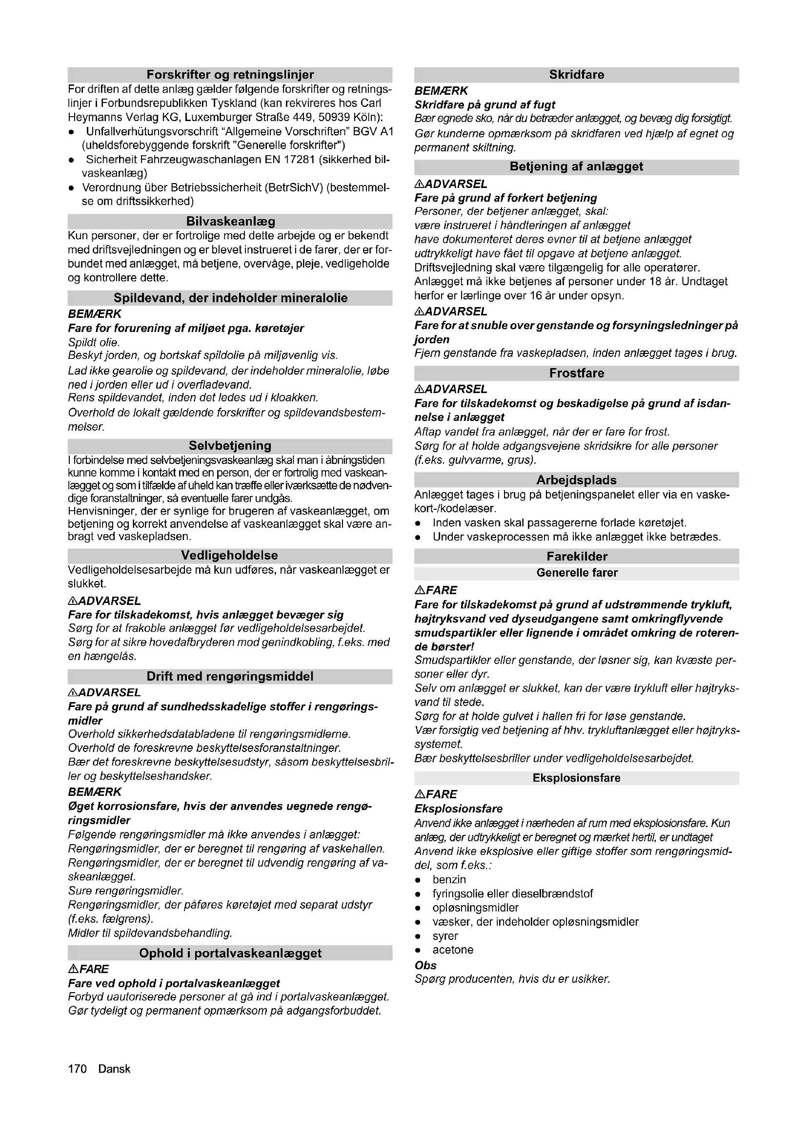 - EU-overensstemmelseserklæring 70 Dansk Forskrifter og retningslinjer For driften af dette anlæg gælder følgende forskrifter og retnings- linjer i Forbundsrepublikken Tyskland (kan rekvireres hos Carl Heymanns Verlag KG, Luxemburger Straße 449, 50939 Köln): ● Unfallverhütungsvorschrift “Allgemeine Vorschriften” BGV A1 (uheldsforebyggende forskrift "Generelle forskrifter") ● Sicherheit Fahrzeugwaschanlagen EN 17281 (sikkerhed bil- vaskeanlæg) ● Verordnung über Betriebssicherheit (BetrSichV) (bestemmel- se om driftssikkerhed) Bilvaskeanlæg Kun personer, der er fortrolige med dette arbejde og er bekendt med driftsvejledningen og er blevet instrueret i de farer, der er for- bundet med anlægget, må betjene, overvåge, pleje, vedligeholde og kontrollere dette. Spildevand, der indeholder mineralolie BEMÆRK Fare for forurening af miljøet pga. køretøjer Spildt olie. Beskyt jorden, og bortskaf spildolie på miljøvenlig vis. Lad ikke gearolie og spildevand, der indeholder mineralolie, løbe ned i jorden eller ud i overfladevand. Rens spildevandet, inden det ledes ud i kloakken. Overhold de lokalt gældende forskrifter og spildevandsbestem- melser. Selvbetjening I forbindelse med selvbetjeningsvaskeanlæg skal man i åbningstiden kunne komme i kontakt med en person, der er fortrolig med vaskean- lægget og som i tilfælde af uheld kan træffe eller iværksætte de nødven- dige foranstaltninger, så eventuelle farer undgås. Henvisninger, der er synlige for brugeren af vaskeanlægget, om betjening og korrekt anvendelse af vaskeanlægget skal være an- bragt ved vaskepladsen. Vedligeholdelse Vedligeholdelsesarbejde må kun udføres, når vaskeanlægget er slukket. 몇 ADVARSEL Fare for tilskadekomst, hvis anlægget bevæger sig Sørg for at frakoble anlægget før vedligeholdelsesarbejdet. Sørg for at sikre hovedafbryderen mod genindkobling, f.eks. med en hængelås. Drift med rengøringsmiddel 몇 ADVARSEL Fare på grund af sundhedsskadelige stoffer i rengørings- midler Overhold sikkerhedsdatabladene til rengøringsmidlerne. Overhold de foreskrevne beskyttelsesforanstaltninger. Bær det foreskrevne beskyttelsesudstyr, såsom beskyttelsesbril- ler og beskyttelseshandsker. BEMÆRK Øget korrosionsfare, hvis der anvendes uegnede rengø- ringsmidler Følgende rengøringsmidler må ikke anvendes i anlægget: Rengøringsmidler, der er beregnet til rengøring af vaskehallen. Rengøringsmidler, der er beregnet til udvendig rengøring af va- skeanlægget. Sure rengøringsmidler. Rengøringsmidler, der påføres køretøjet med separat udstyr (f.eks. fælgrens). Midler til spildevandsbehandling. Ophold i portalvaskeanlægget FARE Fare ved ophold i portalvaskeanlægget Forbyd uautoriserede personer at gå ind i portalvaskeanlægget. Gør tydeligt og permanent opmærksom på adgangsforbuddet. Skridfare BEMÆRK Skridfare på grund af fugt Bær egnede sko, når du betræder anlægget, og bevæg dig forsigtigt. Gør kunderne opmærksom på skridfaren ved hjælp af egnet og permanent skiltning. Betjening af anlægget 몇 ADVARSEL Fare på grund af forkert betjening Personer, der betjener anlægget, skal: være instrueret i håndteringen af anlægget have dokumenteret deres evner til at betjene anlægget udtrykkeligt have fået til opgave at betjene anlægget. Driftsvejledning skal være tilgængelig for alle operatører. Anlægget må ikke betjenes af personer under 18 år. Undtaget herfor er lærlinge over 16 år under opsyn. 몇 ADVARSEL Fare for at snuble over genstande og forsyningsledninger på jorden Fjern genstande fra vaskepladsen, inden anlægget tages i brug. Frostfare 몇 ADVARSEL Fare for tilskadekomst og beskadigelse på grund af isdan- nelse i anlægget Aftap vandet fra anlægget, når der er fare for frost. Sørg for at holde adgangsvejene skridsikre for alle personer (f.eks. gulvvarme, grus). Arbejdsplads Anlægget tages i brug på betjeningspanelet eller via en vaske- kort-/kodelæser. ● Inden vasken skal passagererne forlade køretøjet. ● Under vaskeprocessen må ikke anlægget ikke betrædes. Farekilder Generelle farer FARE Fare for tilskadekomst på grund af udstrømmende trykluft, højtryksvand ved dyseudgangene samt omkringflyvende smudspartikler eller lignende i området omkring de roteren- de børster! Smudspartikler eller genstande, der løsner sig, kan kvæste per- soner eller dyr. Selv om anlægget er slukket, kan der være trykluft eller højtryks- vand til stede. Sørg for at holde gulvet i hallen fri for løse genstande. Vær forsigtig ved betjening af hhv. trykluftanlægget eller højtryks- systemet. Bær beskyttelsesbriller under vedligeholdelsesarbejdet. Eksplosionsfare FARE Eksplosionsfare Anvend ikke anlægget i nærheden af rum med eksplosionsfare. Kun anlæg, der udtrykkeligt er beregnet og mærket hertil, er undtaget Anvend ikke eksplosive eller giftige stoffer som rengøringsmid- del, som f.eks.: ● benzin ● fyringsolie eller dieselbrændstof ● opløsningsmidler ● væsker, der indeholder opløsningsmidler ● syrer ● acetone Obs Spørg producenten, hvis du er usikker.Dansk 171 Høreskader Støjen fra anlægget er ufarlig for vaskekunderne på grund af den kortvarige belastning. Obs På indkørselssiden udgør lydniveauet under tørring 94 dB(A). 몇 ADVARSEL Fare for høreskader hos betjeningspersonalet under tørring Bær høreværn under tørringen. Fare for høreskader på grund af høj lydstyrke i maskinrummet Bær passende høreværn, når du opholder dig i maskinrummet. Elektriske farer FARE Fare på grund af elektrisk stød Rør ikke ved elektriske komponenter og ledninger med våde hænder. Sørg for, at elektriske tilslutningsledninger eller forlængerkabler ikke kan køres over, komme i klemme, trækkes i eller lignende, hvorved de kan beskadiges. Beskyt kablerne mod varme, olie og skarpe kanter. Ret aldrig en vandstråle mod elektriske maskinen eller anlæg. Beskyt alle strømførende dele i arbejdsområdet mod vandstråle