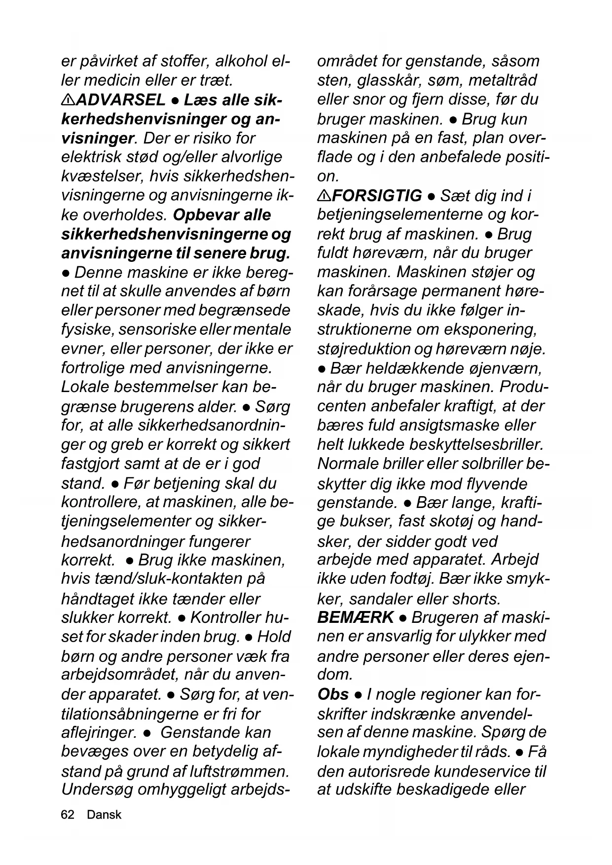 - EU-overensstemmelseserklæring Chairman of the Board of ManagementDirector Regulatory Affairs & Certification H. Jenner S. Reiser62 Dansk er påvirket af stoffer, alkohol el- ler medicin eller er træt. 몇 ADVARSEL ● Læs alle sik- kerhedshenvisninger og an- visninger. Der er risiko for elektrisk stød og/eller alvorlige kvæstelser, hvis sikkerhedshen- visningerne og anvisningerne ik- ke overholdes. Opbevar alle sikkerhedshenvisningerne og anvisningerne til senere brug. ● Denne maskine er ikke bereg- net til at skulle anvendes af børn eller personer med begrænsede fysiske, sensoriske eller mentale evner, eller personer, der ikke er fortrolige med anvisningerne. Lokale bestemmelser kan be- grænse brugerens alder. ● Sørg for, at alle sikkerhedsanordnin- ger og greb er korrekt og sikkert fastgjort samt at de er i god stand. ● Før betjening skal du kontrollere, at maskinen, alle be- tjeningselementer og sikker- hedsanordninger fungerer korrekt. ● Brug ikke maskinen, hvis tænd/sluk-kontakten på håndtaget ikke tænder eller slukker korrekt. ● Kontroller hu- set for skader inden brug. ● Hold børn og andre personer væk fra arbejdsområdet, når du anven- der apparatet. ● Sørg for, at ven- tilationsåbningerne er fri for aflejringer. ● Genstande kan bevæges over en betydelig af- stand på grund af luftstrømmen. Undersøg omhyggeligt arbejds- området for genstande, såsom sten, glasskår, søm, metaltråd eller snor og fjern disse, før du bruger maskinen. ● Brug kun maskinen på en fast, plan over- flade og i den anbefalede positi- on. 몇 FORSIGTIG ● Sæt dig ind i betjeningselementerne og kor- rekt brug af maskinen. ● Brug fuldt høreværn, når du bruger maskinen. Maskinen støjer og kan forårsage permanent høre- skade, hvis du ikke følger in- struktionerne om eksponering, støjreduktion og høreværn nøje. ● Bær heldækkende øjenværn, når du bruger maskinen. Produ- centen anbefaler kraftigt, at der bæres fuld ansigtsmaske eller helt lukkede beskyttelsesbriller. Normale briller eller solbriller be- skytter dig ikke mod flyvende genstande. ● Bær lange, krafti- ge bukser, fast skotøj og hand- sker, der sidder godt ved arbejde med apparatet. Arbejd ikke uden fodtøj. Bær ikke smyk- ker, sandaler eller shorts. BEMÆRK ● Brugeren af maski- nen er ansvarlig for ulykker med andre personer eller deres ejen- dom. Obs ● I nogle regioner kan for- skrifter indskrænke anvendel- sen af denne maskine. Spørg de lokale myndigheder til råds. ● Få den autorisrede kundeservice til at udskifte beskadigede ellerDansk 63 ulæselige advarselsskilte på maskinen. Sikker drift FARE ● Driften i eksplosions- farlige områder er forbudt. 몇 ADVARSEL ● Hold en mini- mumsafstand på 15 m til perso- ner og dyr. Stands maskinen, hvis nogen kommer inden for dette område. ● Anvend ikke maskinen, hvis der er risiko for lynnedslag. ● Det er nødvendigt med et uhindret udsyn til ar- bejdsområdet for at opdage mu- lige farer. Anvend kun maskinen med god belysning. ● Løb ikke, men gå, når du arbejder med maskinen. Gå ikke baglæns. Undgå en unormal kropshold- ning, sørg for at stå fast, og for altid at have ligevægt. ● Stop maskinen med det samme og kontroller for skader eller find frem til årsagen til vibrationen, hvis maskinen er faldet ned, har fået et slag eller vibrerer unor- malt. Få repareret skader af den autoriserede kundeservice, eller udskift maskinen. ● Sluk appa- ratet i tilfælde af en fejl eller en ulykke, og fjern det genopladeli- ge batteri. Apparatet må først ta- ges i brug igen, hvis det er blevet kontrolleret af en autori- seret kundeservice. ● Ryg- sækløvblæseren er udstyret med bæresele. Juster bærese- len omhyggeligt, så maskinens vægt fordeles jævnt. Gør dig be- kendt med bæreselen og snaplukningen, inden du anven- der maskinen. I tilfælde af fare kan korrekt brug beskytte dig mod alvorlige kvæstelser. Bær ikke beklædningsgenstande over seletøjet og sørg altid for at have fri adgang til snapluknin- gen. ● Risiko for tilskadekomst ved roterende dele. Sluk for mo- toren, fjern batteripakken og sørg for, at alle bevægelige dele står fuldstændigt stille: Før du efterlader maskinen uden opsyn. Før du kontrollerer maskinen, efter at den er blevet ramt af et fremmedlegeme. Før du kontrollerer, rengør el- ler arbejder på maskinen. 몇 FORSIGTIG ● Anvendelse af lignende værktøj i omgivelserne øger risikoen for høreskader og sandsynligheden for, at poten- tielle farer overhøres, f.eks. per- soner, der går ind i dit arbejdsområde. ● Foretag ikke ændringer på maskinen, og brug kun tilbehør og reservedele, der er anbefalet af producenten. ● Sundhedsfare på grund af ind- ånding af støv. Bær en støvma- ske under arbejdet med maskinen. ● Fugt støvede over- flader for at reducere støvbelast- ningen. ● Anvend ikke maskinen i nærheden af åbne vinduer.64 Dansk ● Ret aldrig blæsedysen mod personer eller dyr. BEMÆRK ● Skader på maski- nen, hvis der suges blade ind i luftindtaget. Placer ikke blæse- ren på eller i nærheden af løse blade. ● Stik aldrig genstande ind i blæserørene. Obs ● Brug forlængerstykket til dysen, så luftstrømmen befinder sig tæt ved jorden og arbejdet udføres effektivt. ● Anvend kun maskinen på rimelige tidspunk- ter af døgnet. Overhold også lo- kale forskrifter og bestemmelser. Anvendes ma- skinen tidligt om morgenen eller sent om aftenen, kan det forstyr- re andre mennesker. Sikker transport og opbevaring 몇 ADVARSEL ● Sluk for maski- nen, lad den køle af og fjern bat- teripakken, før du opbevarer eller transporterer den. 몇 FORSIGTIG ● Fare for tilska- dekomst og skader på maski- nen. Sørg for at sikre maskinen mod bevægelse eller fald under transport. BEMÆRK ● Fjern alle frem- medlegemer fra maskinen, før du transporterer eller opbevarer den. ● Opbevar maskinen på et tørt og godt ventileret sted, hvor børn 