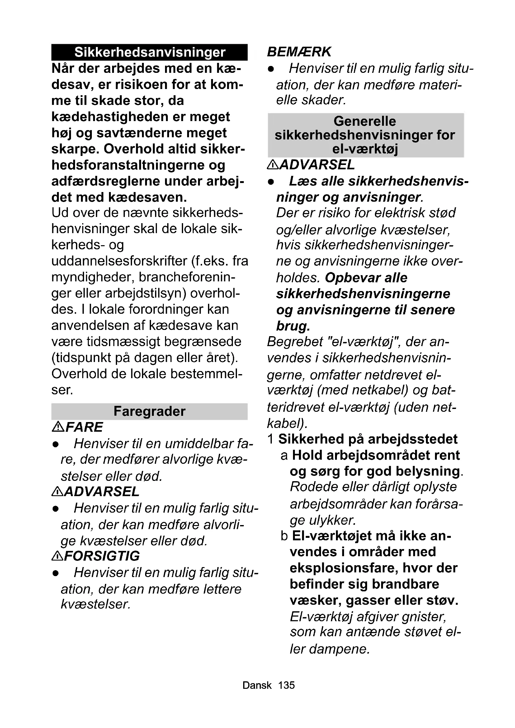- EU-overensstemmelseserklæring Dansk 135 Sikkerhedsanvisninger Når der arbejdes med en kæ- desav, er risikoen for at kom- me til skade stor, da kædehastigheden er meget høj og savtænderne meget skarpe. Overhold altid sikker- hedsforanstaltningerne og adfærdsreglerne under arbej- det med kædesaven. Ud over de nævnte sikkerheds- henvisninger skal de lokale sik- kerheds- og uddannelsesforskrifter (f.eks. fra myndigheder, brancheforenin- ger eller arbejdstilsyn) overhol- des. I lokale forordninger kan anvendelsen af kædesave kan være tidsmæssigt begrænsede (tidspunkt på dagen eller året). Overhold de lokale bestemmel- ser. Faregrader FARE ● Henviser til en umiddelbar fa- re, der medfører alvorlige kvæ- stelser eller død. 몇 ADVARSEL ● Henviser til en mulig farlig situ- ation, der kan medføre alvorli- ge kvæstelser eller død. 몇 FORSIGTIG ● Henviser til en mulig farlig situ- ation, der kan medføre lettere kvæstelser. BEMÆRK ● Henviser til en mulig farlig situ- ation, der kan medføre materi- elle skader. Generelle sikkerhedshenvisninger for el-værktøj 몇 ADVARSEL ● Læs alle sikkerhedshenvis- ninger og anvisninger. Der er risiko for elektrisk stød og/eller alvorlige kvæstelser, hvis sikkerhedshenvisninger- ne og anvisningerne ikke over- holdes. Opbevar alle sikkerhedshenvisningerne og anvisningerne til senere brug. Begrebet "el-værktøj", der an- vendes i sikkerhedshenvisnin- gerne, omfatter netdrevet el- værktøj (med netkabel) og bat- teridrevet el-værktøj (uden net- kabel). 1 Sikkerhed på arbejdsstedet a Hold arbejdsområdet rent og sørg for god belysning. Rodede eller dårligt oplyste arbejdsområder kan forårsa- ge ulykker. b El-værktøjet må ikke an- vendes i områder med eksplosionsfare, hvor der befinder sig brandbare væsker, gasser eller støv. El-værktøj afgiver gnister, som kan antænde støvet el- ler dampene.136 Dansk c Hold børn og andre perso- ner væk, mens el-værktø- jet anvendes. Du kan miste kontrollen over maskinen, hvis du bliver forstyrret. 2 Elektrisk sikkerhed a Tilslutningsstikket på el- værktøjet skal passe i stik- dåsen. Der må ikke foreta- ges nogen form for ændringer på stikket. Der må ikke anvendes adap- terstik sammen med jord- forbundet el-værktøj. Originale stik og passende stikdåser forringer risikoen for elektrisk stød. b Undgå kontakt med jord- forbundne overflader så- som rør, radiatorer, komfurer og køleskabe. Risikoen for elektrisk stød øges, hvis kroppen har jord- forbindelse. c Udsæt ikke el-værktøj for regn eller fugt. Hvis der trænger vand ind i el-værk- tøjet, øges risikoen for elek- trisk stød. d Brug ikke kablet til at løfte el-værktøjet, hænge det op eller trække stikket ud af stikdåsen. Hold kablet væk fra varme, olie, skar- pe kanter eller bevægelige dele på maskinen. Beska- digede eller snoede tilslut- ningskabler øger risikoen for elektrisk stød. e Anvend kun forlænger- kabler, der er beregnet til udendørs brug, hvis du ar- bejder med el-værktøjet i det fri. Risikoen for elektrisk stød forringes, hvis der an- vendes et forlængerkabel, der er beregnet til udendørs brug. f Anvend et HFI-relæ/FI-re- læ, hvis el-værktøjet an- vendes i fugtige omgivelser. Anvendelse af et HFI-relæ/FI-relæ forringer risikoen for elektrisk stød. 3 Personlig sikkerhed a Vær opmærksom, overvej, hvad du gør, og brug din fornuft, når du arbejder med el-værktøj. Brug ikke el-værktøj, hvis du er træt eller er påvirket af narkoti- ka, alkohol eller medicin. Et øjebliks uopmærksom- hed under arbejdet med el- værktøj kan medføre alvorli- ge kvæstelser. b Bær personligt beskyttel- sesudstyr og altid beskyt- telsesbriller. Hvis der bæres personligt beskyttel- sesudstyr, såsom støvma- ske, skridsikre sikkerhedssko, beskyttel- seshjelm eller høreværn, forringes risikoen for kvæ- stelser, afhængigt af el- værktøjets anvendelse.Dansk 137 c Undgå, at maskinen star- ter utilsigtet. Kontrollér, om el-værktøjet er slået fra, inden du tilslutter strømforsyningen og/eller batteriet, løfter det op eller bærer det. Hvis du holder fingeren på kontakten, mens du bærer el-værktøjet, eller maskinen er tændt, når strømforsyningen tilsluttes, kan det medføre ulykker. d Fjern indstillingsværktøj eller skruenøgle, inden du tænder for el-værktøjet. Et værktøj eller en nøgle, der befinder sig i roterende ma- skindele, kan medføre kvæ- stelser. e Undgå unormale kropsstil- linger. Sørg for at stå fast, og sørg altid for at have li- gevægt. Således har du bedre kontrol over el-værk- tøjet i en uventet situation. f Bær egnet tøj. Bær ikke løstsiddende tøj eller smykker. Hold hår, tøj og handsker væk fra bevæge- lige dele. Løstsiddende tøj, handsker, smykker eller langt hår kan blive grebet og trukket med af bevægelige dele. g Hvis der kan monteres støvudsugnings- og -op- samlingsanordninger, skal du sikre dig, at disse er korrekt tilsluttet og an- vendes korrekt. Fare på grund af støv kan forringes ved anvendelse af en støv- udsugning. 4 Anvendelse og håndtering af el-værktøj a Undgå at overbelaste ma- skinen. Anvend et el-værk- tøj, der passer til det pågældende arbejde. Med det passende el-værktøj ar- bejder du bedre og mere sik- kert inden for det angivne effektområde. b Brug ikke el-værktøj med defekt kontakt. Et el-værk- tøj, som ikke kan tændes el- ler slukkes, er farligt og skal repareres. c Tag stikket ud af stikdåsen og/eller fjern batteriet, in- den du foretager indstillin- ger på maskinen, skifter tilbehørsdele eller lægger maskinen til side. Disse sikkerhedsforanstaltninger forhindrer en utilsigtet start af el-værktøjet. d Opbevar el-værktøj, der ik- ke anvendes, uden for børns rækkevidde. Lad ik- ke personer anvende ma- skinen, der ikke er fortrolige med det eller ik- ke har læst disse anvisnin- ger. El-værktøj er farligt, hvis det anvendes af uerfar- ne personer.138 Dansk e Sø