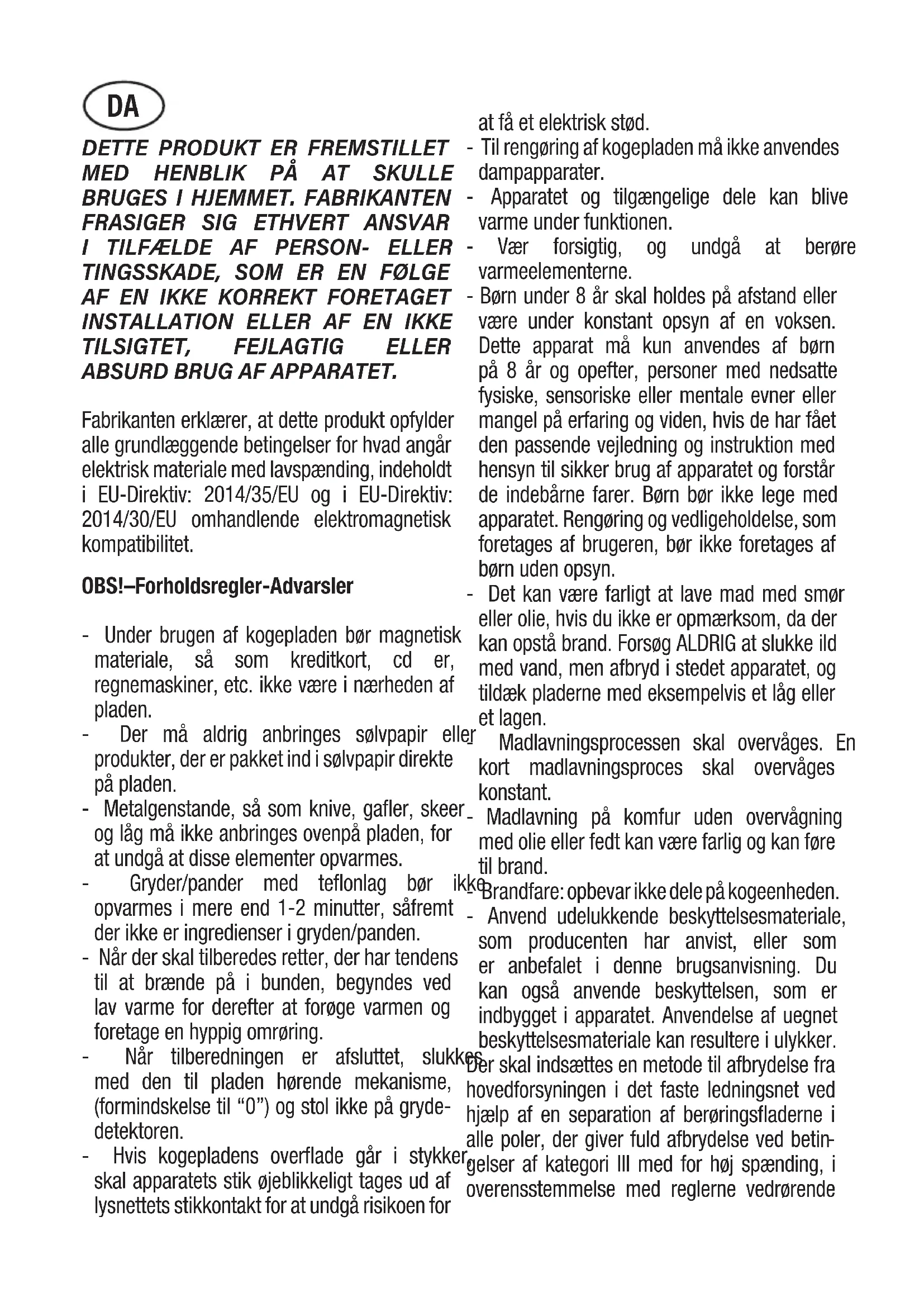 ABSURD BRUG AF APPARATET. Fabrikanten erklærer, at dette produkt opfylder alle grundlæggende betingelser for hvad angår elektrisk materiale med lavspænding, indeholdt i EU-Direktiv: 2014/35/EU og i EU-Direktiv: 2014/30/EU omhandlende elektromagnetisk kompatibilitet. OBS!–Forholdsregler-Advarsler - Under brugen af kogepladen bør magnetisk materiale, så som kreditkort, cd er, regnemaskiner, etc. ikke være i nærheden af pladen. - Der må aldrig anbringes sølvpapir eller produkter, der er pakket ind i sølvpapir direkte på pladen. - Metalgenstande, så som knive, gafler, skeer og låg må ikke anbringes ovenpå pladen, for at undgå at disse elementer opvarmes. - Gryder/pander med teflonlag bør ikke opvarmes i mere end 1-2 minutter, såfremt der ikke er ingredienser i gryden/panden. - Når der skal tilberedes retter, der har tendens til at brænde på i bunden, begyndes ved lav varme for derefter at forøge varmen og foretage en hyppig omrøring. - Når tilberedningen er afsluttet, slukkes med den til pladen hørende mekanisme, (formindskelse til “0”) og stol ikke på gryde- detektoren. - Hvis kogepladens overflade går i stykker, skal apparatets stik øjeblikkeligt tages ud af lysnettets stikkontakt for at undgå risikoen for at få et elektrisk stød. - Til rengøring af kogepladen må ikke anvendes dampapparater. - Apparatet og tilgængelige dele kan blive varme under funktionen. - Vær forsigtig, og undgå at berøre varmeelementerne. - Børn under 8 år skal holdes på afstand eller være under konstant opsyn af en voksen. Dette apparat må kun anvendes af børn på 8 år og opefter, personer med nedsatte fysiske, sensoriske eller mentale evner eller mangel på erfaring og viden, hvis de har fået den passende vejledning og instruktion med hensyn til sikker brug af apparatet og forstår de indebårne farer. Børn bør ikke lege med apparatet. Rengøring og vedligeholdelse, som foretages af brugeren, bør ikke foretages af børn uden opsyn. - Det kan være farligt at lave mad med smør eller olie, hvis du ikke er opmærksom, da der kan opstå brand. Forsøg ALDRIG at slukke ild med vand, men afbryd i stedet apparatet, og tildæk pladerne med eksempelvis et låg eller et lagen. - Madlavningsprocessen skal overvåges. En kort madlavningsproces skal overvåges konstant. - Madlavning på komfur uden overvågning med olie eller fedt kan være farlig og kan føre til brand. - Brandfare: opbevar ikke dele på kogeenheden. - Anvend udelukkende beskyttelsesmateriale, som producenten har anvist, eller som er anbefalet i denne brugsanvisning. Du kan også anvende beskyttelsen, som er indbygget i apparatet. Anvendelse af uegnet beskyttelsesmateriale kan resultere i ulykker. Der skal indsættes en metode til afbrydelse fra hovedforsyningen i det faste ledningsnet ved hjælp af en separation af berøringsfladerne i alle poler, der giver fuld afbrydelse ved betin