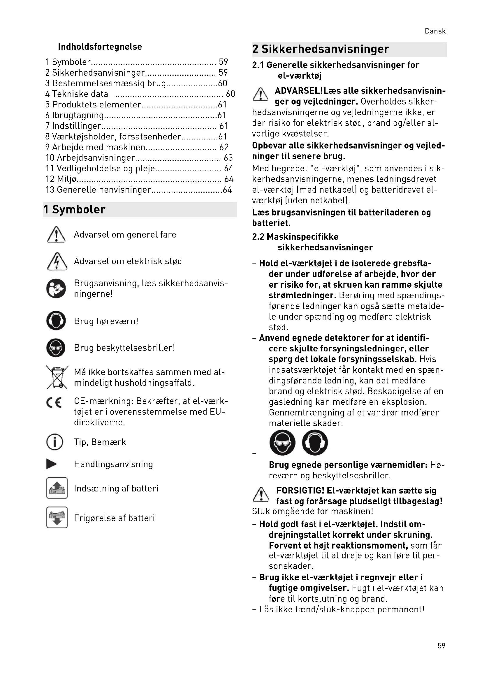 - 13 Generelle henvisninger 1 Symboler Advarsel om generel fare Advarsel om elektrisk stød Brugsanvisning, læs sikkerhedsanvis ningerne! Brug høreværn! Brug beskyttelsesbriller! Må ikke bortskaffes sammen med al mindeligt husholdningsaffald. CE-mærkning: Bekræfter, at el-værk tøjet er i overensstemmelse med EU- direktiverne. Tip, Bemærk Handlingsanvisning Indsætning af batteri Frigørelse af batteri 2 Sikkerhedsanvisninger p. 64