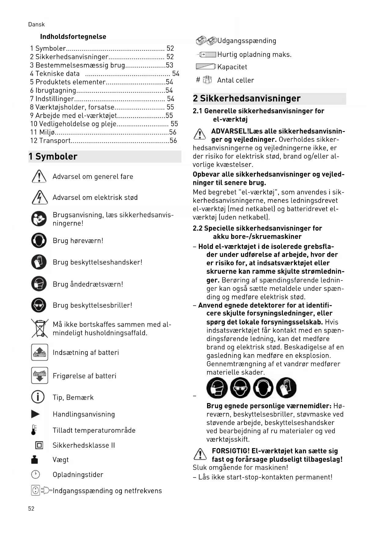 - 12 Transport 1 Symboler Advarsel om generel fare Advarsel om elektrisk stød Brugsanvisning, læs sikkerhedsanvis ningerne! Brug høreværn! Brug beskyttelseshandsker! Brug åndedrætsværn! Brug beskyttelsesbriller! Må ikke bortskaffes sammen med al mindeligt husholdningsaffald. Indsætning af batteri Frigørelse af batteri Tip, Bemærk Handlingsanvisning Tilladt temperaturområde Sikkerhedsklasse II Vægt Opladningstider Indgangsspænding og netfrekvens Udgangsspænding Hurtig opladning maks. Kapacitet p. 56