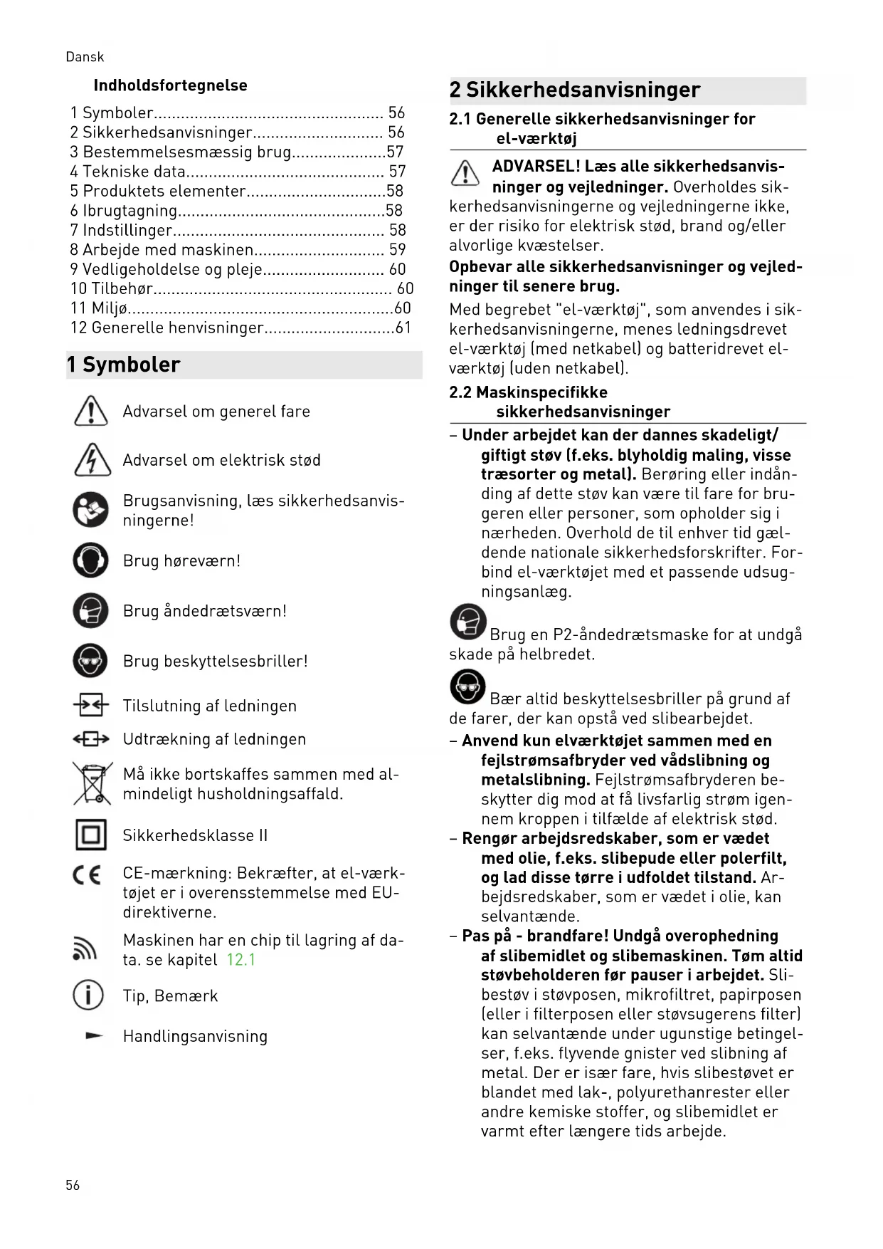 sikkerhedsanvisninger – Under arbejdet kan der dannes skadeligt/ giftigt støv (f.eks. blyholdig maling, visse træsorter og metal). Berøring eller indån ding af dette støv kan være til fare for bru geren eller personer, som opholder sig i nærheden. Overhold de til enhver tid gæl dende nationale sikkerhedsforskrifter. For bind el-værktøjet med et passende udsug ningsanlæg. Brug en P2-åndedrætsmaske for at undgå skade på helbredet. Bær altid beskyttelsesbriller på grund af de farer, der kan opstå ved slibearbejdet. – Anvend kun elværktøjet sammen med en fejlstrømsafbryder ved vådslibning og metalslibning. Fejlstrømsafbryderen be skytter dig mod at få livsfarlig strøm igen nem kroppen i tilfælde af elektrisk stød. – Rengør arbejdsredskaber, som er vædet med olie, f.eks. slibepude eller polerfilt, og lad disse tørre i udfoldet tilstand. Ar bejdsredskaber, som er vædet i olie, kan selvantænde. – Pas på - brandfare! Undgå overophedning af slibemidlet og slibemaskinen. Tøm altid støvbeholderen før pauser i arbejdet. Sli bestøv i støvposen, mikrofiltret, papirposen (eller i filterposen eller støvsugerens filter) kan selvantænde under ugunstige betingel ser, f.eks. flyvende gnister ved slibning af metal. Der er især fare, hvis slibestøvet er blandet med lak-, polyurethanrester eller andre kemiske stoffer, og slibemidlet er varmt efter længere tids arbejde. Dansk 56– Anvend kun originale Festool bagskiver. Skiver af andre mærker egner sig ikke til slibemaskinens omdrejningstal og kan brække. – Kontrollér elværktøjet og bagskiven for skader efter et fald. Afmonter bagskiven, så du kan foretage en ordentlig kontrol. Reparer beskadigede dele før ibrugtag ning. Ødelagte bagskiver og beskadigede maskiner kan medføre personskader og usikker maskindrift.
