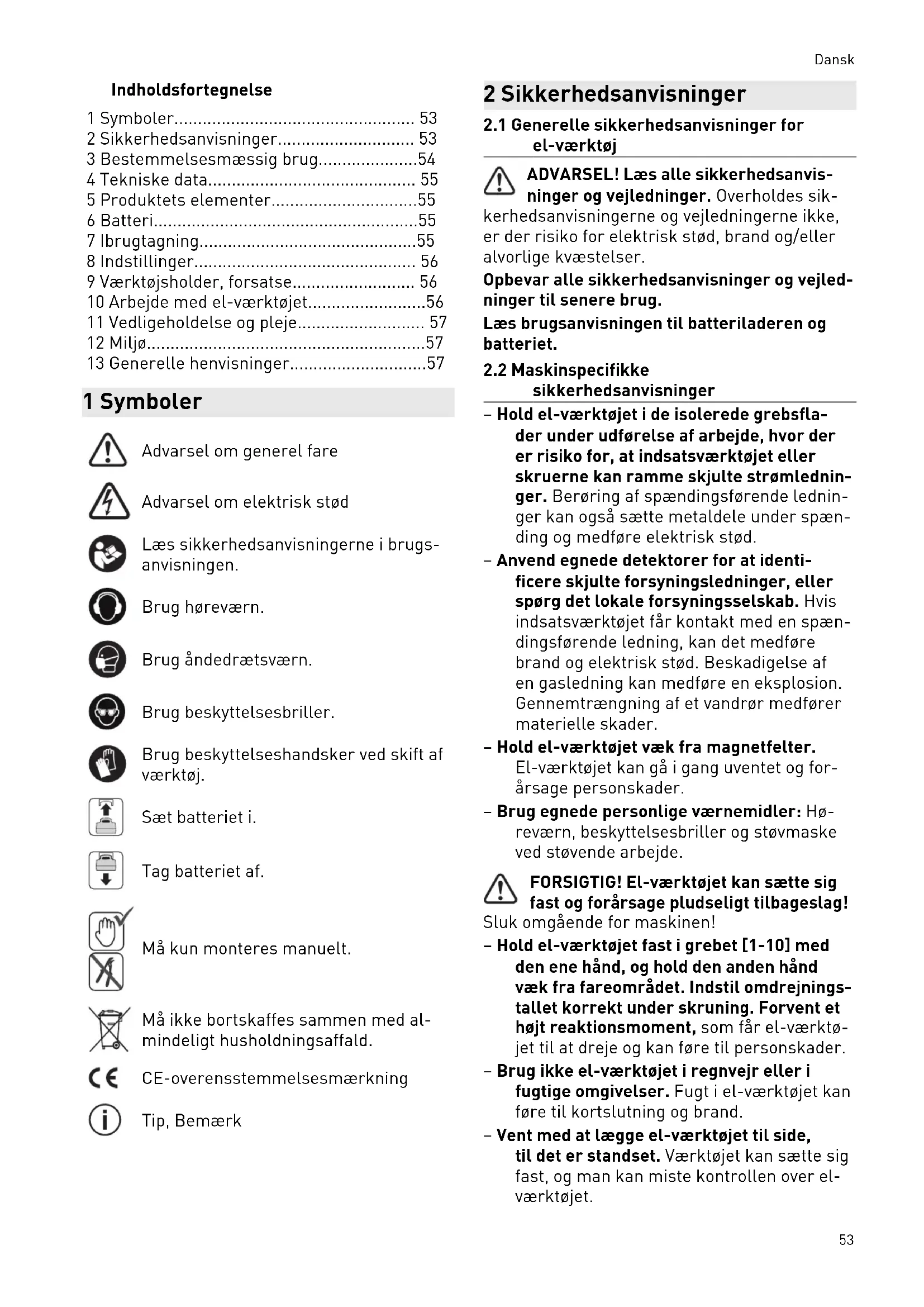 - 13 Generelle henvisninger 1 Symboler Advarsel om generel fare Advarsel om elektrisk stød Læs sikkerhedsanvisningerne i brugs anvisningen. Brug høreværn. Brug åndedrætsværn. Brug beskyttelsesbriller. Brug beskyttelseshandsker ved skift af værktøj. Sæt batteriet i. Tag batteriet af. Må kun monteres manuelt. Må ikke bortskaffes sammen med al mindeligt husholdningsaffald. CE-overensstemmelsesmærkning Tip, Bemærk 2 Sikkerhedsanvisninger p. 57