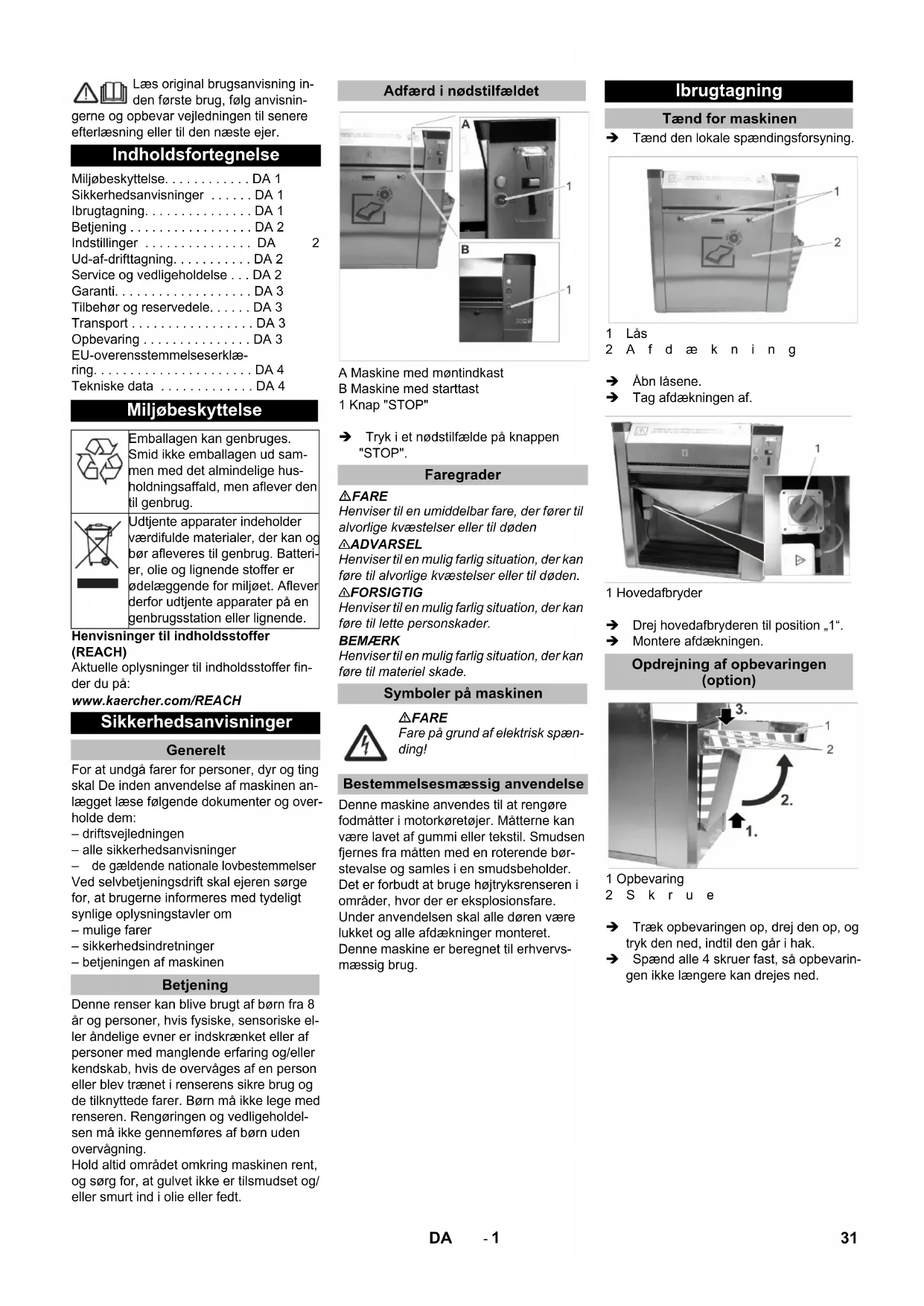 de gældende nationale lovbestemmelser Ved selvbetjeningsdrift skal ejeren sørge for, at brugerne informeres med tydeligt synlige oplysningstavler om – mulige farer – sikkerhedsindretninger – betjeningen af maskinen Denne renser kan blive brugt af børn fra 8 år og personer, hvis fysiske, sensoriske el- ler åndelige evner er indskrænket eller af personer med manglende erfaring og/eller kendskab, hvis de overvåges af en person eller blev trænet i renserens sikre brug og de tilknyttede farer. Børn må ikke lege med renseren. Rengøringen og vedligeholdel- sen må ikke gennemføres af børn uden overvågning. Hold altid området omkring maskinen rent, og sørg for, at gulvet ikke er tilsmudset og/ eller smurt ind i olie eller fedt. A Maskine med møntindkast B Maskine med starttast 1 Knap "STOP" Tryk i et nødstilfælde på knappen "STOP". FARE Henviser til en umiddelbar fare, der fører til alvorlige kvæstelser eller til døden 몇 ADVARSEL Henviser til en mulig farlig situation, der kan føre til alvorlige kvæstelser eller til døden. 몇 FORSIGTIG Henviser til en mulig farlig situation, der kan føre til lette personskader. BEMÆRK Henviser til en mulig farlig situation, der kan føre til materiel skade. Denne maskine anvendes til at rengøre fodmåtter i motorkøretøjer. Måtterne kan være lavet af gummi eller tekstil. Smudsen fjernes fra måtten med en roterende bør- stevalse og samles i en smudsbeholder. Det er forbudt at bruge højtryksrenseren i områder, hvor der er eksplosionsfare. Under anvendelsen skal alle døren være lukket og alle afdækninger monteret. Denne maskine er beregnet til erhvervs- mæssig brug. Tænd den lokale spændingsforsyning. 1Lås 2Afdækning Åbn låsene. Tag afdækningen af. 1 Hovedafbryder Drej hovedafbryderen til position „1“. Montere afdækningen. 1 Opbevaring 2Skrue Træk opbevaringen op, drej den op, og tryk den ned, indtil den går i hak. Spænd alle 4 skruer fast, så opbevarin- gen ikke længere kan drejes ned. Indholdsfortegnelse Miljøbeskyttelse. . . . . . . . . . . . DA 1 Sikkerhedsanvisninger . . . . . . DA 1 Ibrugtagning. . . . . . . . . . . . . . . DA 1 Betjening . . . . . . . . . . . . . . . . . DA 2 Indstillinger . . . . . . . . . . . . . . . DA 2 Ud-af-drifttagning. . . . . . . . . . . DA 2 Service og vedligeholdelse . . . DA 2 Garanti. . . . . . . . . . . . . . . . . . . DA 3 Tilbehør og reservedele. . . . . . DA 3 Transport . . . . . . . . . . . . . . . . . DA 3 Opbevaring . . . . . . . . . . . . . . . DA 3 EU-overensstemmelseserklæ- ring. . . . . . . . . . . . . . . . . . . . . . DA 4 Tekniske data . . . . . . . . . . . . . DA 4 Miljøbeskyttelse Emballagen kan genbruges. Smid ikke emballagen ud sam- men med det almindelige hus- holdningsaffald, men aflever den til genbrug. Udtjente apparater indeholder værdifulde materialer, der kan og bør afleveres til genbrug. Batteri- er, olie og lignende stoffer er ødelæggende for miljøet. Aflever derfor udtjente apparater på en genbrugsstation eller lignende. Sikkerhedsanvisninger Generelt Betjening Adfærd i nødstilfældet Faregrader Symboler på maskinen FARE Fare på grund af elektrisk spæn- ding! Bestemmelsesmæssig anvendelse Ibrugtagning Tænd for maskinen Opdrejning af opbevaringen (option) 31DA- 2 A Maskine med møntindkast B Maskine med starttast 1Møntsprække 2 Kontrollampe 3 Møntudkast 4 Starttast 5Måtteindtræk 6 Måtteudløb Bemærk: Hvis måtten slippes, vandrer den gennem maskinen og skubbes ud af måtteudløbet. Bemærk: Den indstillelige løbetid gælder for indkast- ningen af en af følgende mønter: – 50 eurocent – 50 britiske pence – 1 schweizerfranc – 1 polske zloty – 5 norske kroner Tag dækslet af (se “Vedligeholdelse og pleje/vedligeholdelsearbejder/aftag- ning af dækslet“). 1 Knap „PRG“ 2LED 3 3LED 1 4 Knap „P1“ 5Styring Tryk på knappen „PRG“, og hold den fast, indtil LED 3 lyser. Driftstypen indstilling er aktiveret. Bemærk: Driftstypen indstilling afsluttes, hvis der ikke blev trykket på en knap i 10 sekunder. Indstillingen begynder med en løbetid på 0 sekunder. Den maksimale løbetid er 10 minutter. Når denne indstilling er nået, blinker LED 1 hur- tigt. Tryk kot på knappen „P1“. LED 1 blinker hurtigt, og løbetiden for- øges med 5 sekunder. Tryk længe på knappen „P1“. LED 1 blinker langsomt, og løbetiden forøges med 30 sekunder. Indstil den ønskede løbetid ved at tryk- ke flere gange på knappen „P1“. Tryk på knappen „PRG“, indtil LED 3 blinker hurtigt, for at bekræfte den ind- stillede løbetid: Løbetiden er gemt. Sæt hovedafbryderen "0". FARE Fare for tilskadekomst på grund af utilsigtet startende maskine og på grund af elektrisk stød. Drej hovedafbryderen væk fra „0“, og sørg for at sikre den mod at tilkoblet igen, før alle vedligeholdelses- og pleje- arbejder påbegyndes. Ved maskine med møntindkast: Tøm møntkassetten (se "Vedligeholdelses- arbejder"). Tøm smudsbeholderen (se „Vedlige- holdelsesarbejder“). Kontrollér maskinen generelt. Reparér beskadigede dele. Fjern smuds på måtteudløbet. Rengør maskinen. Smør låsene med krybeolie (Caramba, WD 40) schmieren. Udskift børsten (se „Vedligeholdelses- arbejder“). 1Dør 2Lås 3Møntkasette Åbn døren. Træk møntkassetten ud, og tøm den. 1Lås 2Afdækning Åbn låsene. Tag afdækningen af.